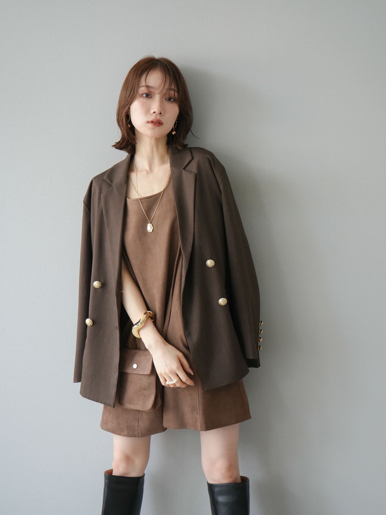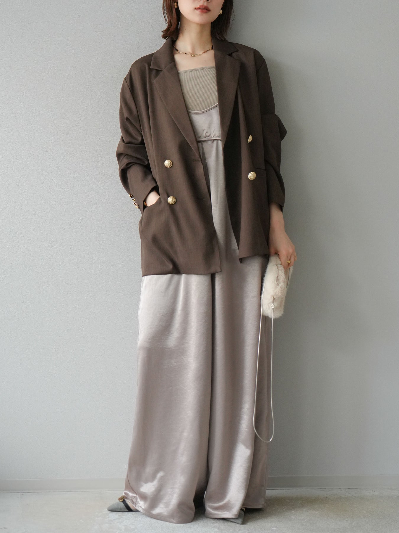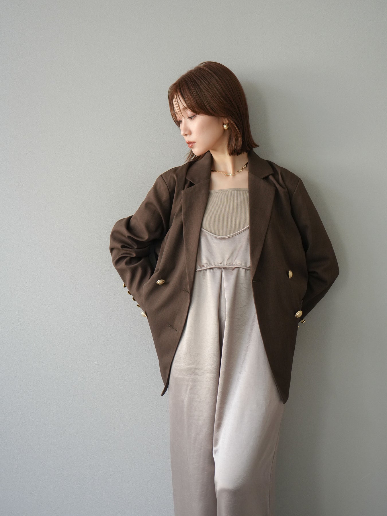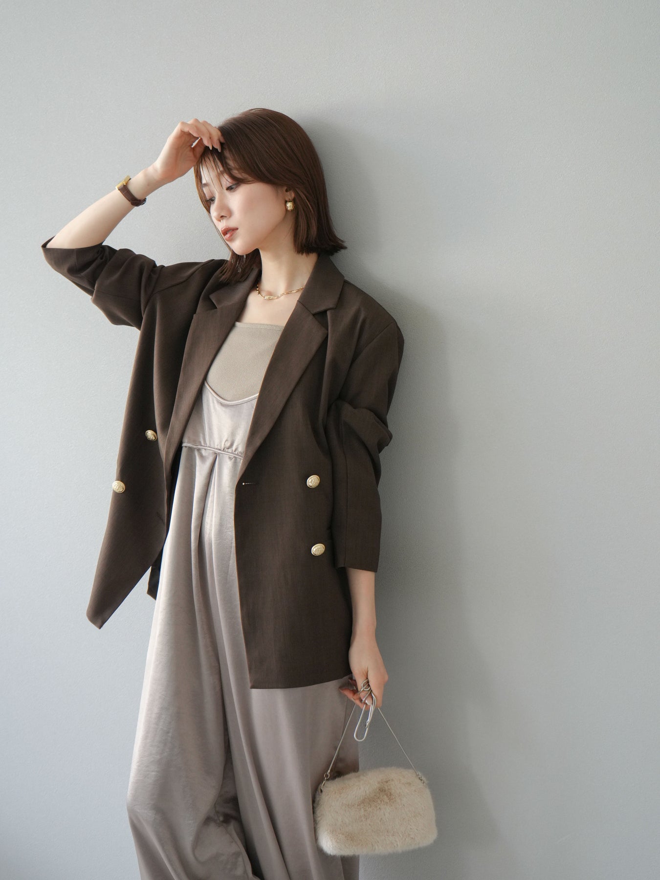 光沢を抑えた上品なツイル素材を使用したダブルテーラードジャケット。フロントに配したゴールドボタンがクラシカルなアクセントとなり、シンプルな着こなしも格上げしてくれる一枚です。程よくゆとりのあるシルエットで、羽織るだけで抜け感を演出。オンオフ問わず使いやすく、パンツと合わせればマニッシュに、ワンピースやスカートに羽織れば女性らしいバランスに仕上がります。デイリーからオケージョンまで幅広く対応できる万能ジャケットです。 ※ボトムス、キャミソール(インナー)以外の商品は一律でインナーは付属していません。
