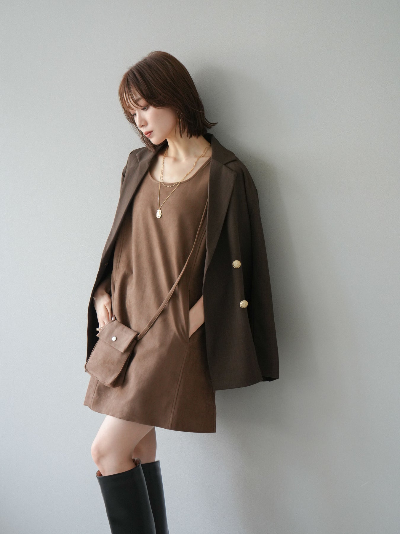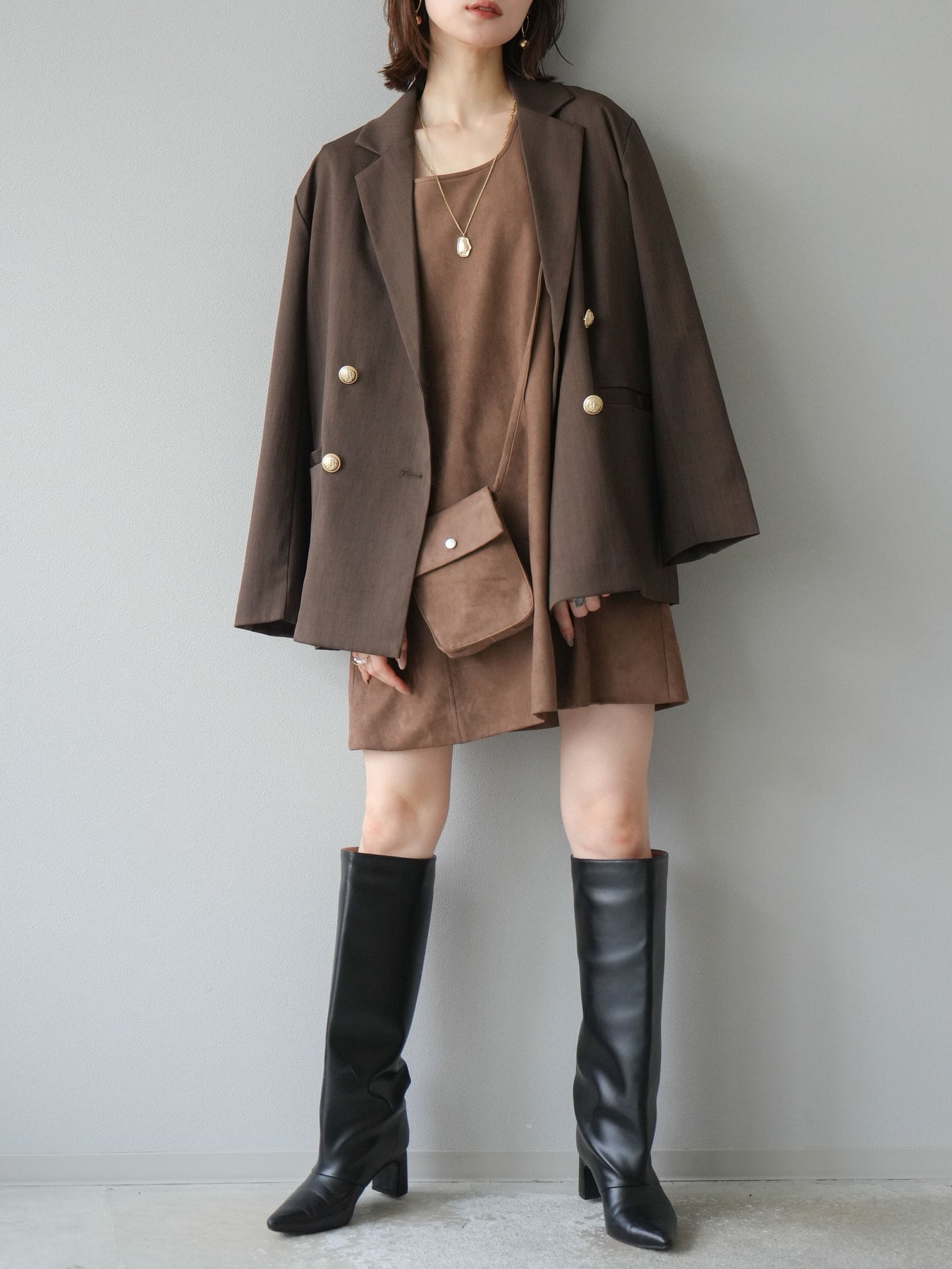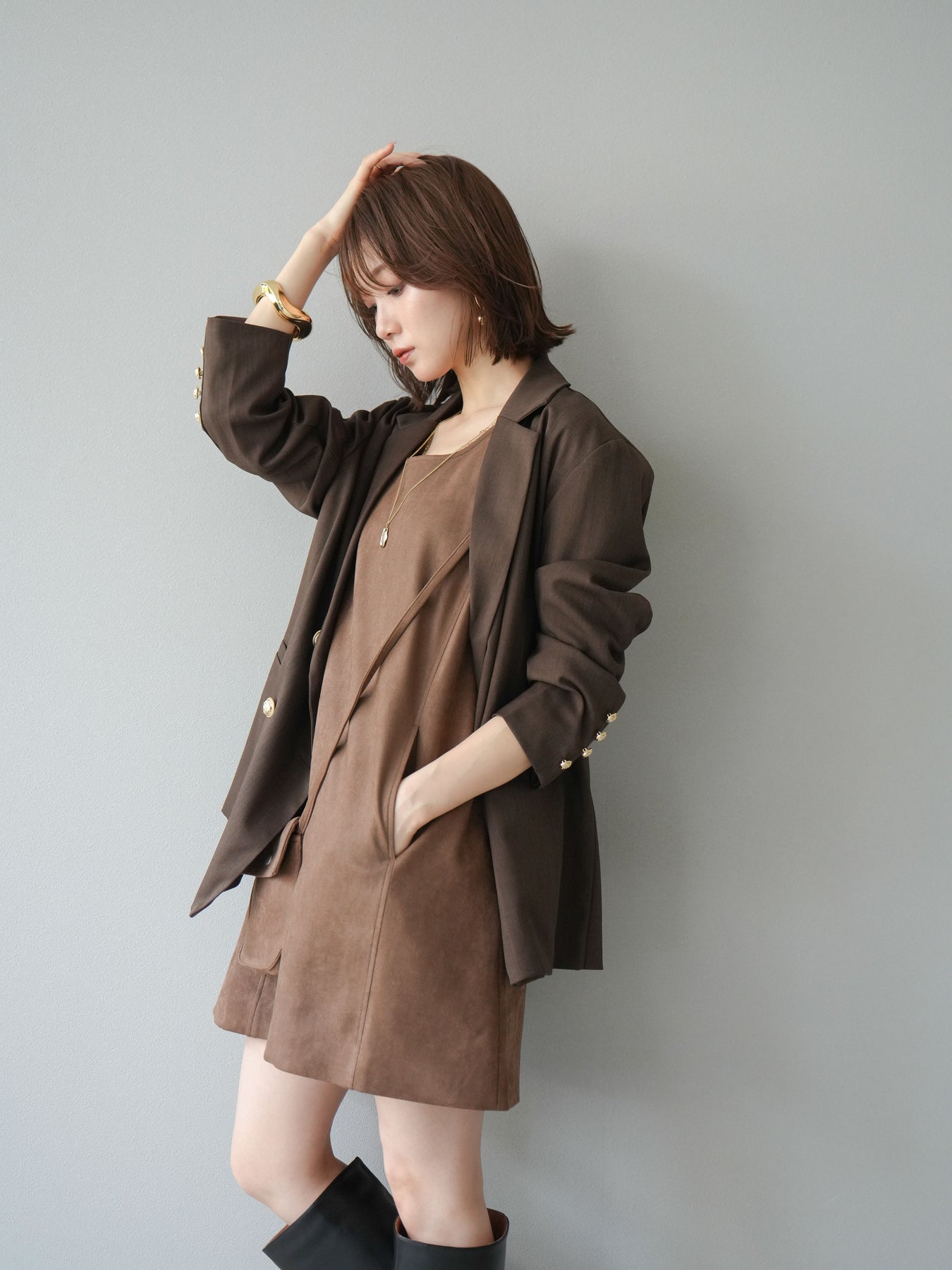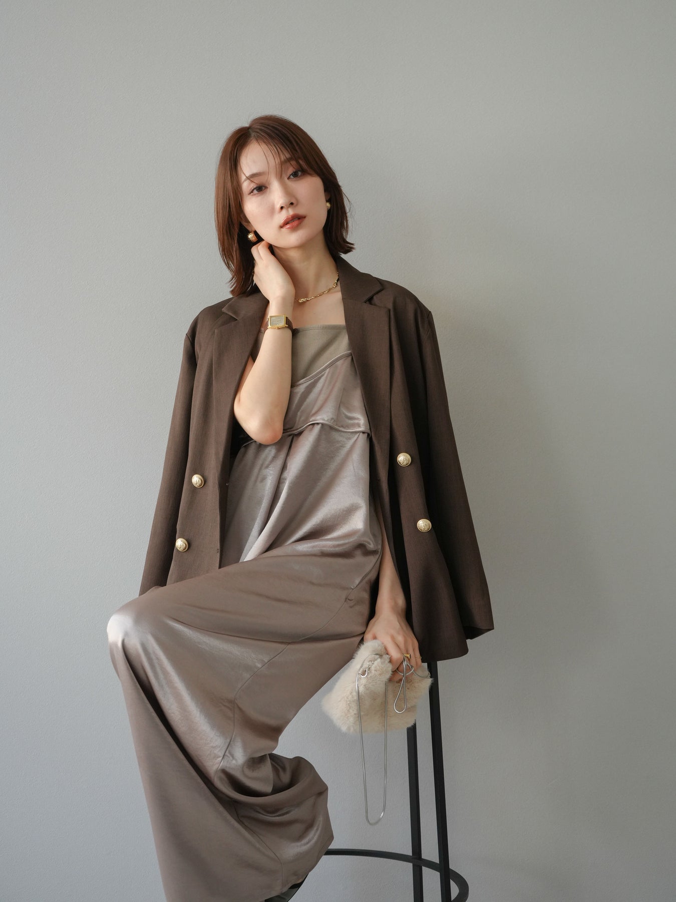 光沢を抑えた上品なツイル素材を使用したダブルテーラードジャケット。フロントに配したゴールドボタンがクラシカルなアクセントとなり、シンプルな着こなしも格上げしてくれる一枚です。程よくゆとりのあるシルエットで、羽織るだけで抜け感を演出。オンオフ問わず使いやすく、パンツと合わせればマニッシュに、ワンピースやスカートに羽織れば女性らしいバランスに仕上がります。デイリーからオケージョンまで幅広く対応できる万能ジャケットです。 ※ボトムス、キャミソール(インナー)以外の商品は一律でインナーは付属していません。