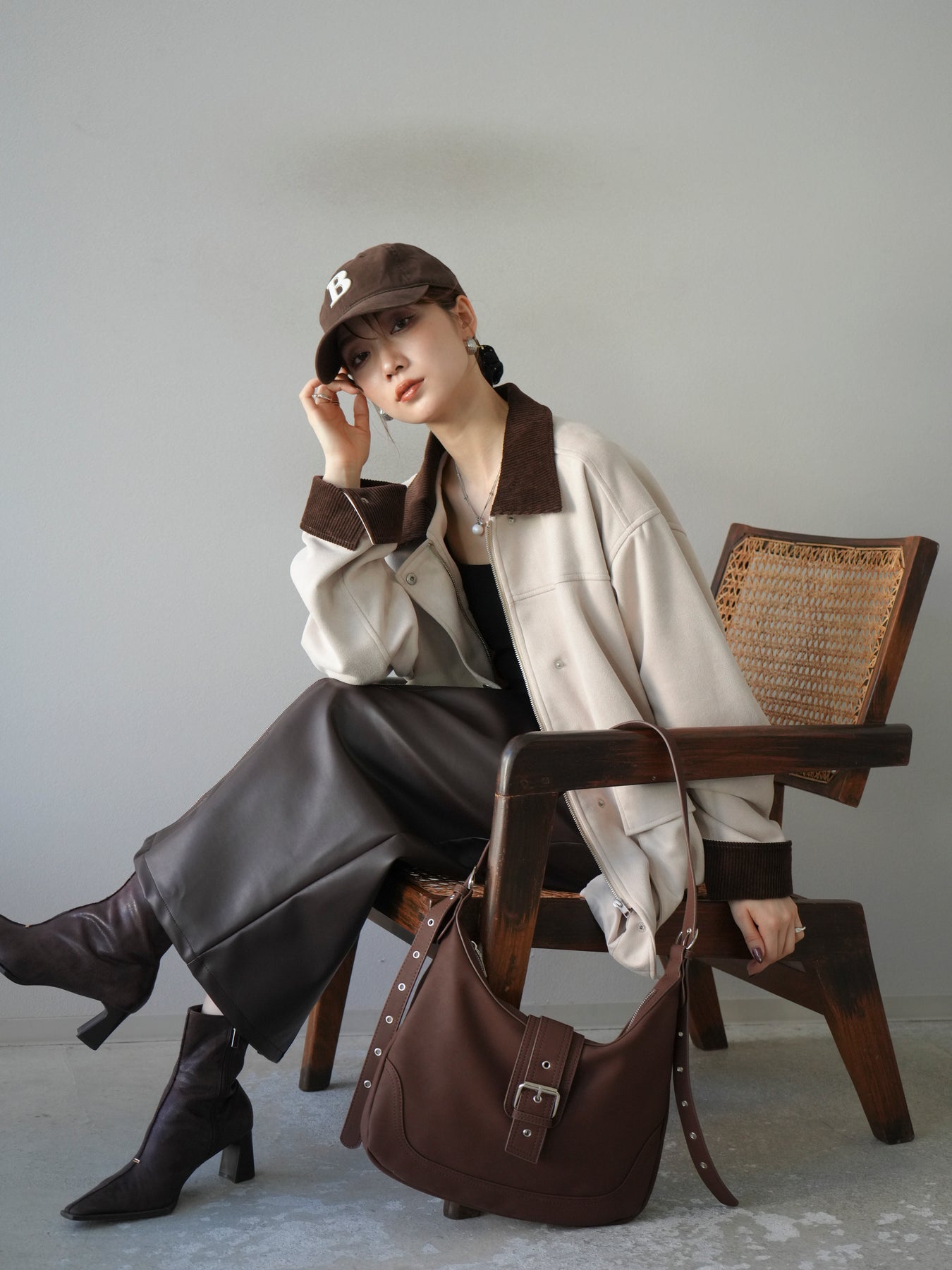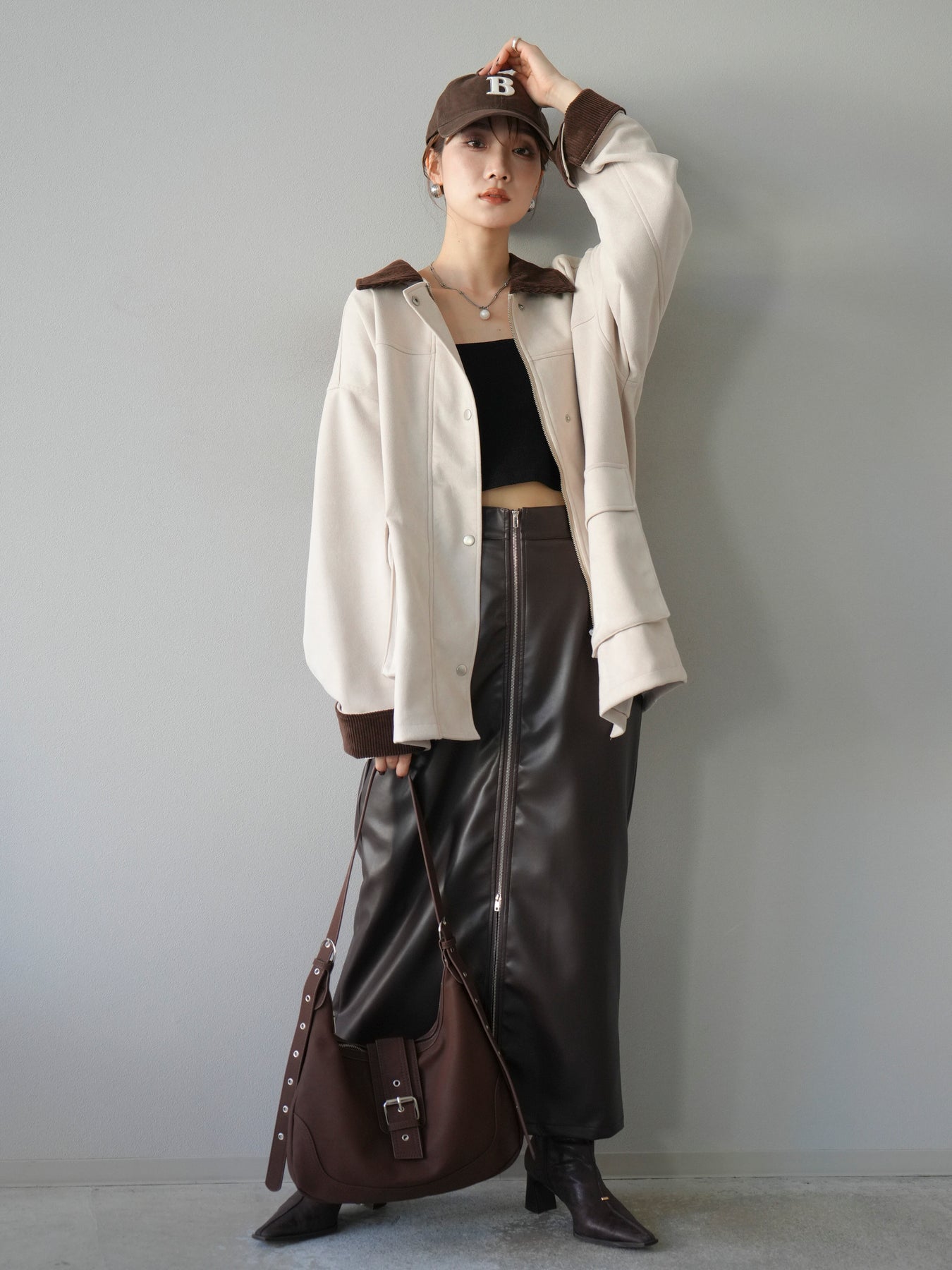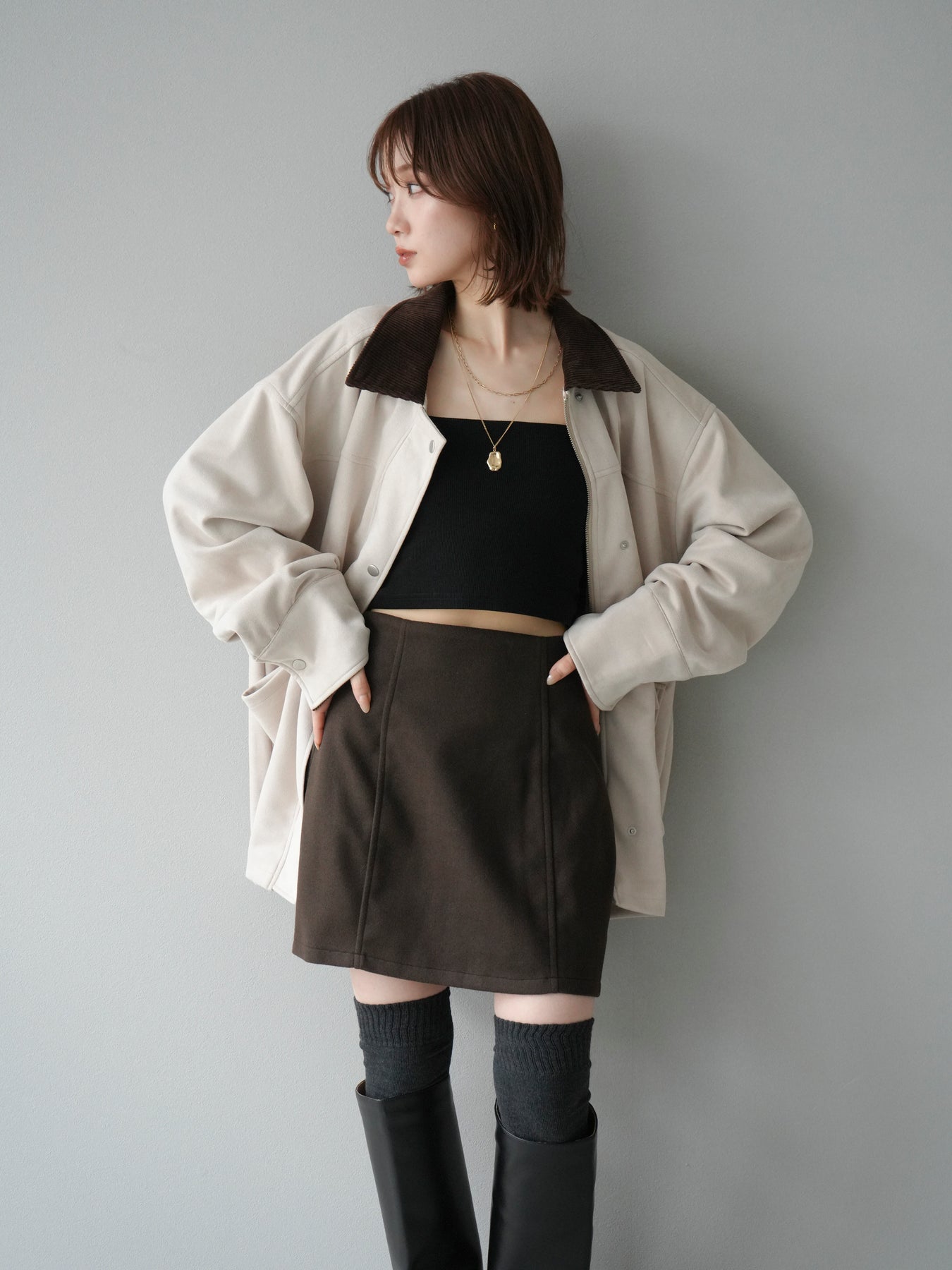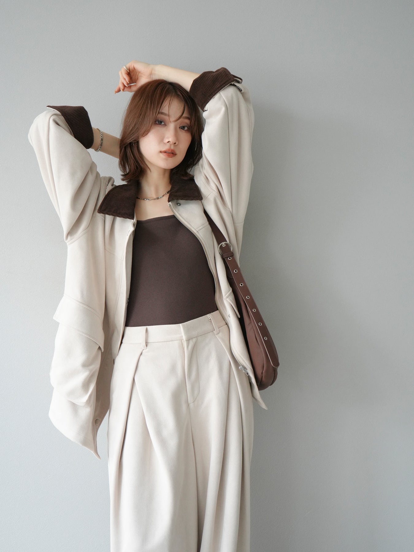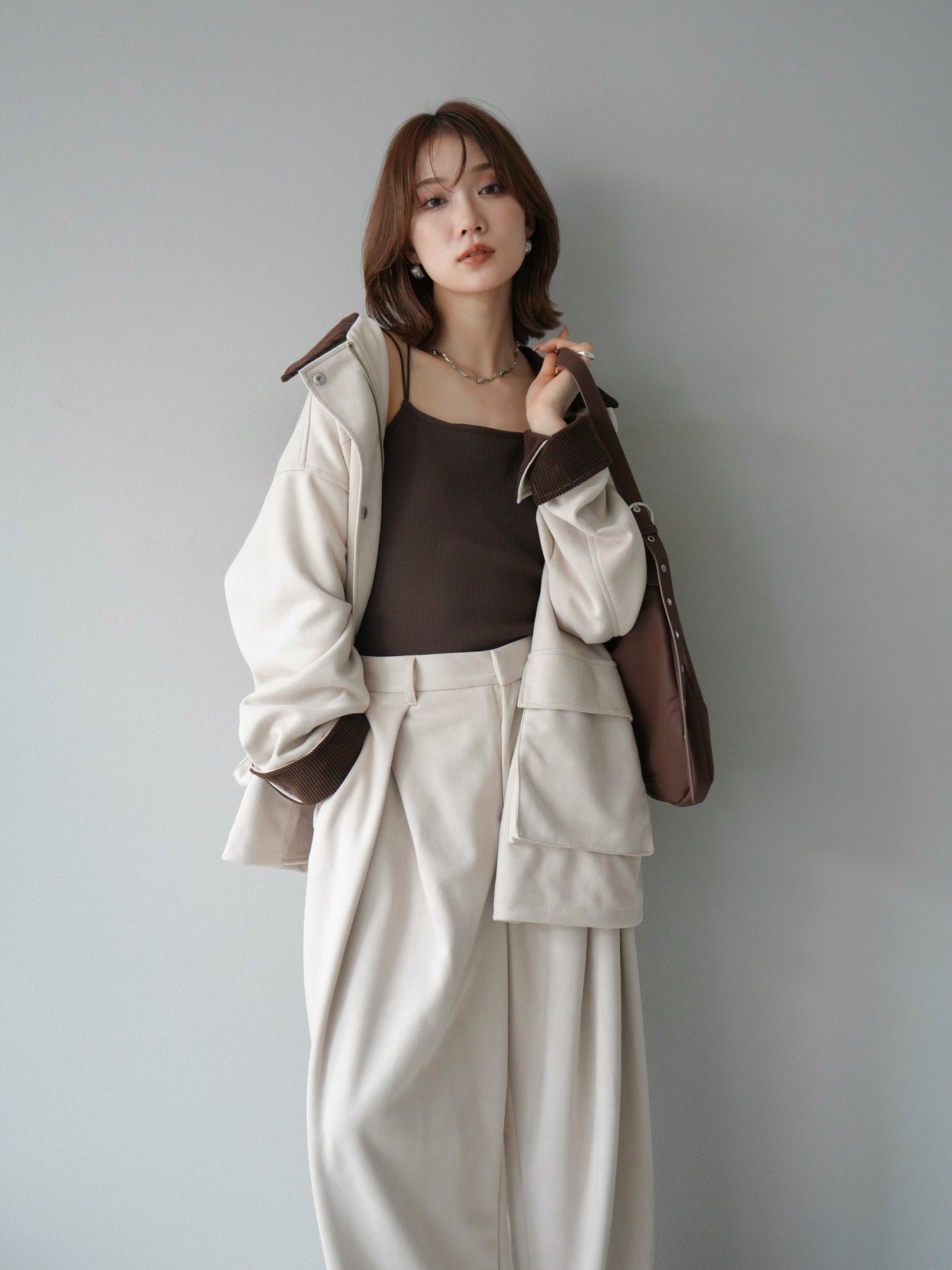 滑らかなスウェード調素材にコーデュロイ襟を組み合わせた、存在感のあるミドルジャケット。異素材のコントラストがシーズンムードを引き立て、羽織るだけでこなれ感を演出します。程よくゆとりのあるシルエットで重ね着しやすく、デイリーからお出かけシーンまで幅広く活躍。大きめのフロントポケットやカフス部分の切り替えなど、細部にまでこだわったデザインが魅力です。シンプルなスタイリングにプラスするだけで、着映えする主役アイテムになります。 ※ボトムス、キャミソール(インナー)以外の商品は一律でインナーは付属していません。
