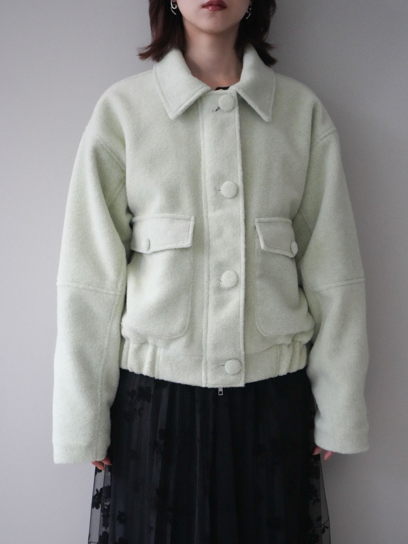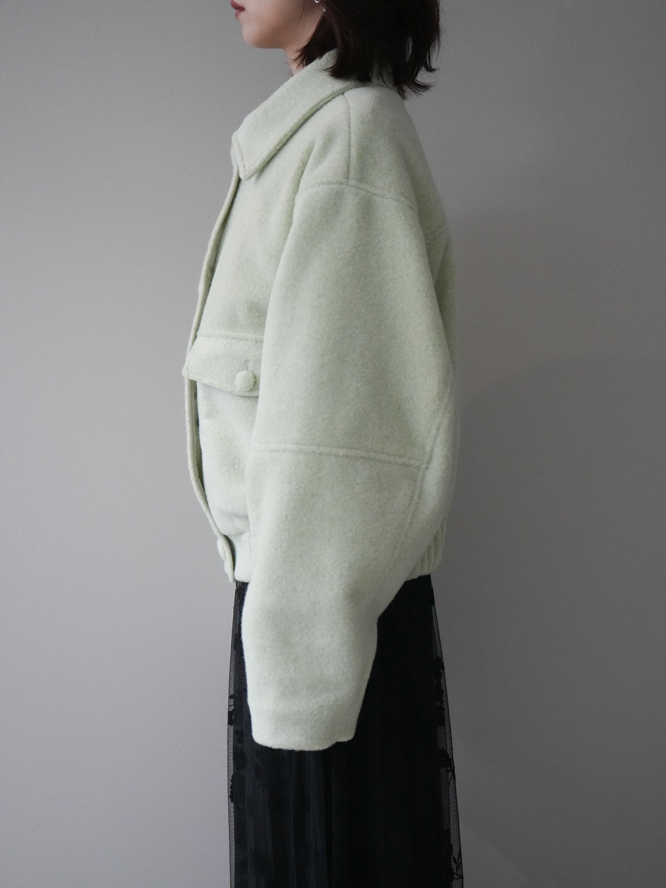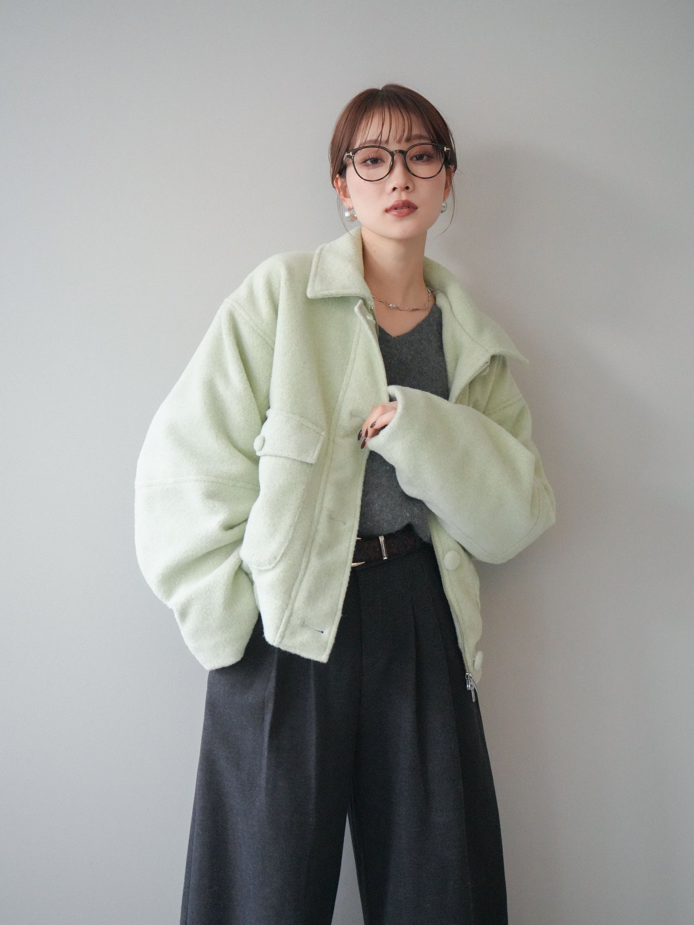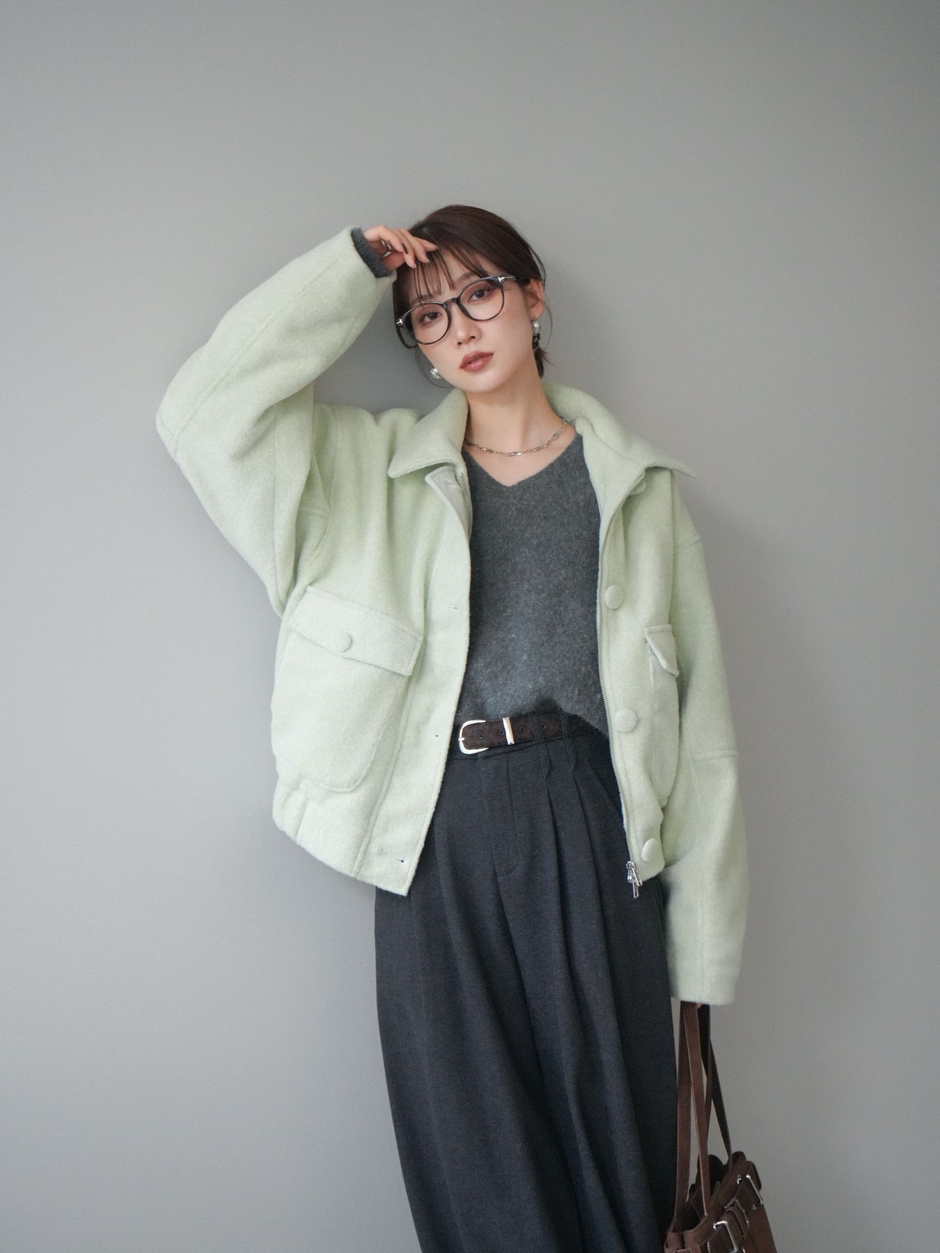 ウールのような柔らかな質感と温かみのある風合いが魅力のフライトジャケット。コンパクトな丈感と程よいボリュームスリーブがバランスよく、女性らしいシルエットを引き立てます。大きめのフラップポケットや包みボタンがアクセントとなり、シンプルながら存在感のある一枚に。ゆったりとしたサイズ感でニットの上からも羽織りやすく、カジュアルからきれいめまで幅広いスタイリングにマッチします。季節の始まりから冬本番まで活躍する万能アウターです。 ※ボトムス、キャミソール(インナー)以外の商品は一律でインナーは付属していません。