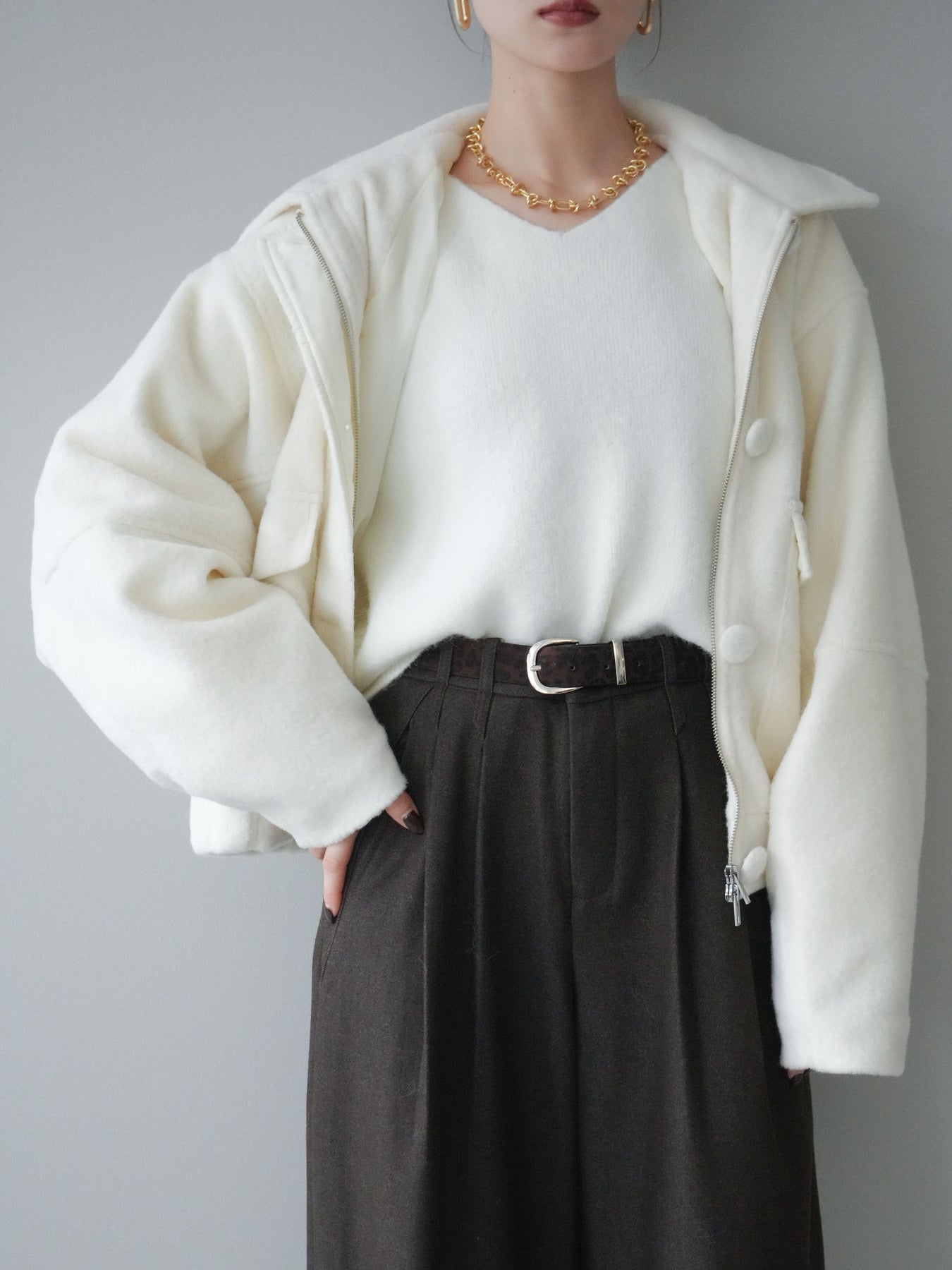 ウールのような柔らかな質感と温かみのある風合いが魅力のフライトジャケット。コンパクトな丈感と程よいボリュームスリーブがバランスよく、女性らしいシルエットを引き立てます。大きめのフラップポケットや包みボタンがアクセントとなり、シンプルながら存在感のある一枚に。ゆったりとしたサイズ感でニットの上からも羽織りやすく、カジュアルからきれいめまで幅広いスタイリングにマッチします。季節の始まりから冬本番まで活躍する万能アウターです。 ※ボトムス、キャミソール(インナー)以外の商品は一律でインナーは付属していません。