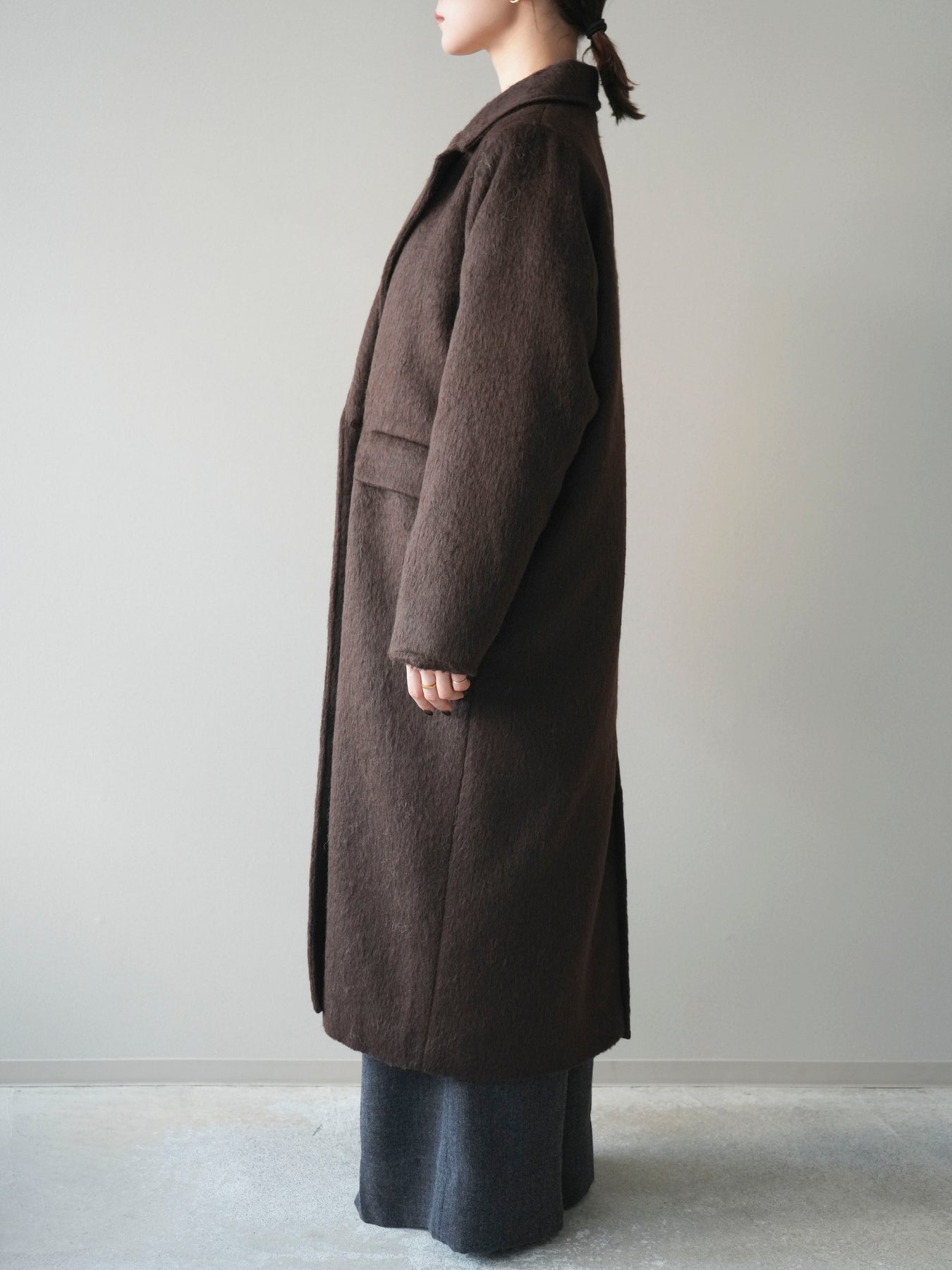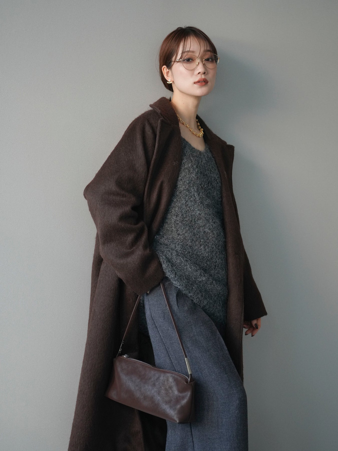 柔らかなシャギー素材を贅沢に使用したチェスターコート。ほどよく毛足のある質感が上品な奥行きを生み、羽織るだけでシーズンムードを高めてくれます。すっきりとしたラインで仕立てられており、重く見えがちなロング丈でもバランスよく着こなせるのが魅力。シンプルなデザインながら、立体感のある素材が存在感をプラスし、カジュアルからきれいめまで幅広いコーディネートにマッチします。オンオフ問わず活躍し、長く愛用できる一着です。 ※ボトムス、キャミソール(インナー)以外の商品は一律でインナーは付属していません。