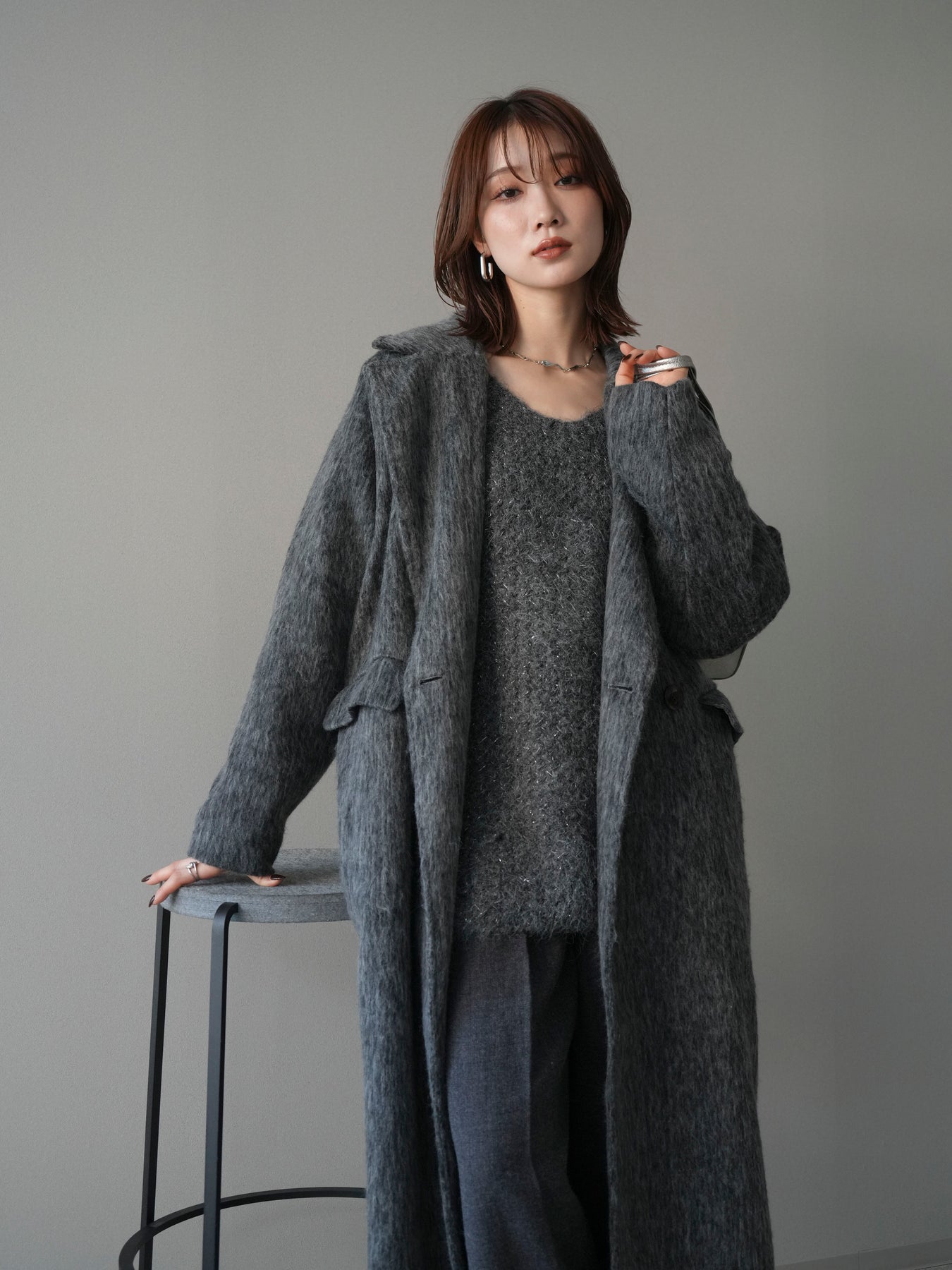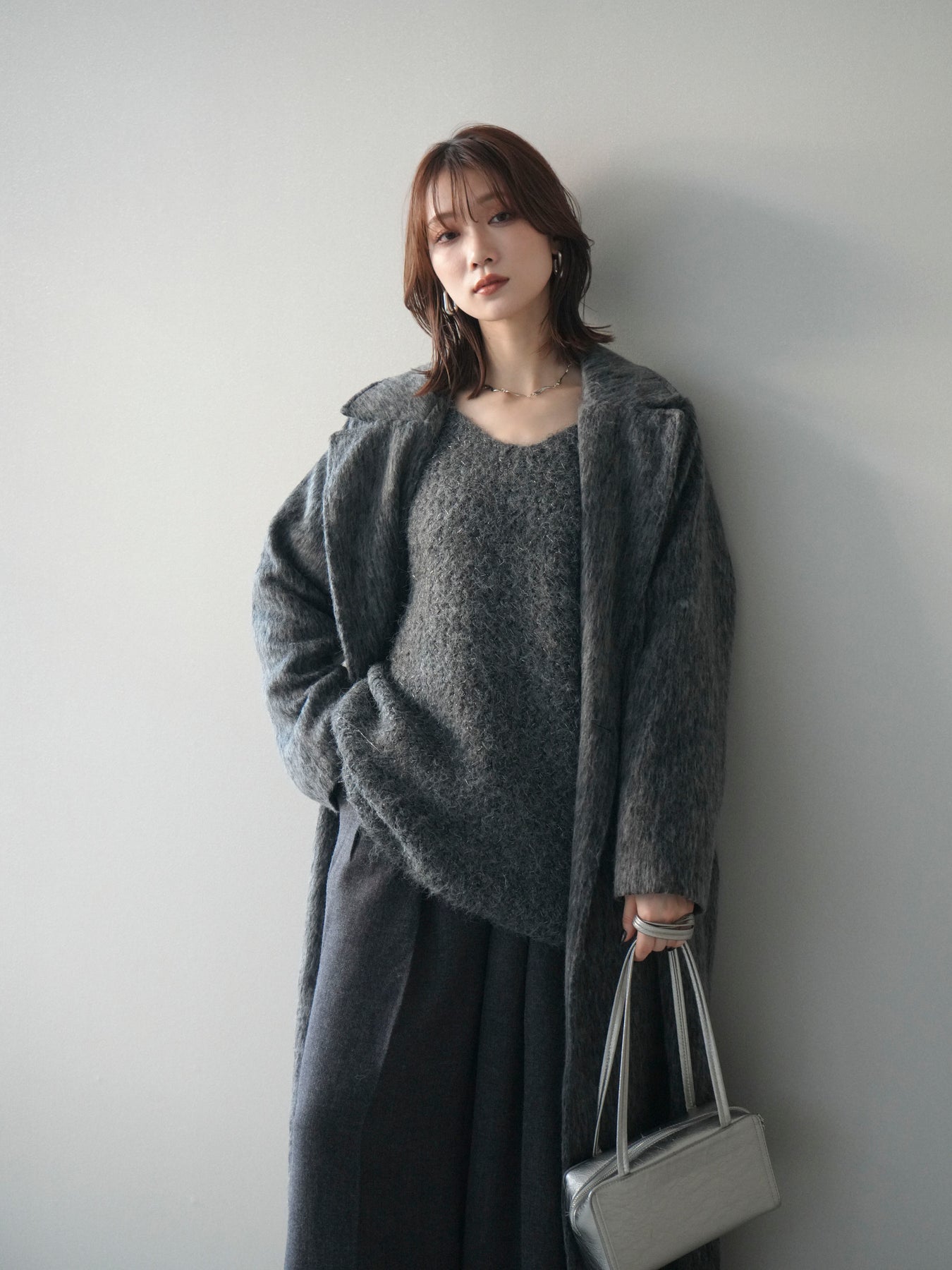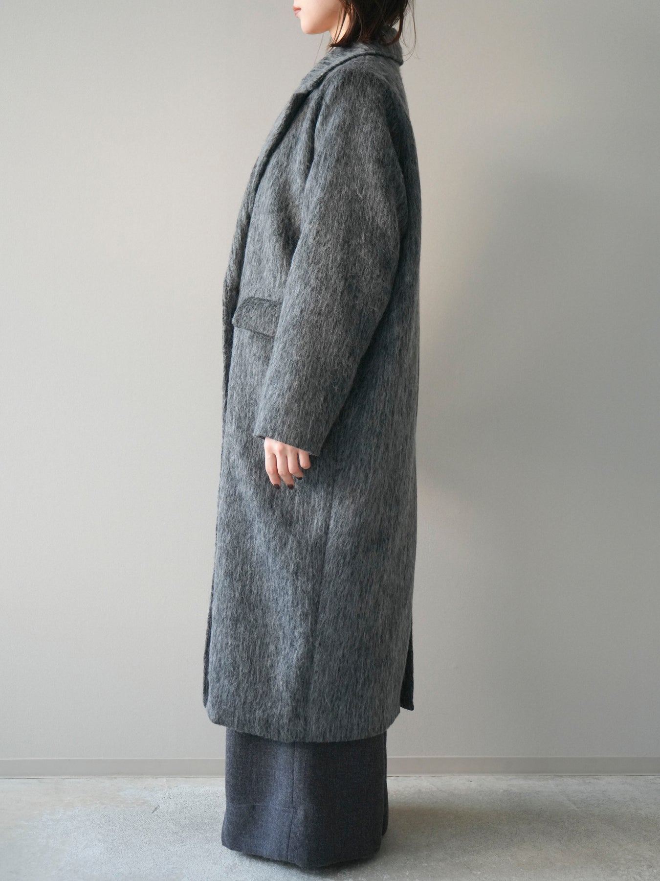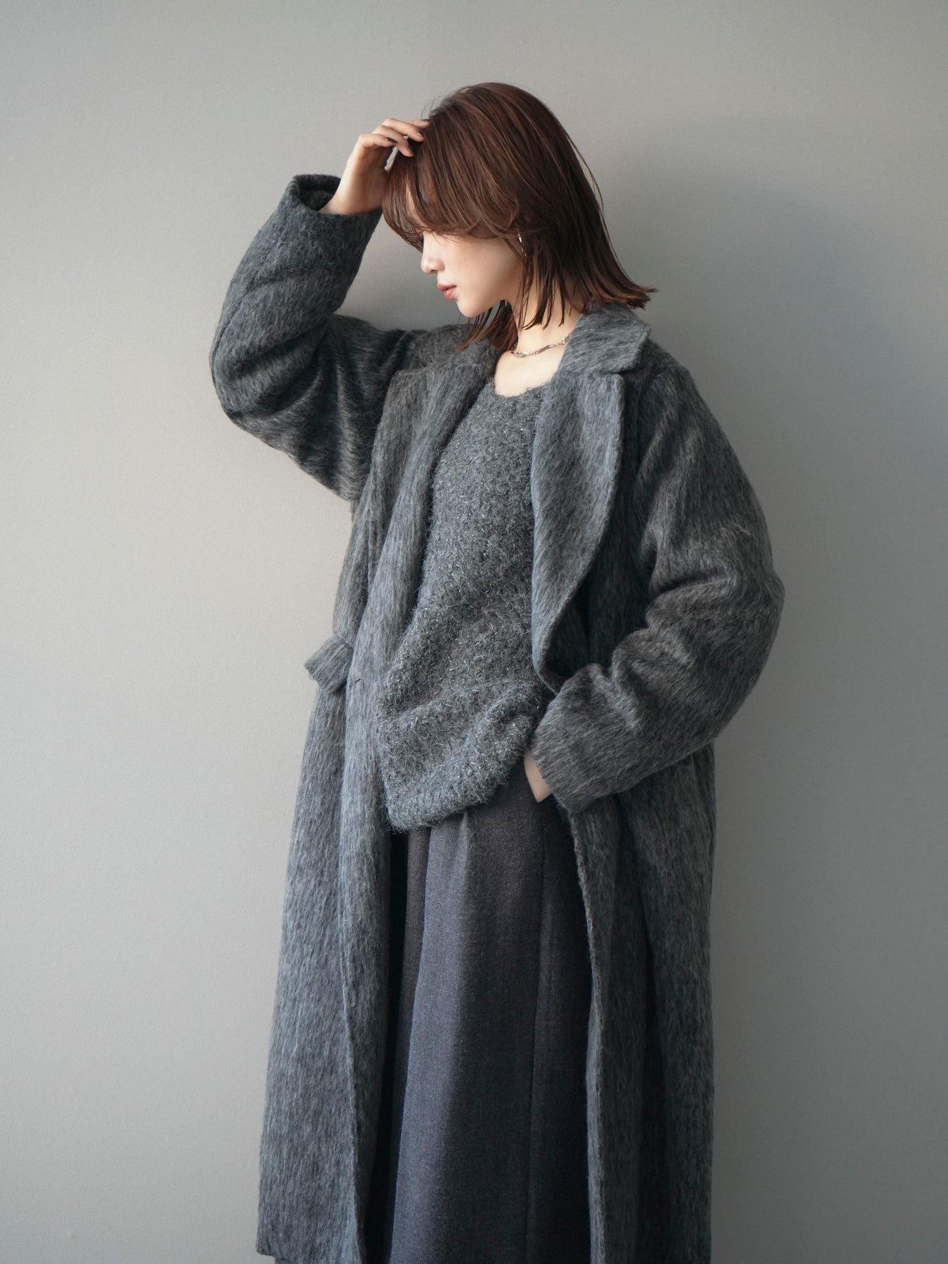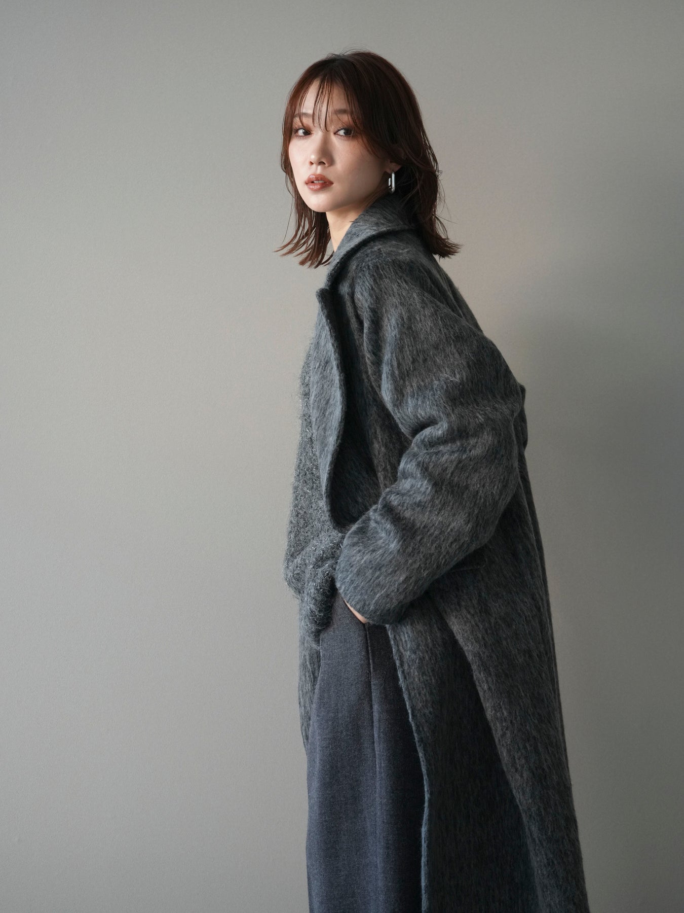柔らかなシャギー素材を贅沢に使用したチェスターコート。ほどよく毛足のある質感が上品な奥行きを生み、羽織るだけでシーズンムードを高めてくれます。すっきりとしたラインで仕立てられており、重く見えがちなロング丈でもバランスよく着こなせるのが魅力。シンプルなデザインながら、立体感のある素材が存在感をプラスし、カジュアルからきれいめまで幅広いコーディネートにマッチします。オンオフ問わず活躍し、長く愛用できる一着です。 ※ボトムス、キャミソール(インナー)以外の商品は一律でインナーは付属していません。