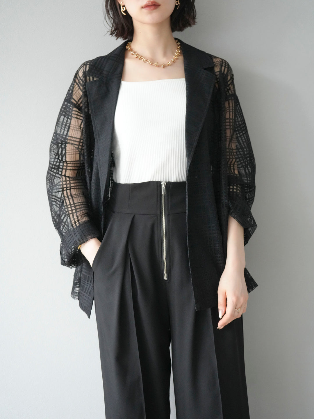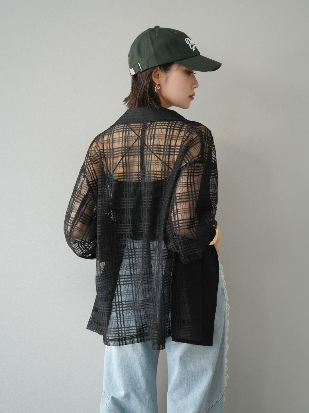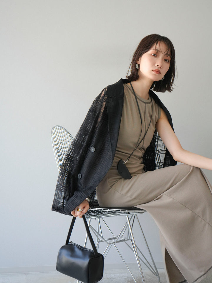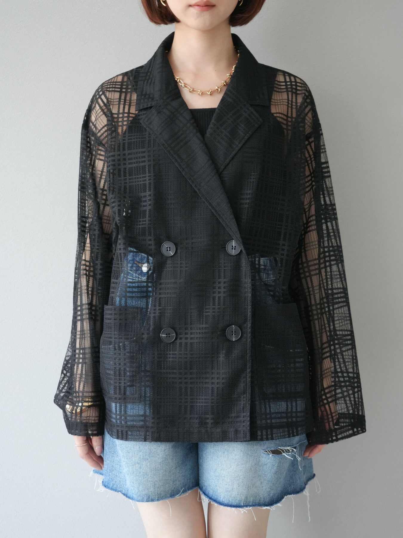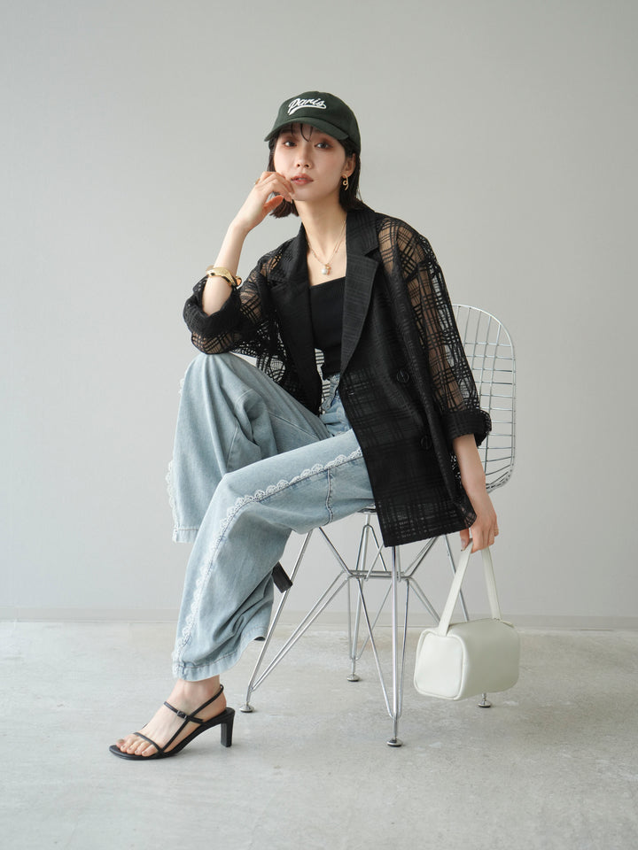 透け感のあるチュール素材にチェック柄をあしらった、軽やかで涼しげな印象のジャケット。程よいオーバーサイズとドロップショルダーが抜け感を演出し、こなれたスタイリングに仕上がります。インナーやボトムスとのレイヤードを楽しめるデザインで、春夏の羽織りとしてぴったり。Tシャツやタンクトップの上からさらっと羽織るだけで、スタイルに奥行きを与えてくれる一着です。デイリーからリゾートシーンまで、幅広く活躍します。 ※ボトムス、キャミソール(インナー)以外の商品は一律でインナーは付属していません。
