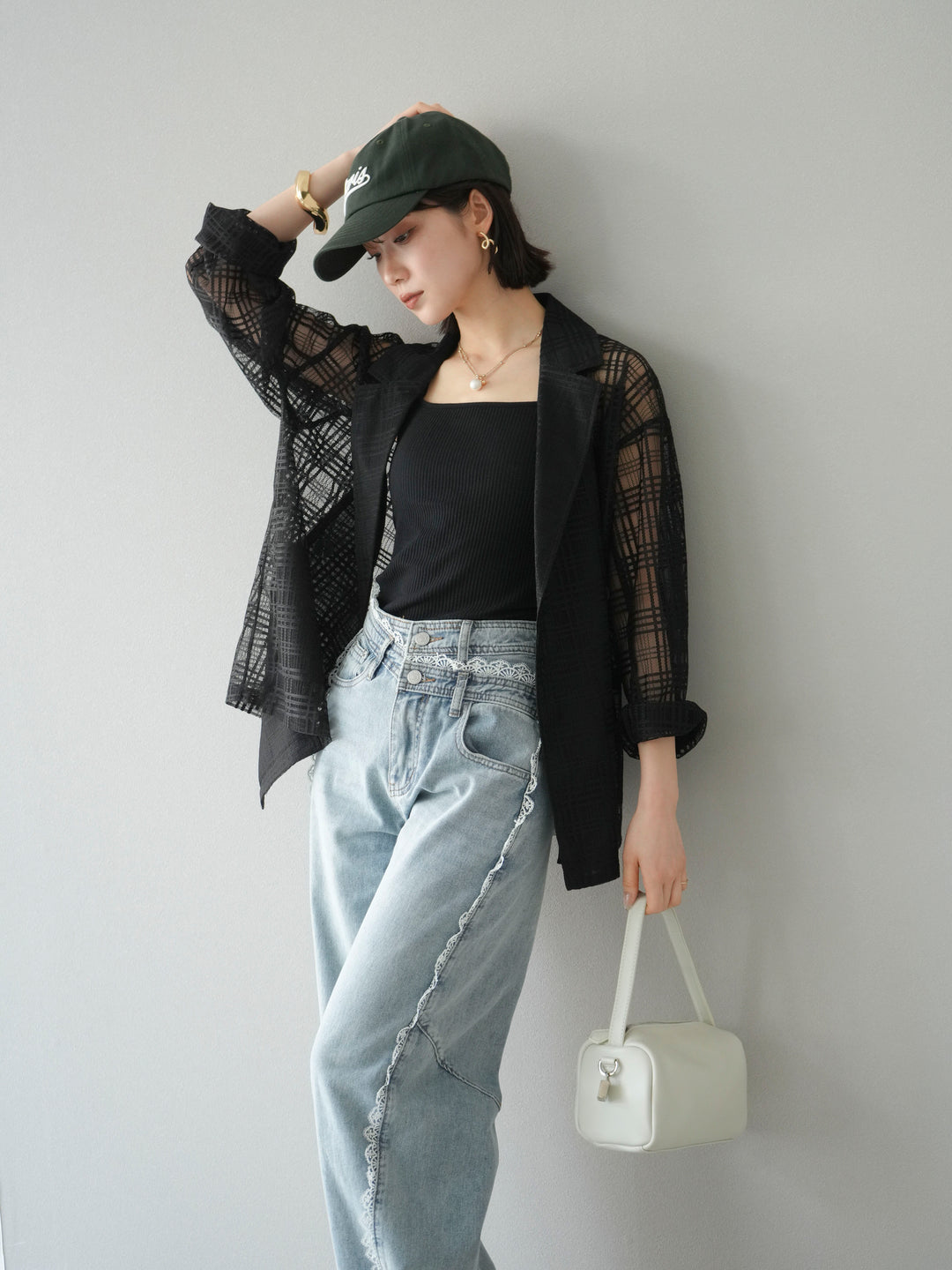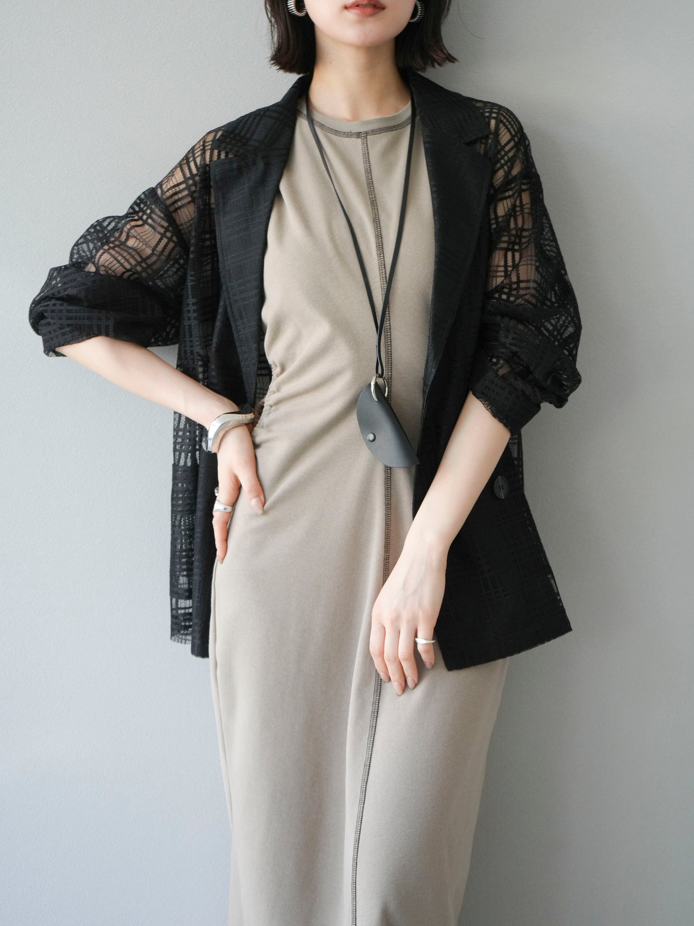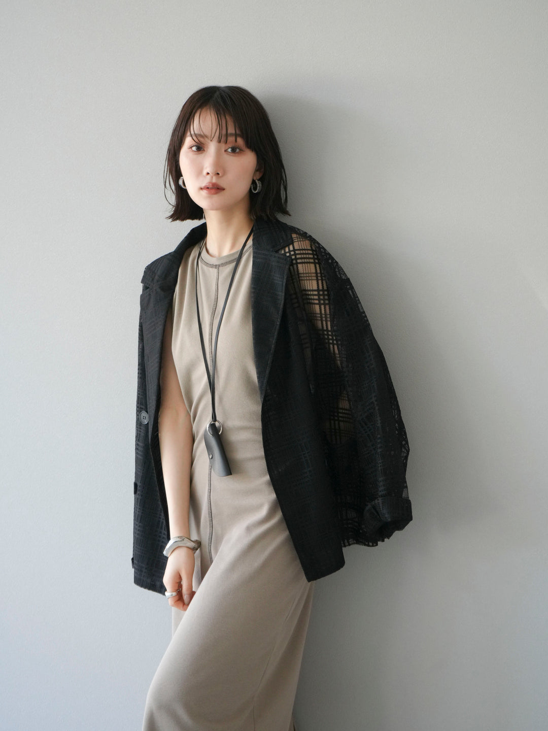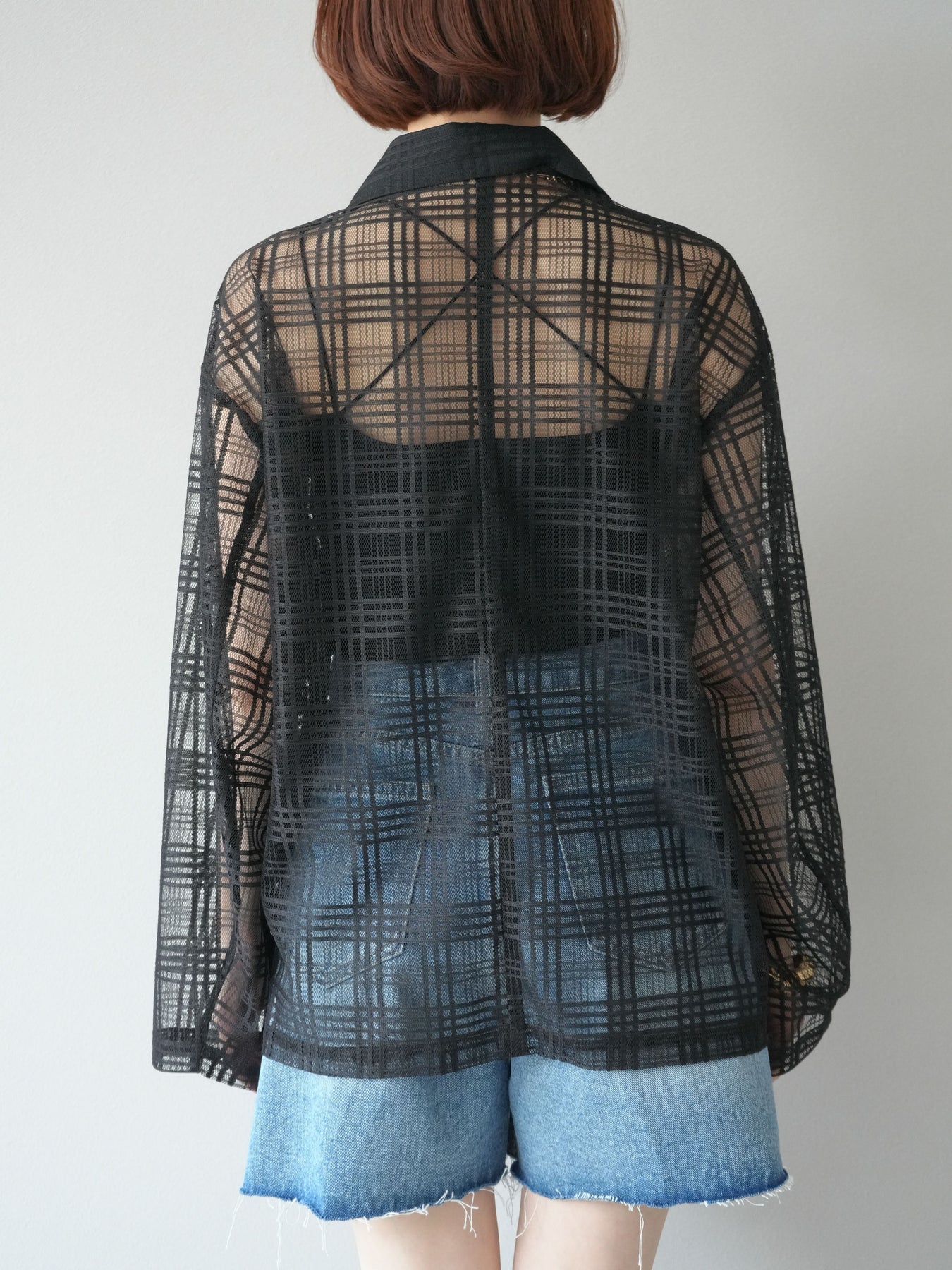 透け感のあるチュール素材にチェック柄をあしらった、軽やかで涼しげな印象のジャケット。程よいオーバーサイズとドロップショルダーが抜け感を演出し、こなれたスタイリングに仕上がります。インナーやボトムスとのレイヤードを楽しめるデザインで、春夏の羽織りとしてぴったり。Tシャツやタンクトップの上からさらっと羽織るだけで、スタイルに奥行きを与えてくれる一着です。デイリーからリゾートシーンまで、幅広く活躍します。 ※ボトムス、キャミソール(インナー)以外の商品は一律でインナーは付属していません。