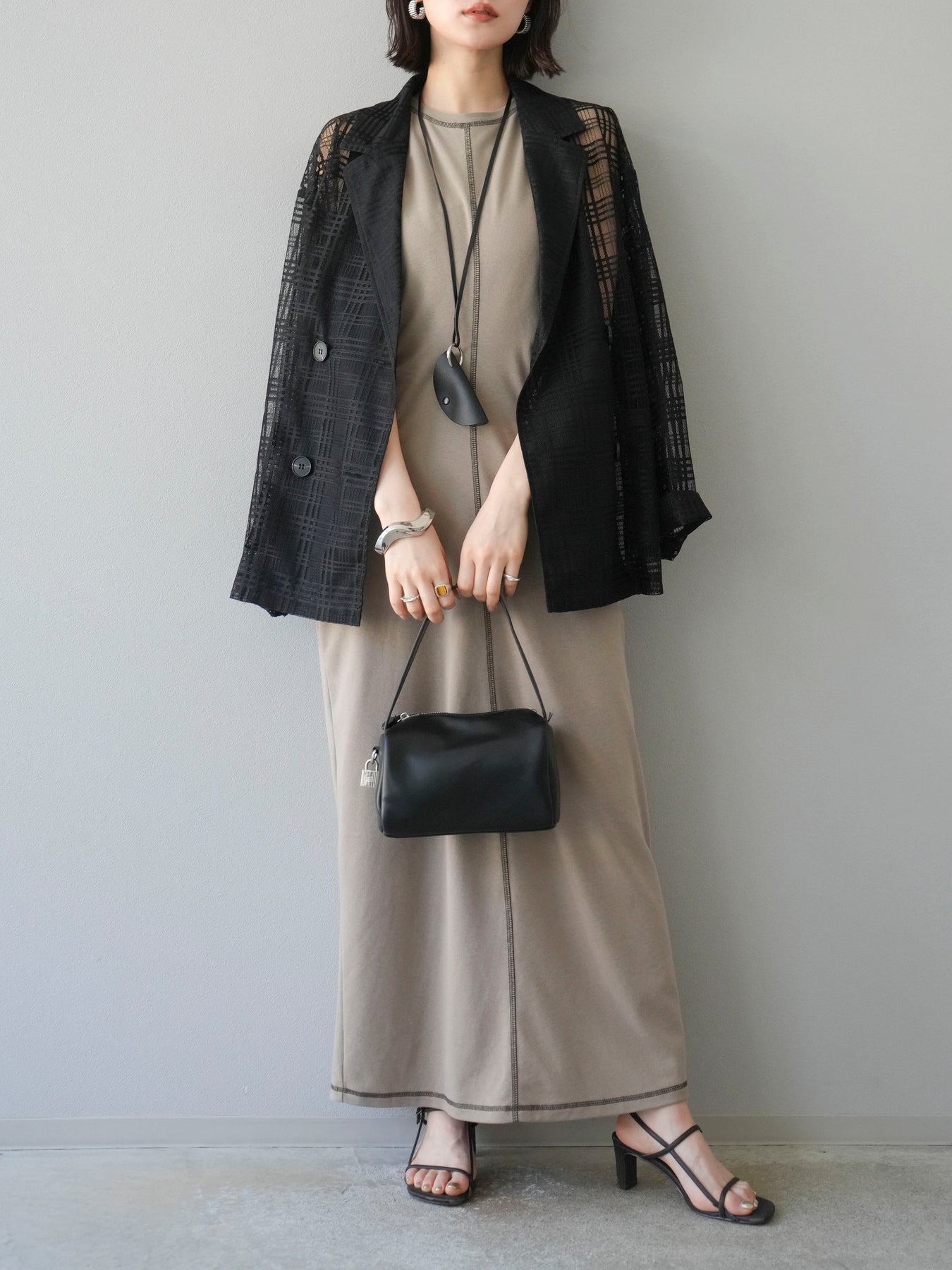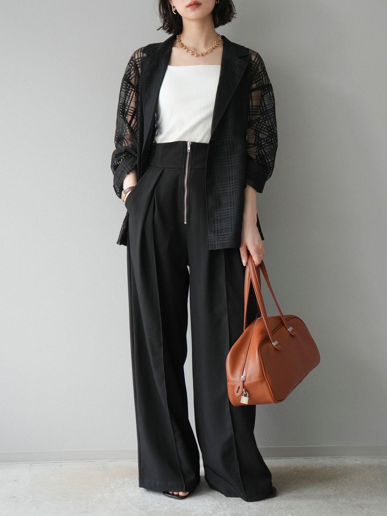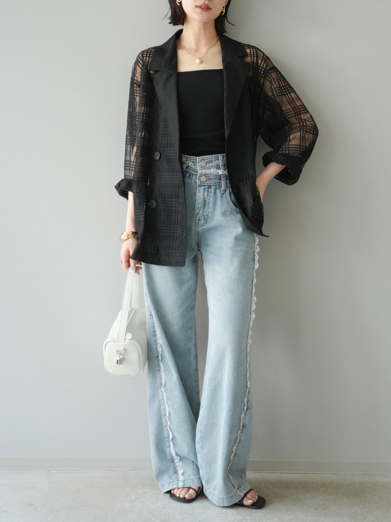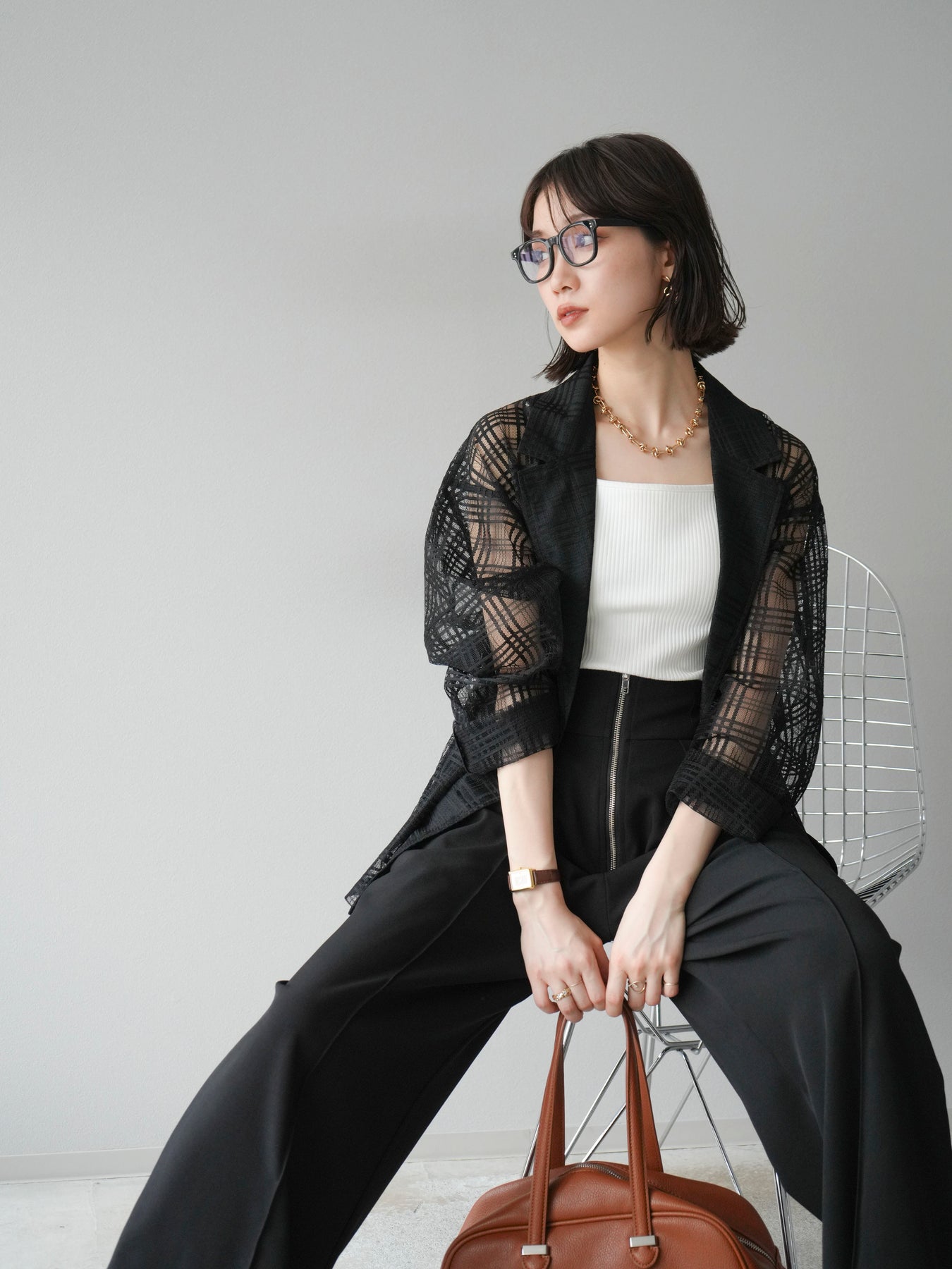 透け感のあるチュール素材にチェック柄をあしらった、軽やかで涼しげな印象のジャケット。程よいオーバーサイズとドロップショルダーが抜け感を演出し、こなれたスタイリングに仕上がります。インナーやボトムスとのレイヤードを楽しめるデザインで、春夏の羽織りとしてぴったり。Tシャツやタンクトップの上からさらっと羽織るだけで、スタイルに奥行きを与えてくれる一着です。デイリーからリゾートシーンまで、幅広く活躍します。 ※ボトムス、キャミソール(インナー)以外の商品は一律でインナーは付属していません。