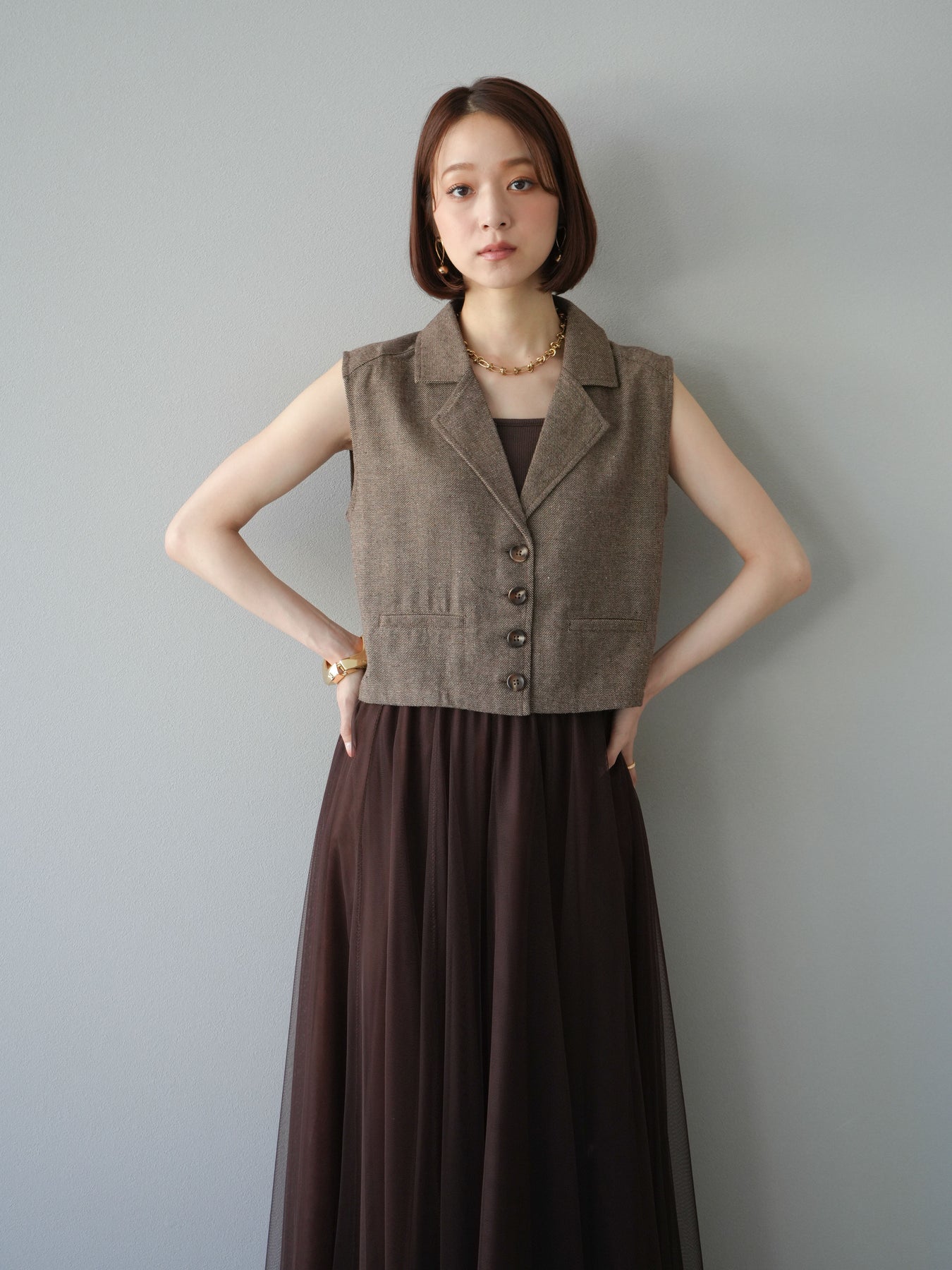 ツイードタッチの生地感が上品な印象を与えるテーラードジレ。コンパクトな丈感とすっきりとしたシルエットで、羽織るだけで洗練されたスタイルを演出します。テーラードカラーとフロントボタンがクラシカルなムードを高め、シャツやカットソー、ワンピースなど様々なアイテムとのレイヤードが楽しめる一枚。きちんと感を備えながらも程よいカジュアルさがあり、オンオフ問わず活躍します。季節の変わり目にはライトアウター感覚としても重宝する、万能なジレです。 ※ボトムス、キャミソール(インナー)以外の商品は一律でインナーは付属していません。