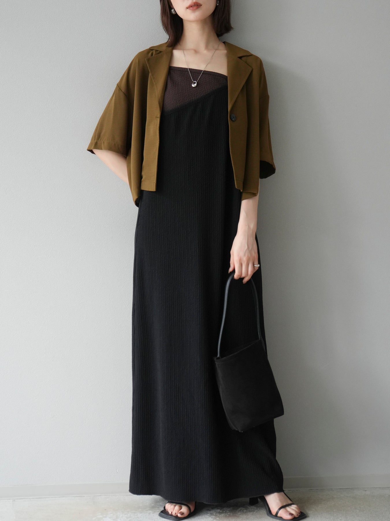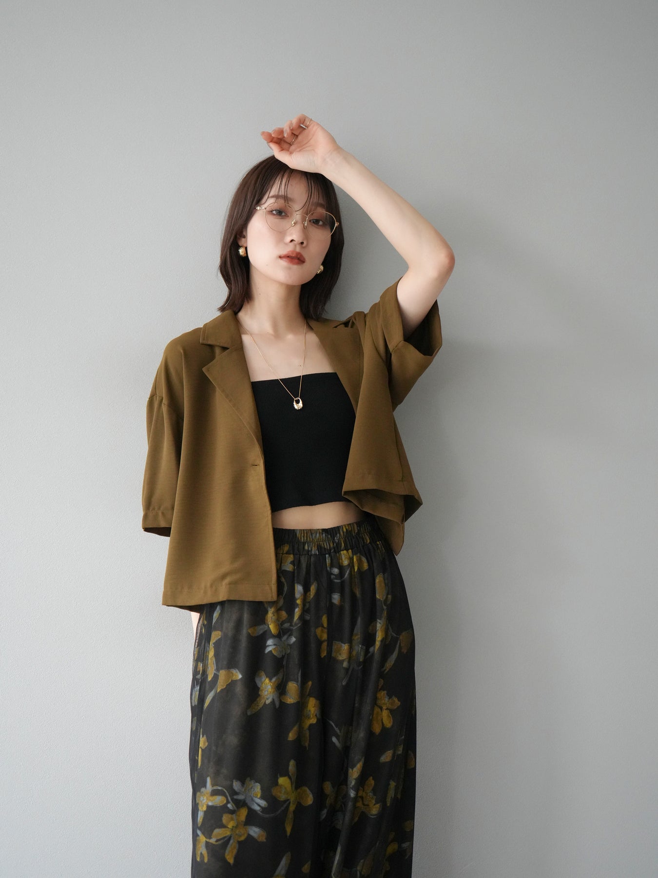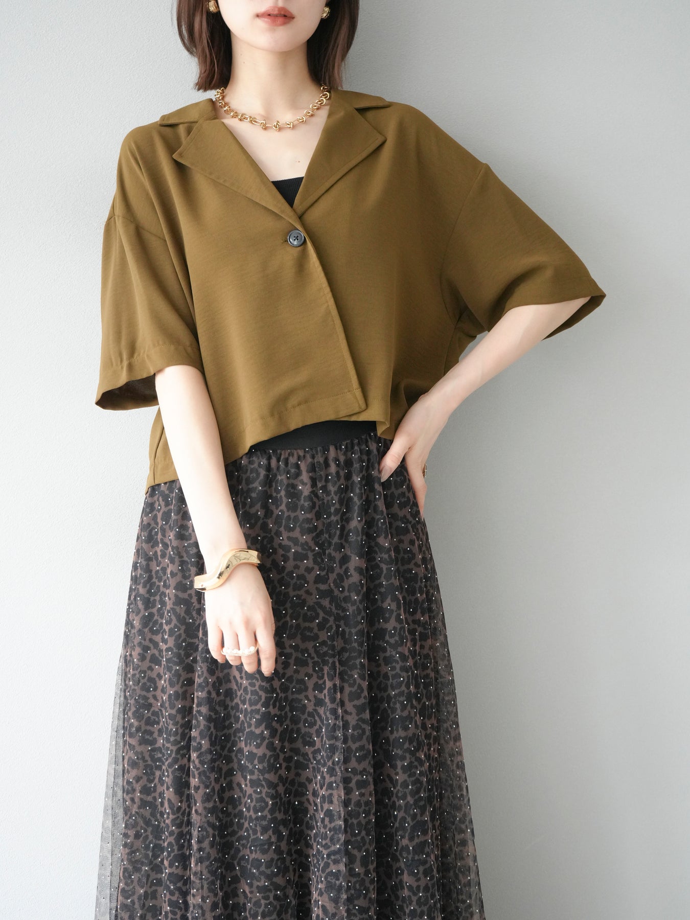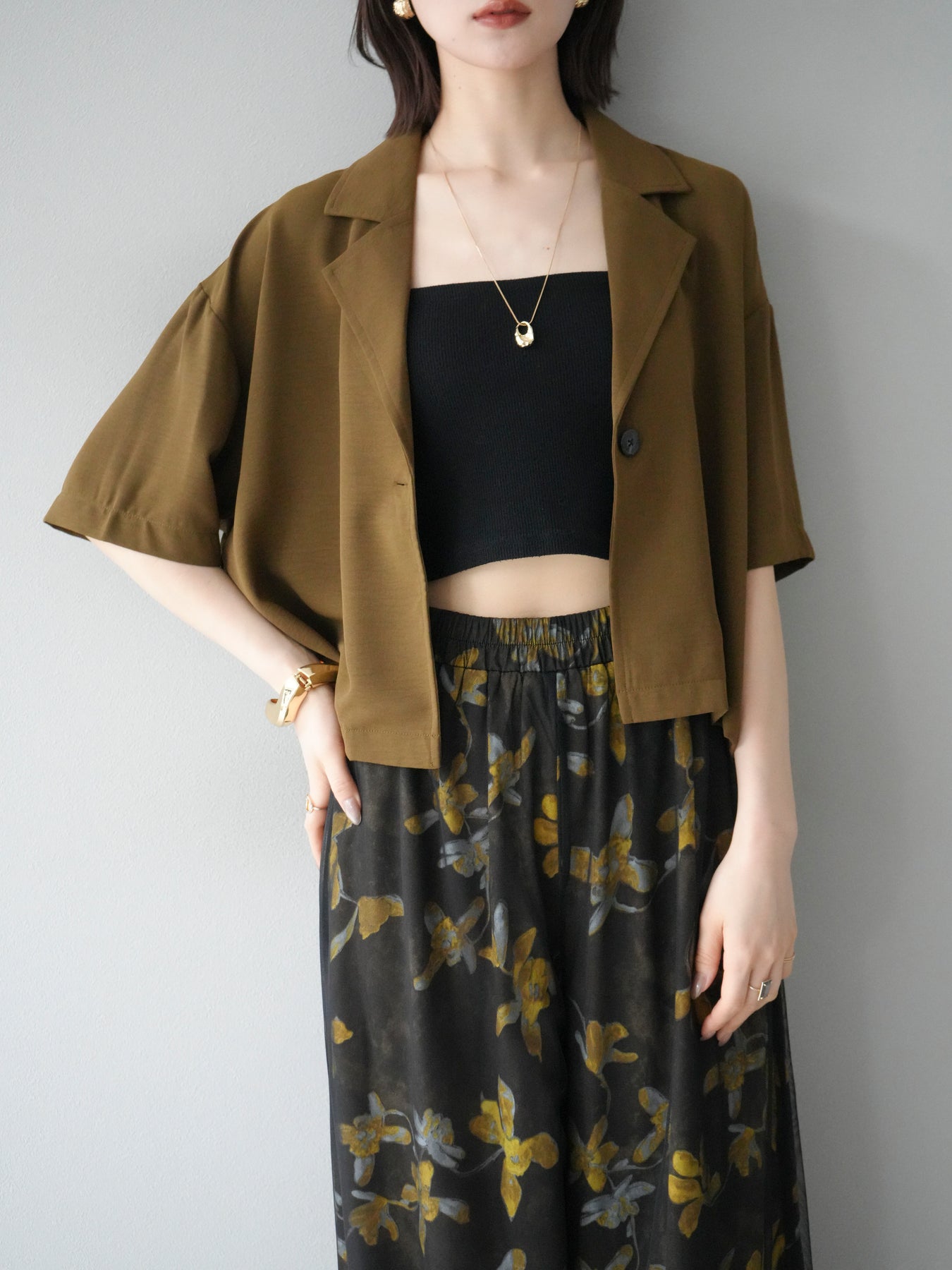 肩幅52cm バスト114cm アームホール50cm 袖丈22cm 袖口34cm 着丈51cm 裏地なし 透け感なし 伸縮性ややあり ポケットなし