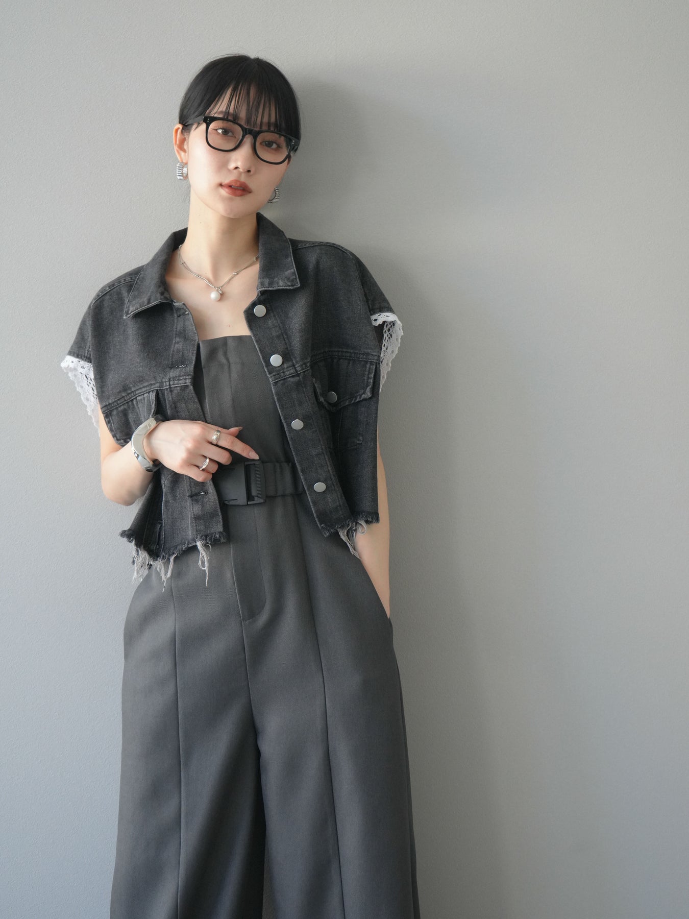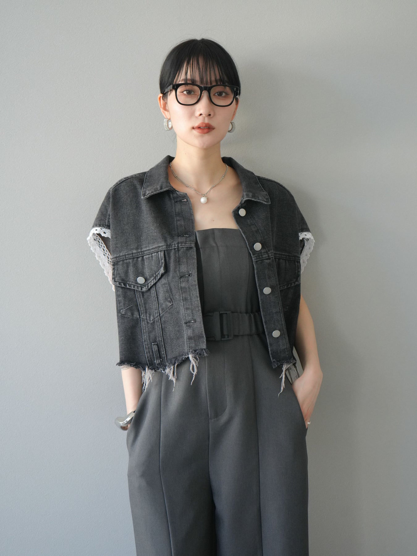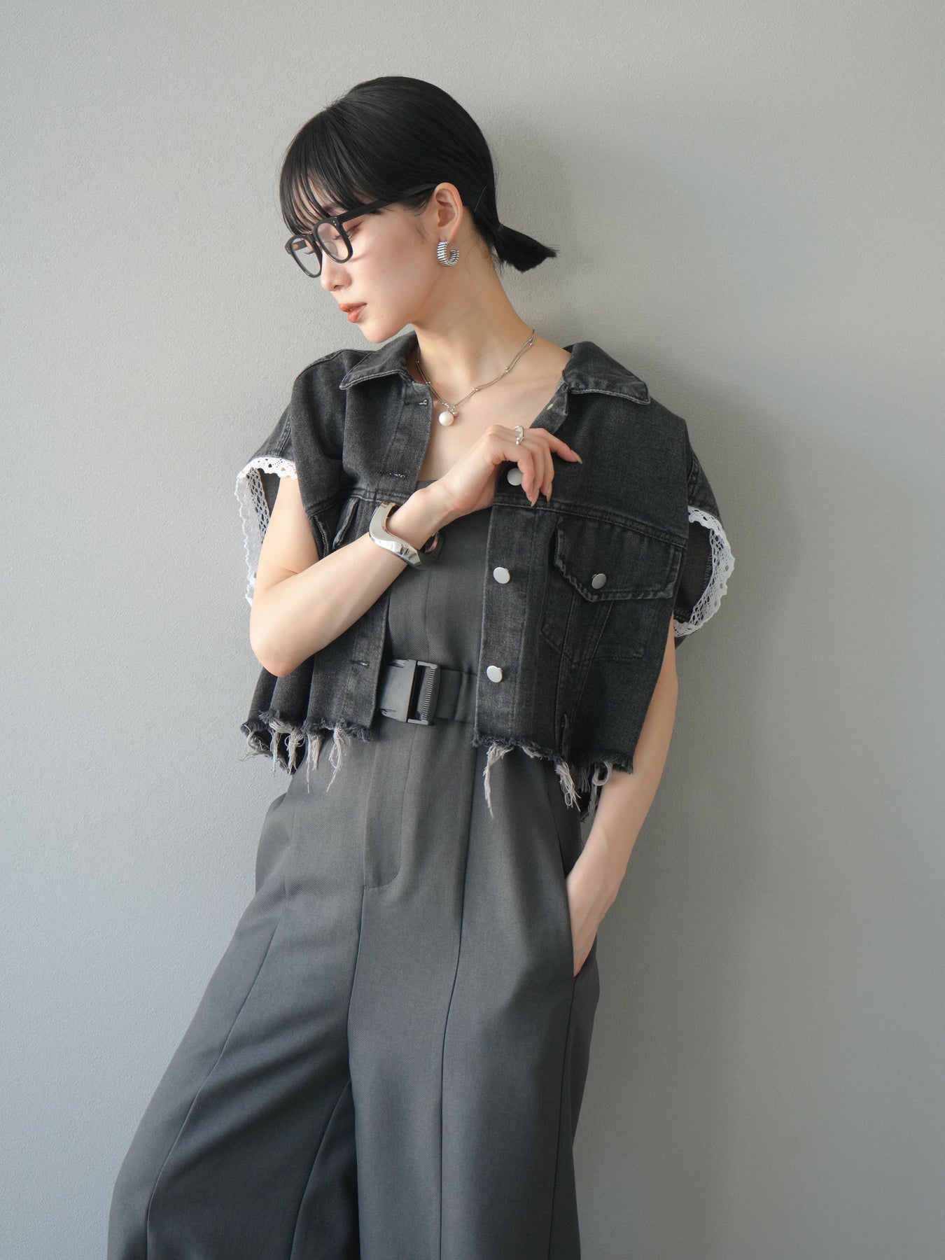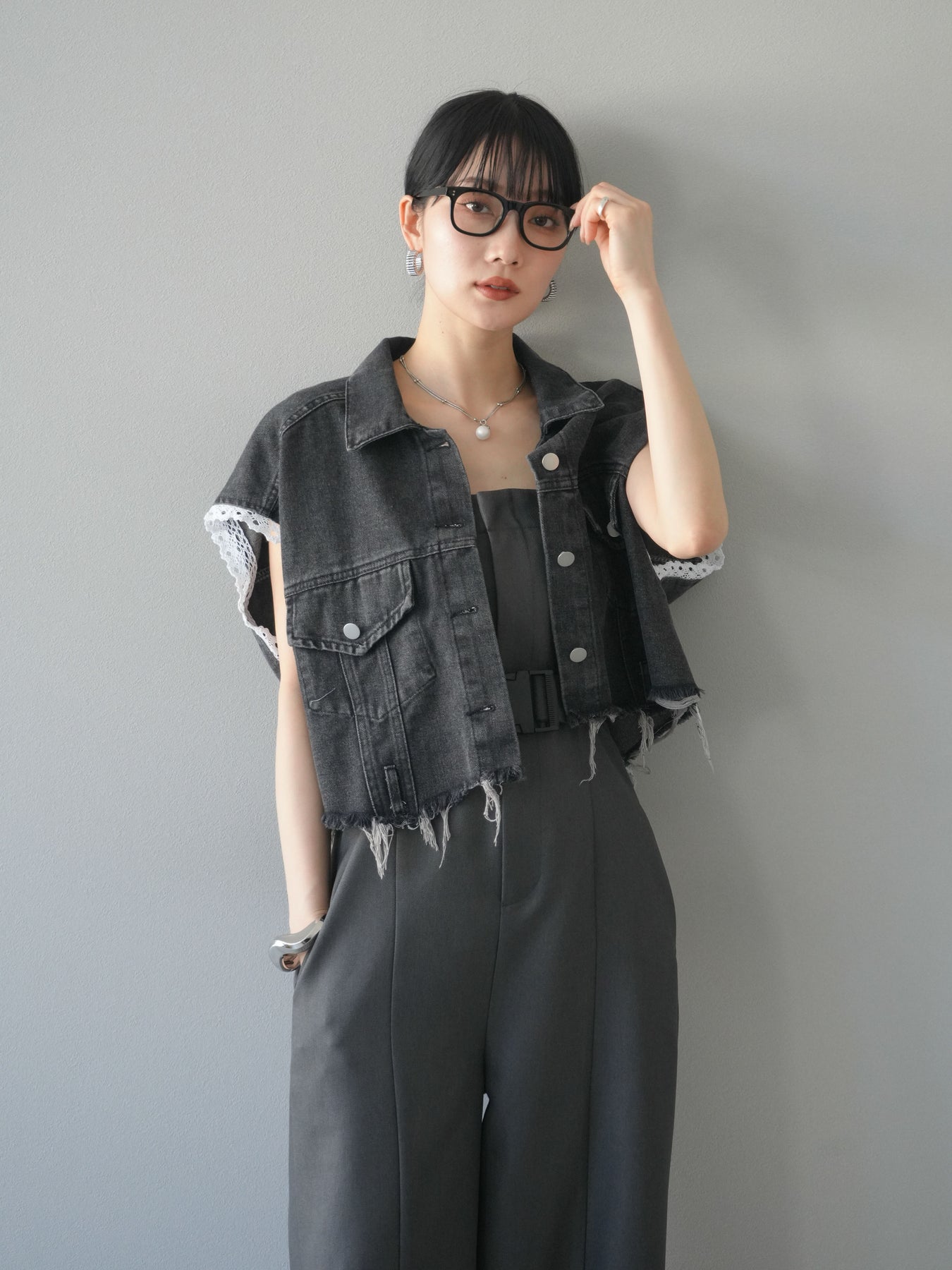 カジュアルなデニムにフェミニンなレースを組み合わせた、トレンド感たっぷりのショートジャケット。袖口からのぞくレースが抜け感を演出し、ダメージ加工がこなれた雰囲気をプラスします。ショート丈でバランスが取りやすく、ワイドパンツやワンピースとの相性も抜群。羽織るだけでこなれたスタイルが完成します。 ※ボトムス、キャミソール(インナー)以外の商品は一律でインナーは付属していません