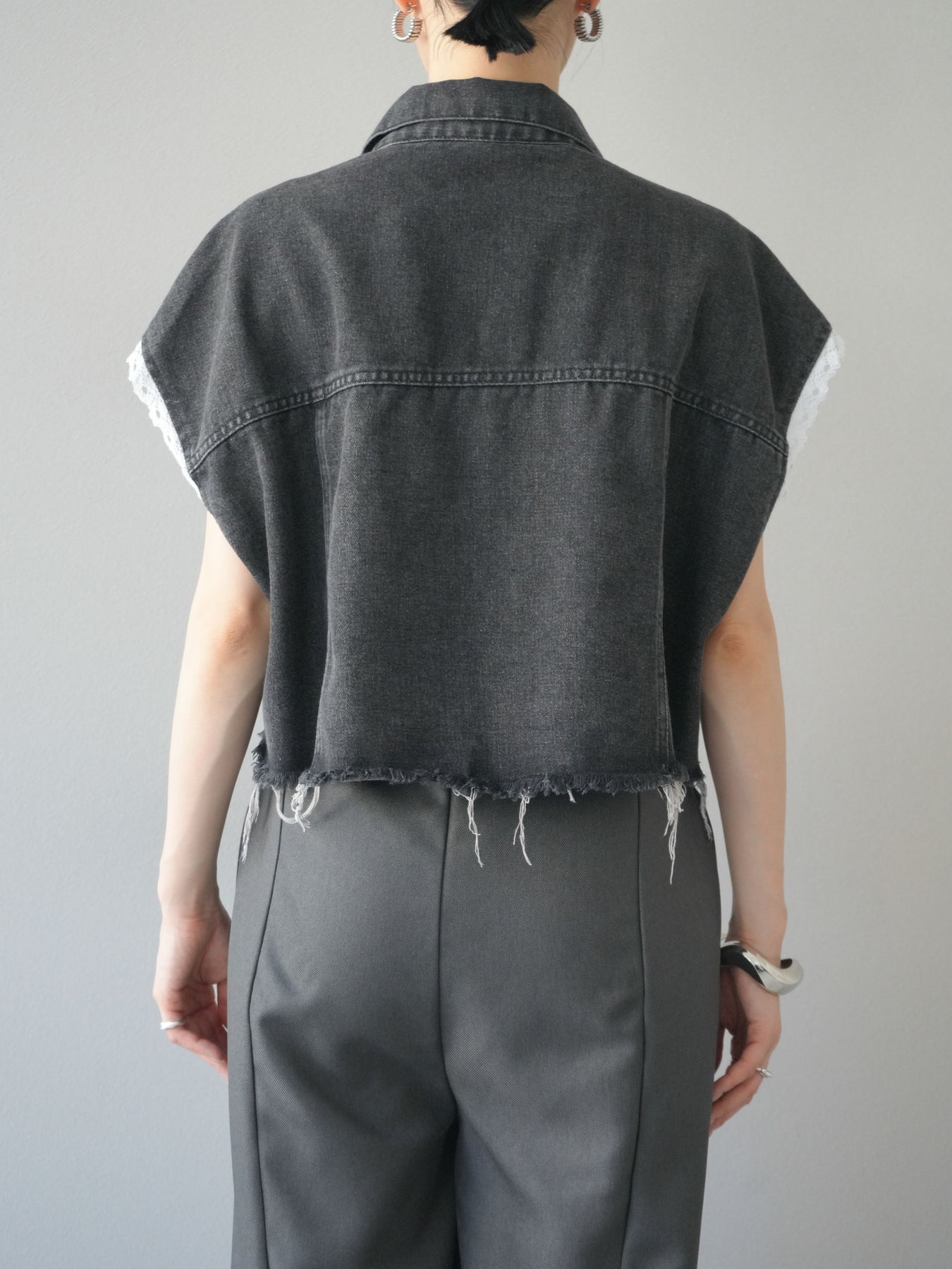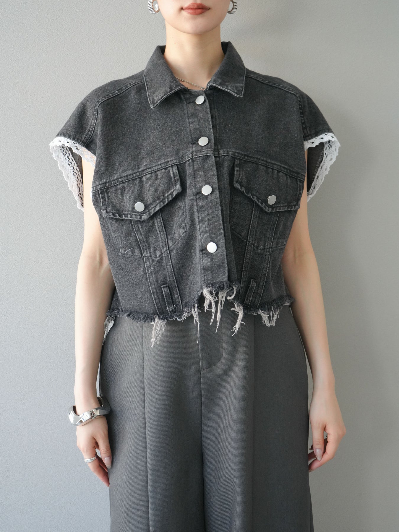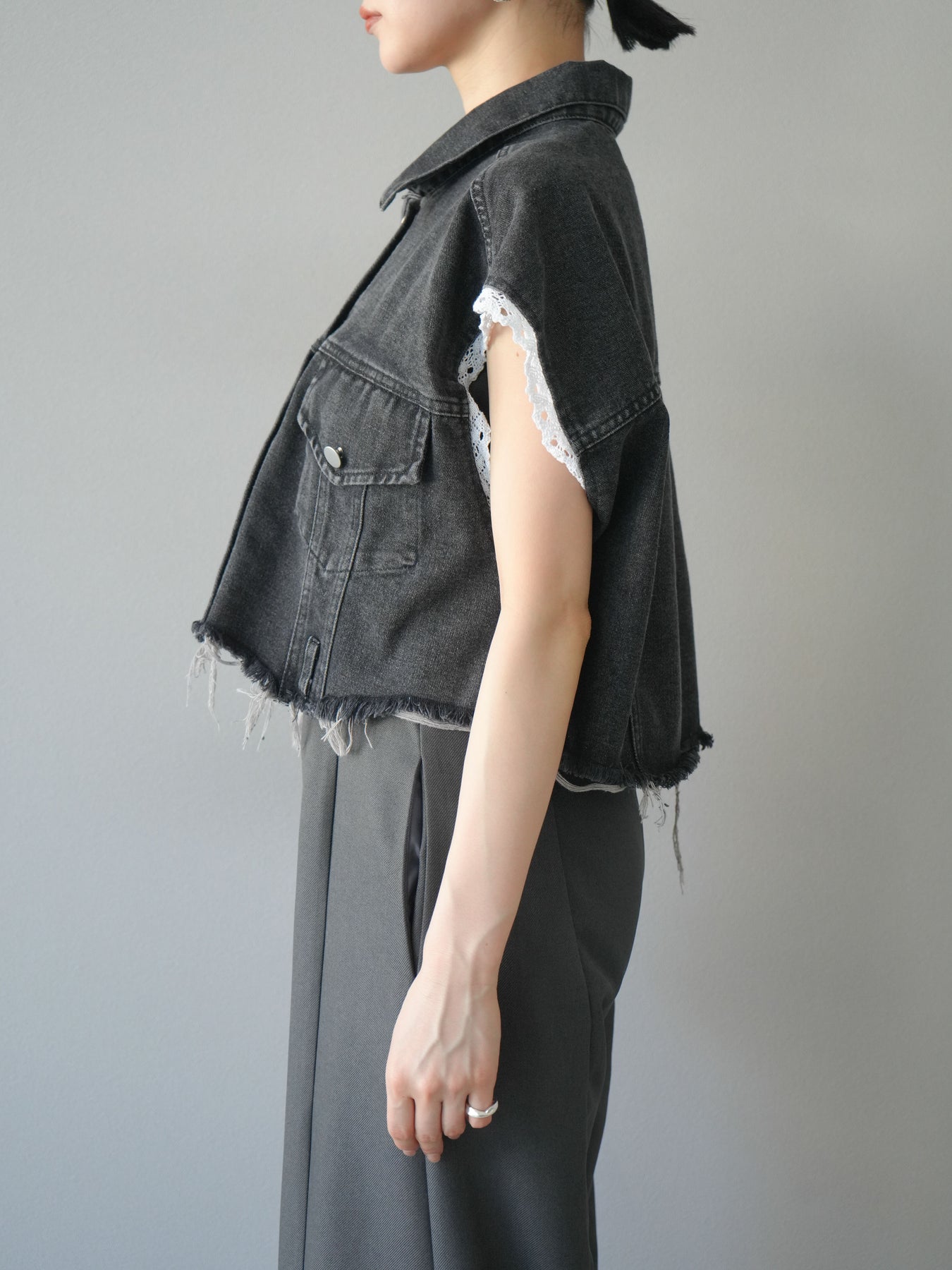 [予約]袖レースダメージデニムショートジャケット/ブラック