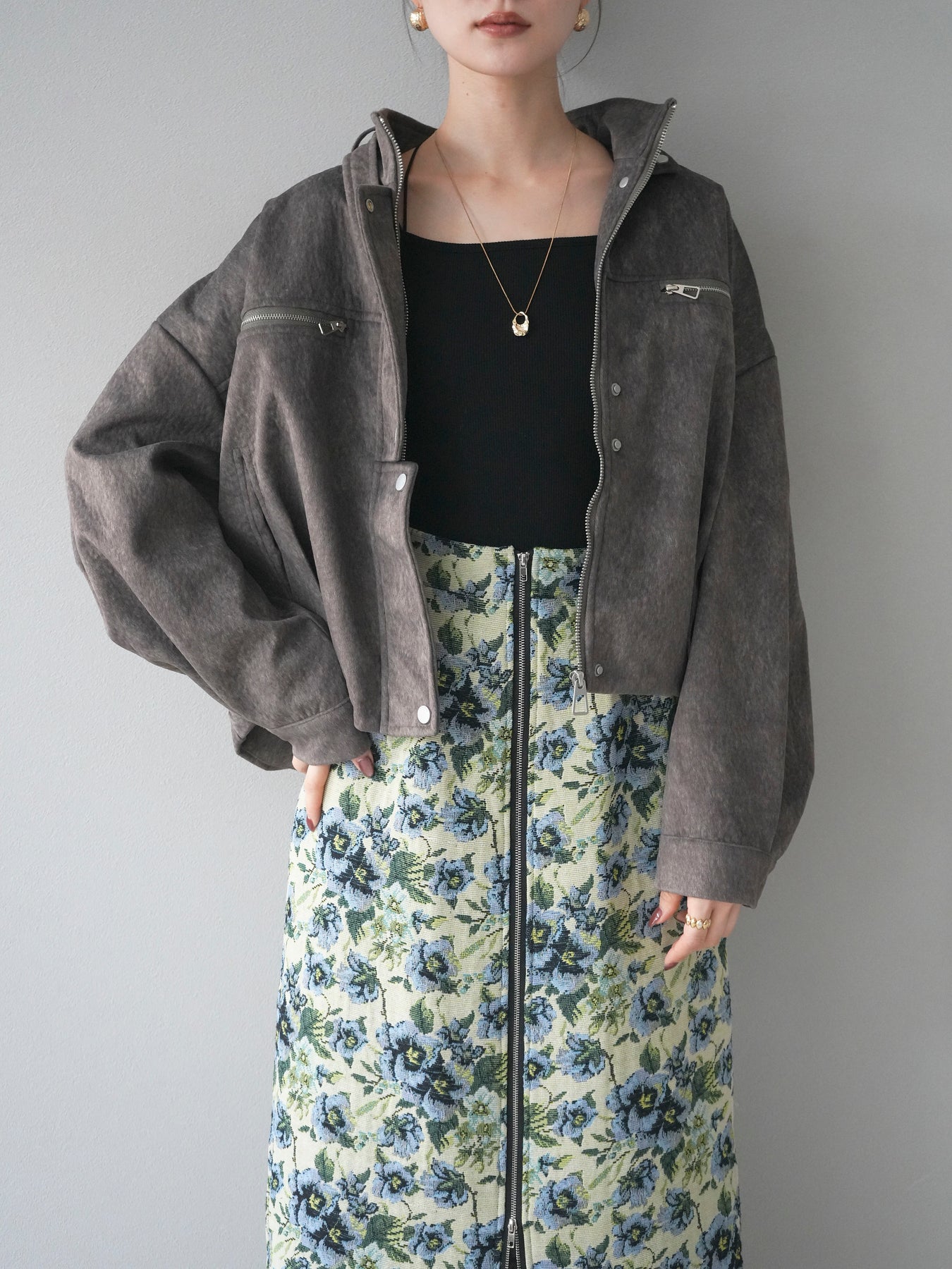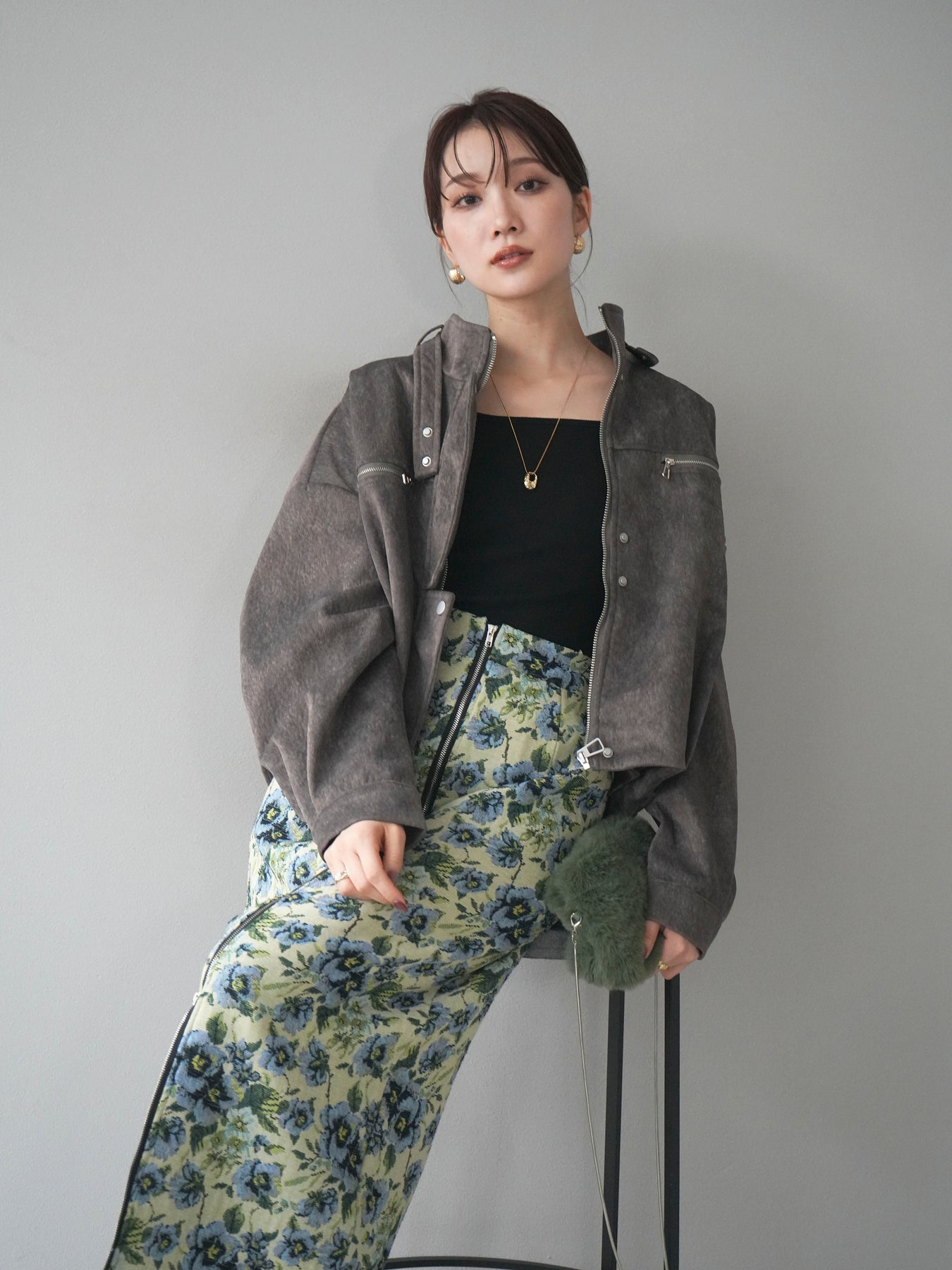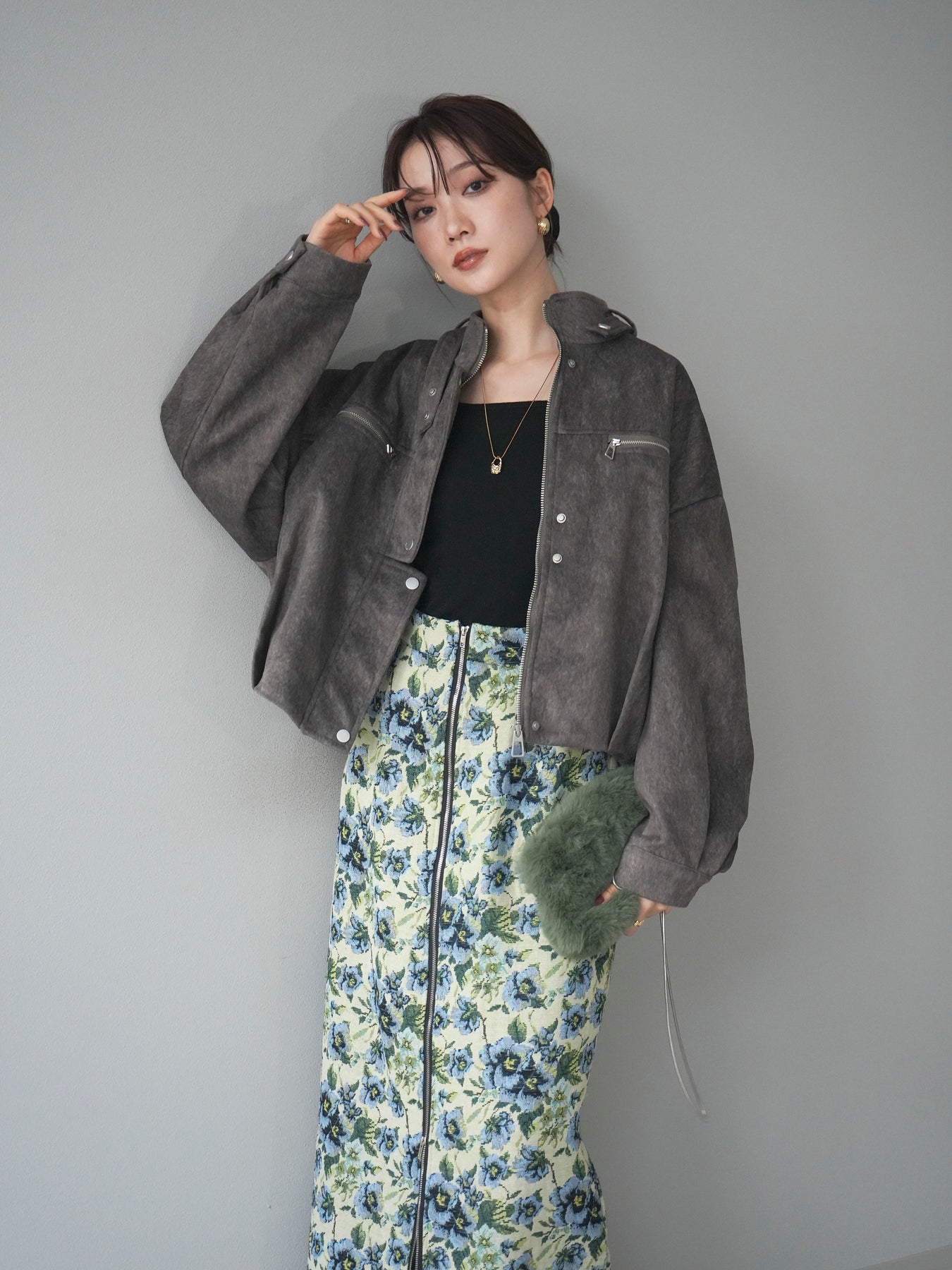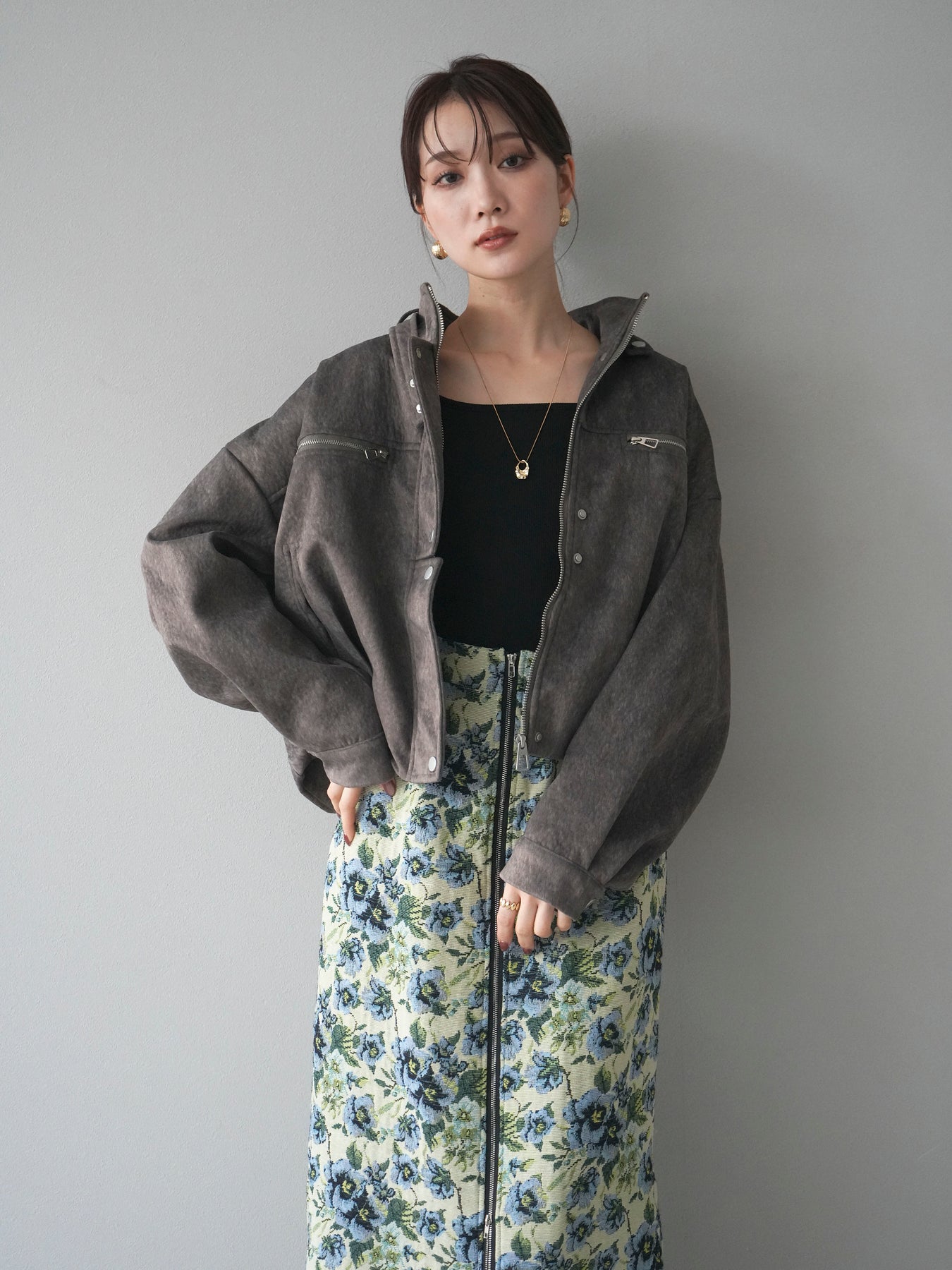柔らかなスエード調素材を使用した、ジップディテールが印象的なブルゾン。 立ち上がりのあるスタンドカラーとメタルジップが、モードな雰囲気を漂わせます。 ゆったりとしたシルエットで抜け感があり、軽やかな着心地ながらも存在感のある仕上がりに。 フロントの切り替えやジップポケットがデザインアクセントとなり、羽織るだけでスタイリッシュな印象を与えます。 パンツにもスカートにも合わせやすく、季節の変わり目に活躍する万能アウターです。 ※ボトムス、キャミソール(インナー)以外の商品は一律でインナーは付属していません。