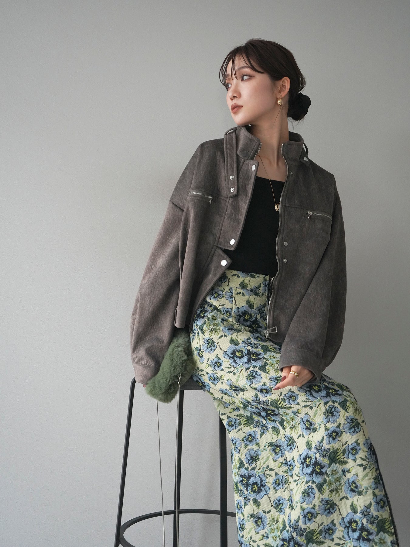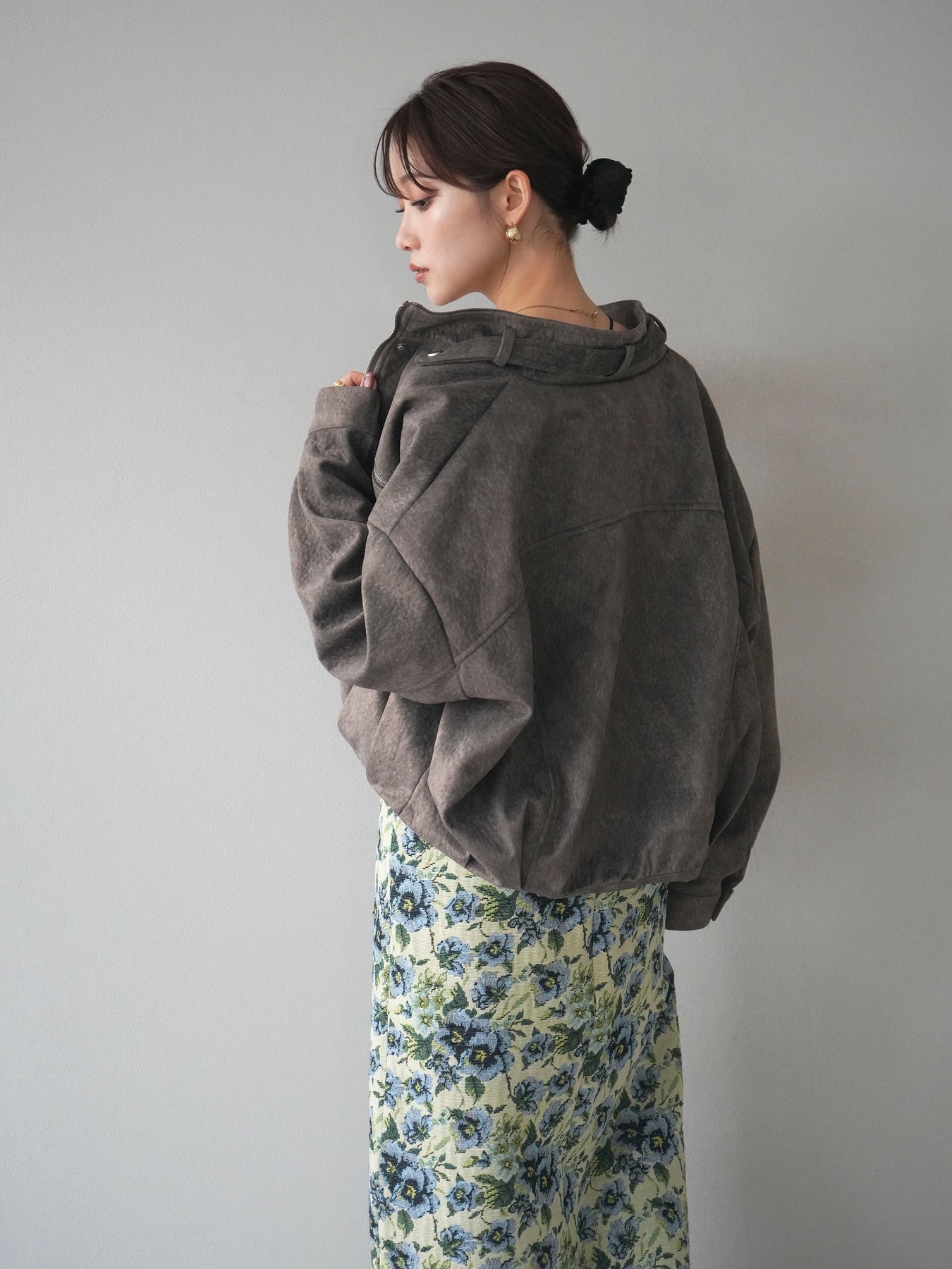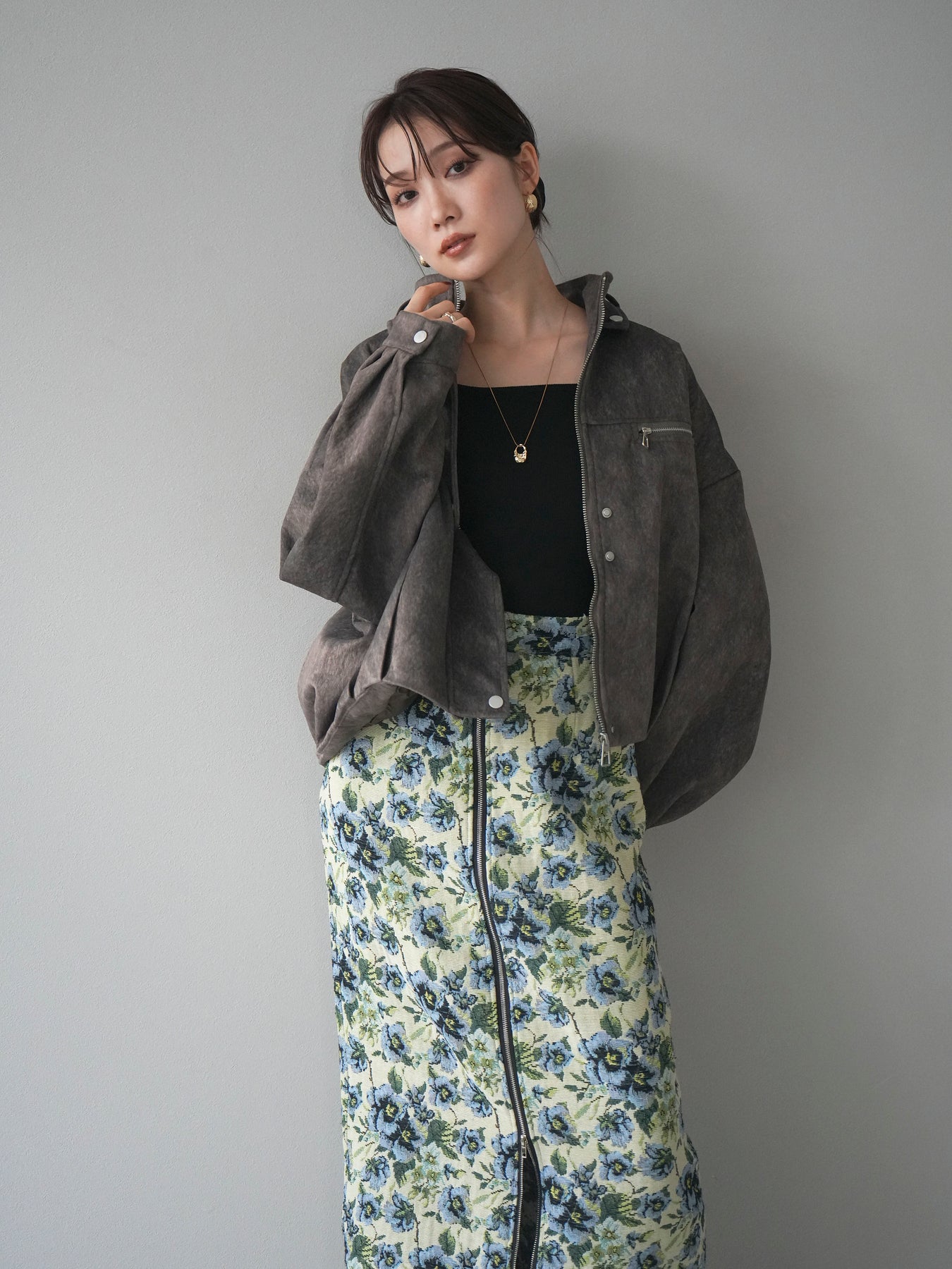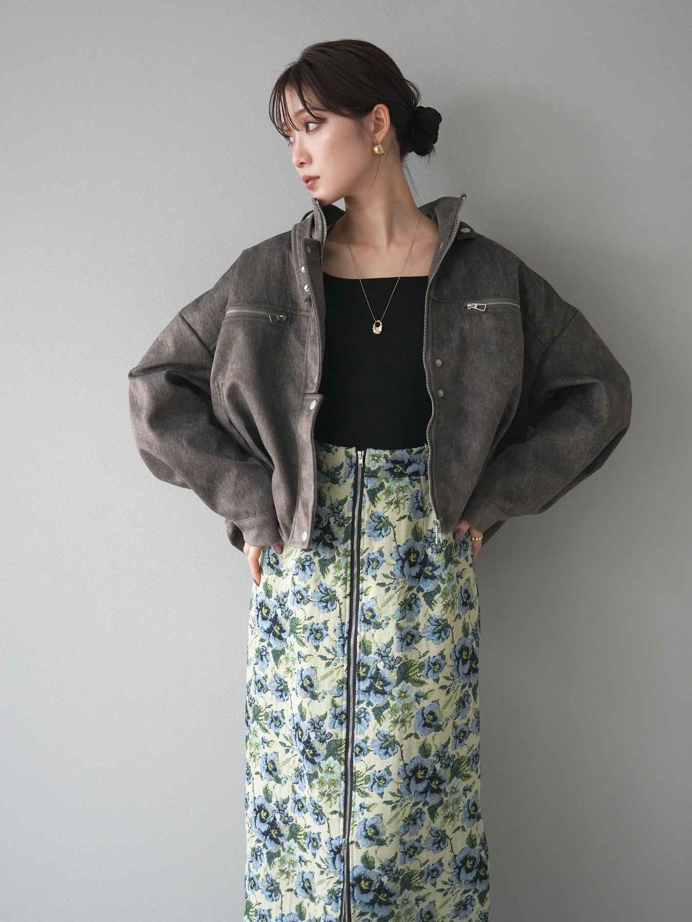 柔らかなスエード調素材を使用した、ジップディテールが印象的なブルゾン。 立ち上がりのあるスタンドカラーとメタルジップが、モードな雰囲気を漂わせます。 ゆったりとしたシルエットで抜け感があり、軽やかな着心地ながらも存在感のある仕上がりに。 フロントの切り替えやジップポケットがデザインアクセントとなり、羽織るだけでスタイリッシュな印象を与えます。 パンツにもスカートにも合わせやすく、季節の変わり目に活躍する万能アウターです。 ※ボトムス、キャミソール(インナー)以外の商品は一律でインナーは付属していません。