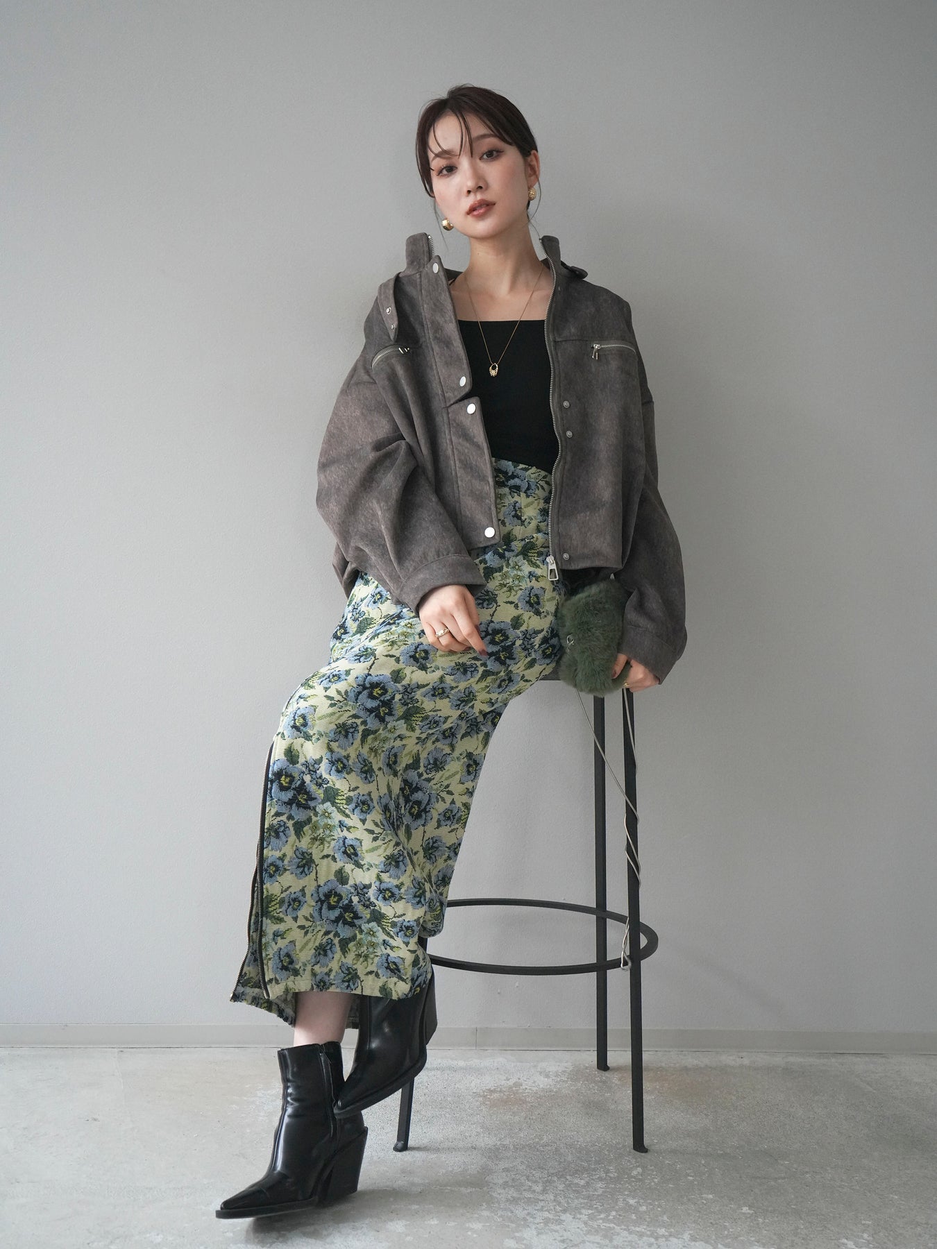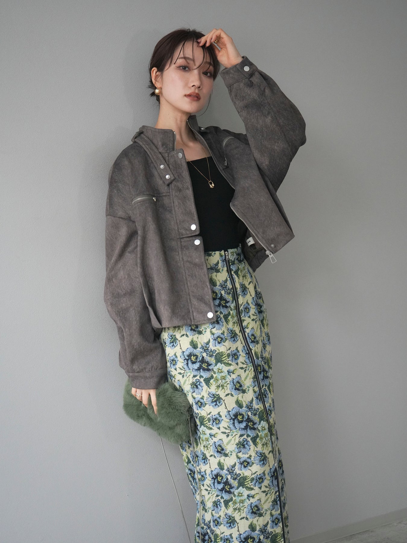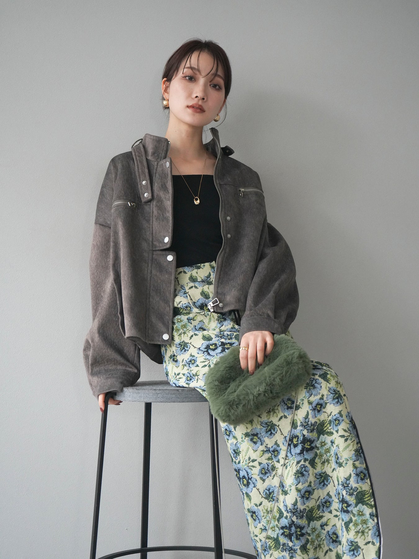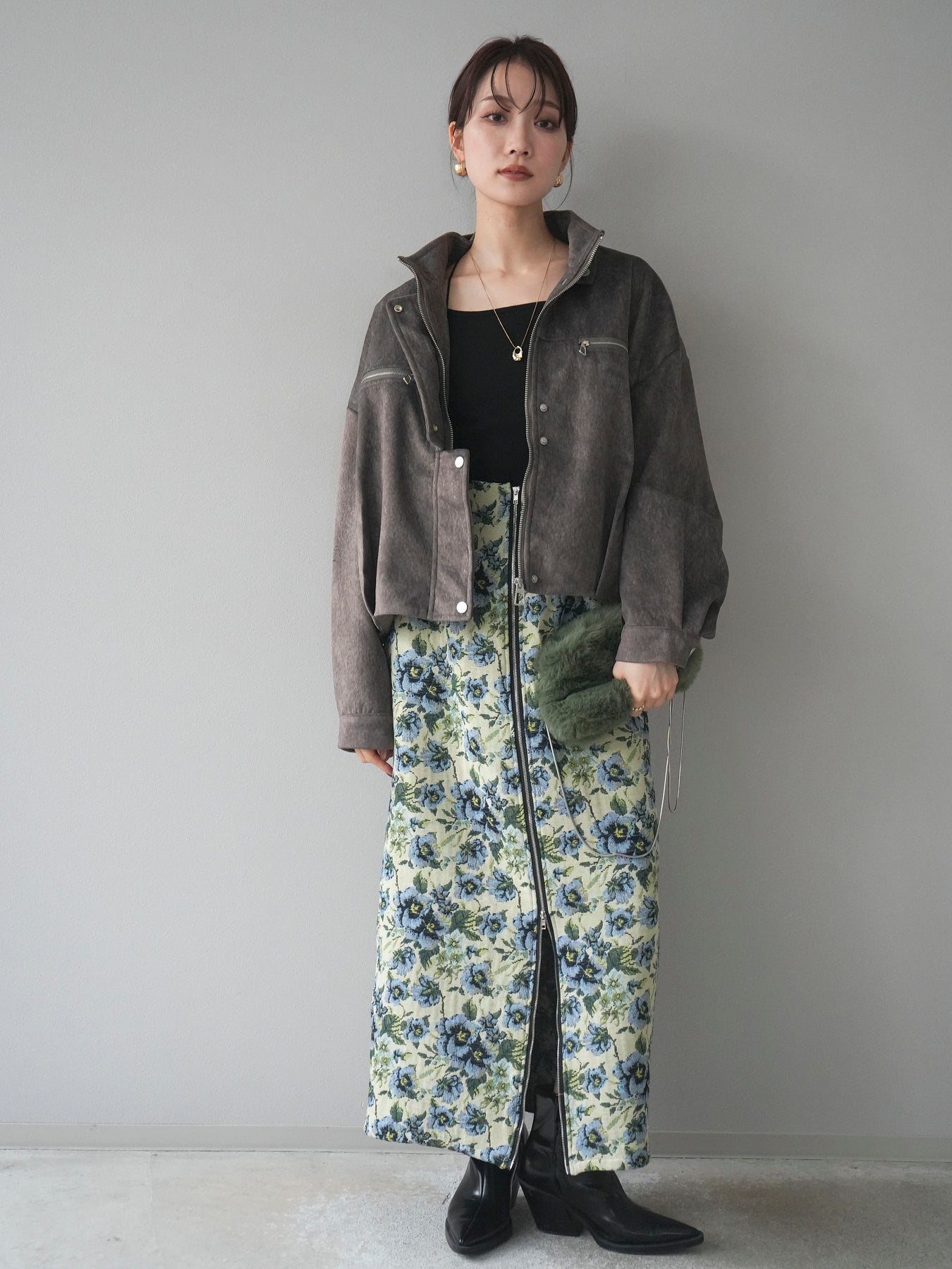 柔らかなスエード調素材を使用した、ジップディテールが印象的なブルゾン。 立ち上がりのあるスタンドカラーとメタルジップが、モードな雰囲気を漂わせます。 ゆったりとしたシルエットで抜け感があり、軽やかな着心地ながらも存在感のある仕上がりに。 フロントの切り替えやジップポケットがデザインアクセントとなり、羽織るだけでスタイリッシュな印象を与えます。 パンツにもスカートにも合わせやすく、季節の変わり目に活躍する万能アウターです。 ※ボトムス、キャミソール(インナー)以外の商品は一律でインナーは付属していません。
