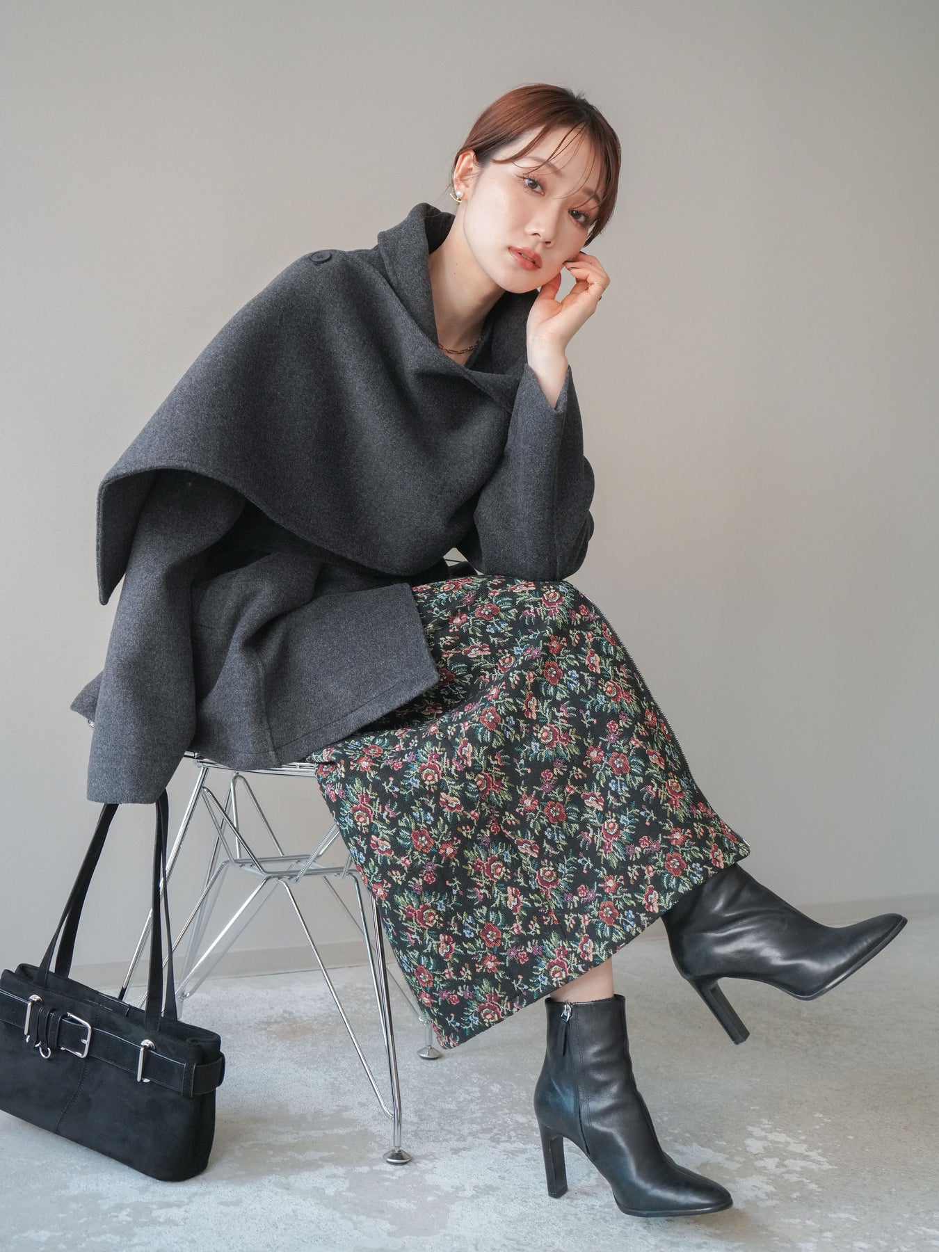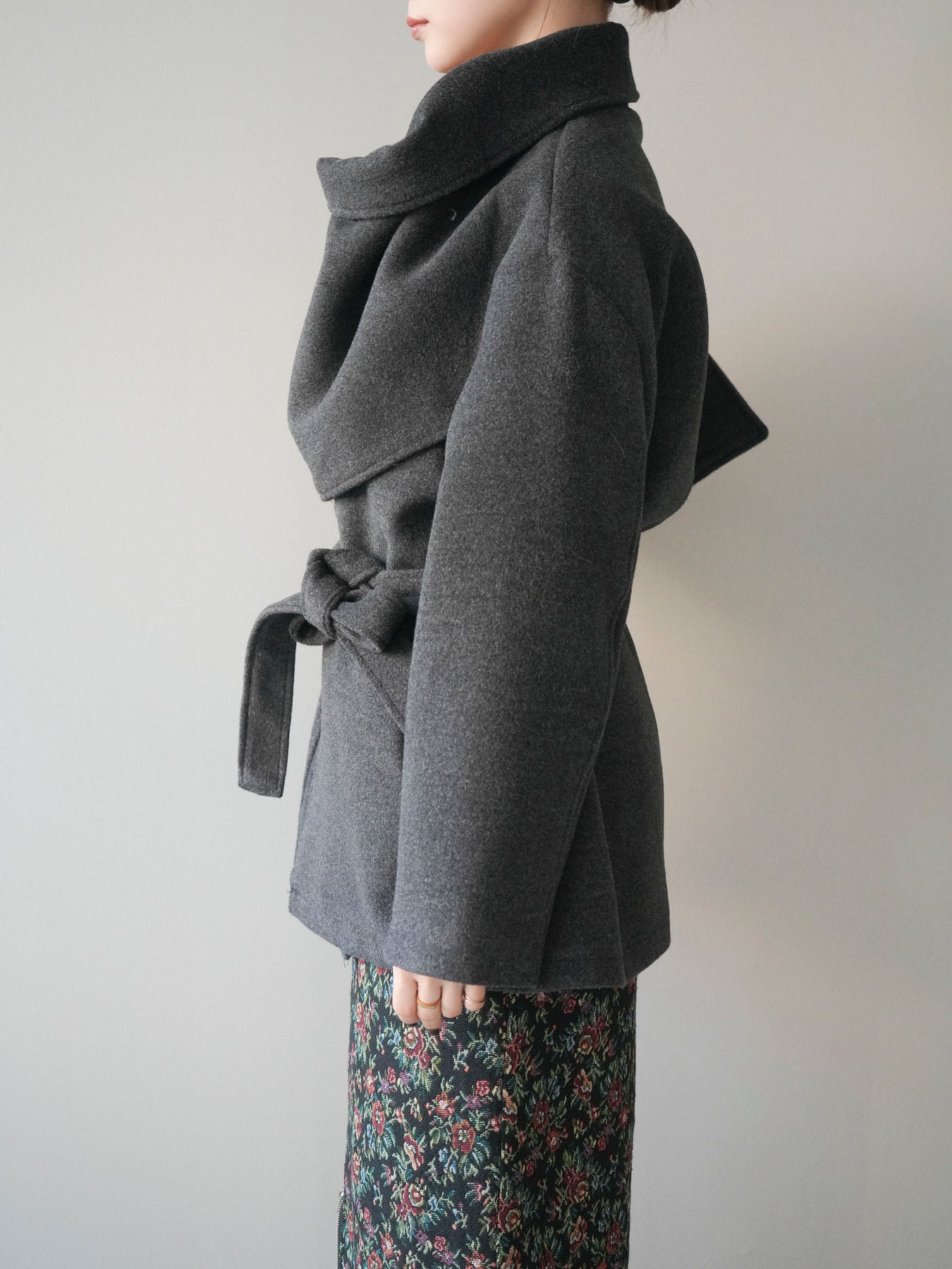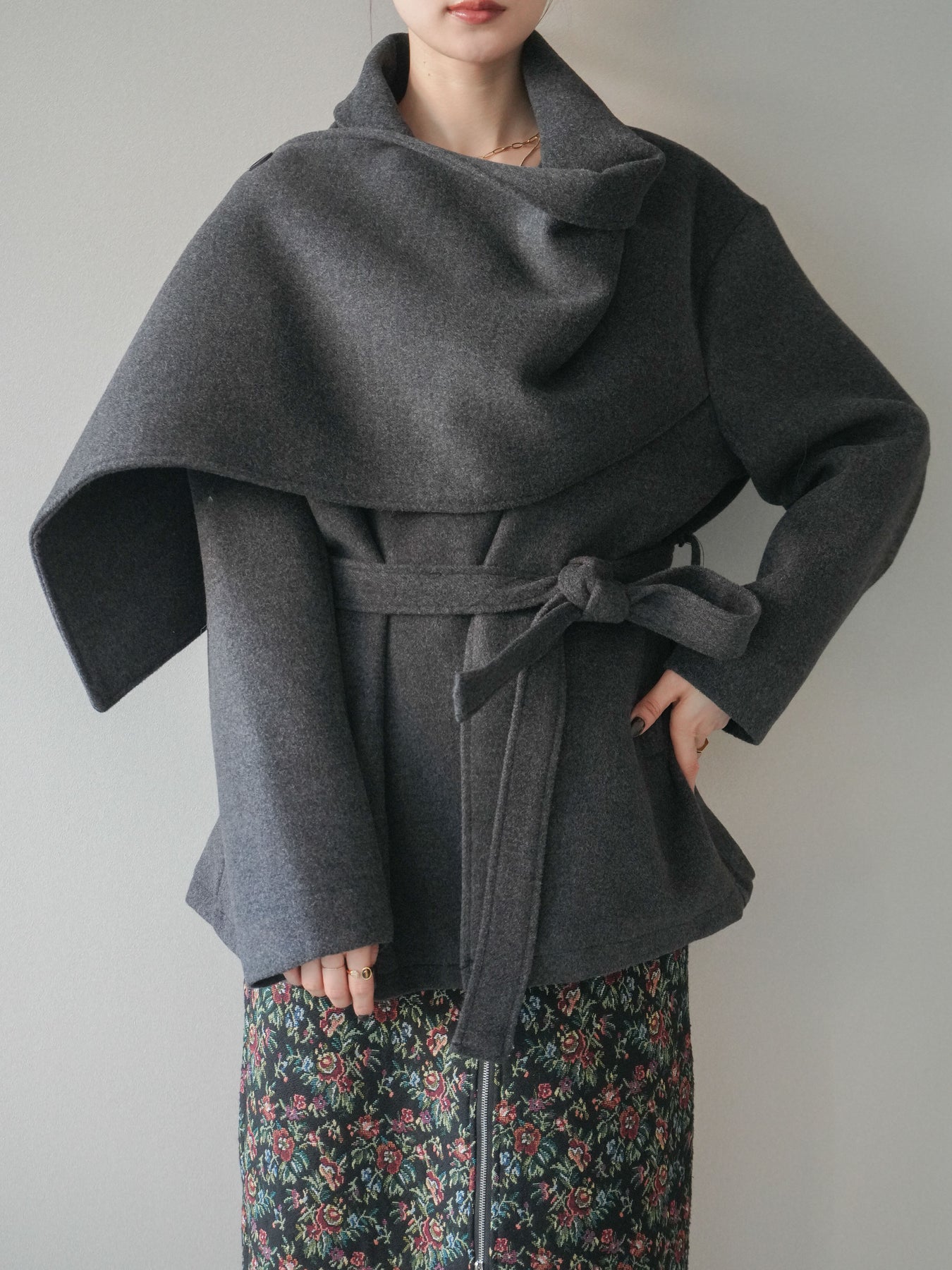 ストールを巻いたような立体的な襟元が印象的なショートコート。柔らかな素材を使用し、程よいボリューム感を持たせることで上品で華やかなシルエットに仕上げています。フロントはウエストベルトでメリハリを付けることができ、女性らしいラインを引き立てながら防寒性もアップ。ショート丈ながら厚手ニットとも重ねやすく、スカート・パンツどちらにもバランスよく合わせやすい万能アイテムです。羽織るだけでこなれ感の漂う、一枚あると重宝するアウター。 ※ボトムス、キャミソール(インナー)以外の商品は一律でインナーは付属していません。