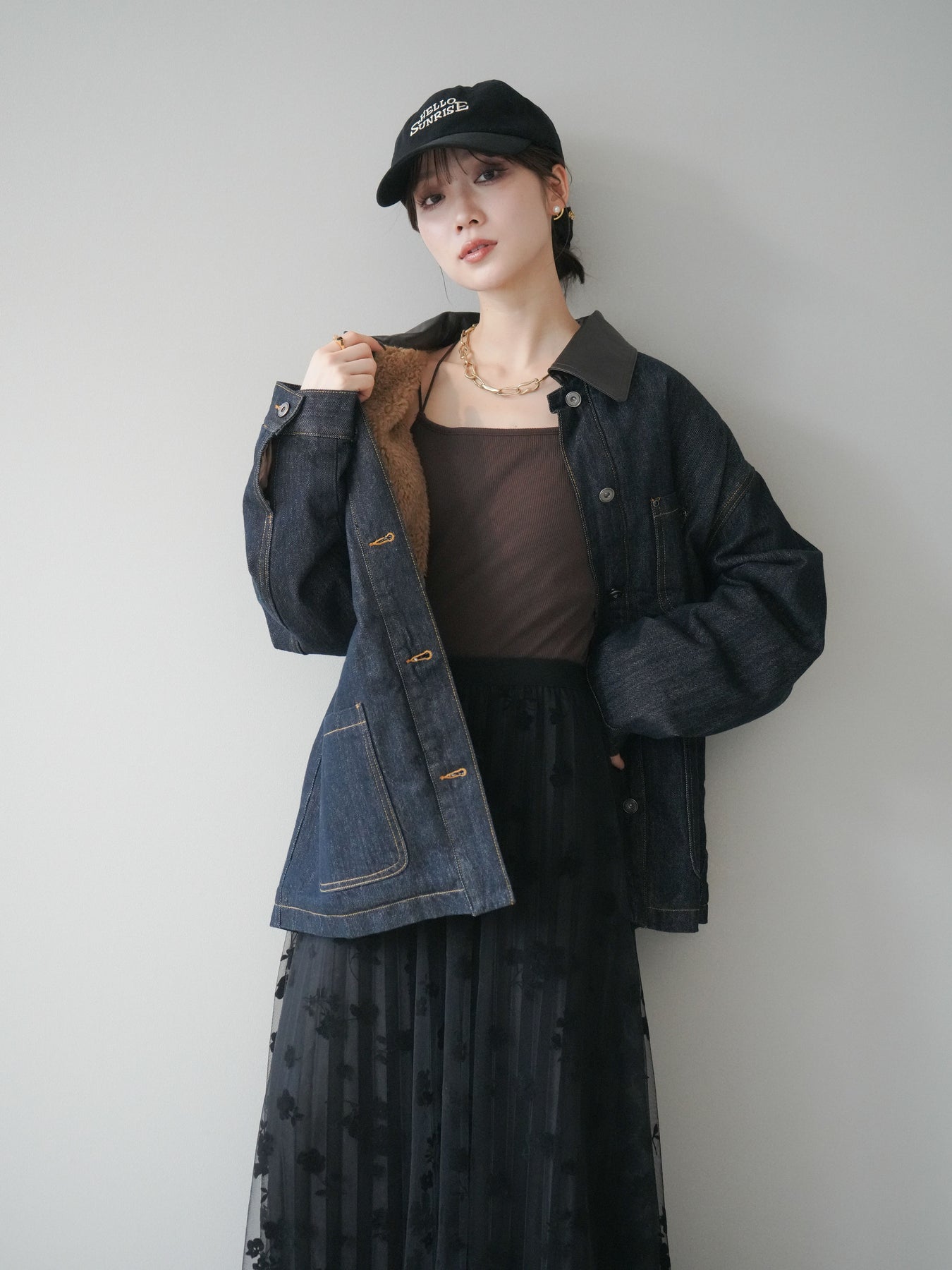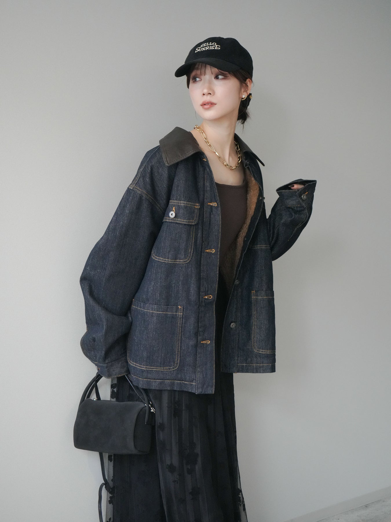 ヴィンテージライクなデニム素材を使用し、裏地にふわふわのファーを仕込んだフライトジャケット。外側はカジュアルなデニム、内側は暖かなファーの贅沢な組み合わせで、見た目以上の防寒性を発揮します。大きめの襟やポケットがアクセントになり、どこかレトロな雰囲気を漂わせつつも、トレンド感のあるシルエットに仕上げています。ゆとりのあるサイズ感でニットの上からも羽織りやすく、冬のデイリーコーデに頼れる一枚です。 ※ボトムス、キャミソール(インナー)以外の商品は一律でインナーは付属していません。