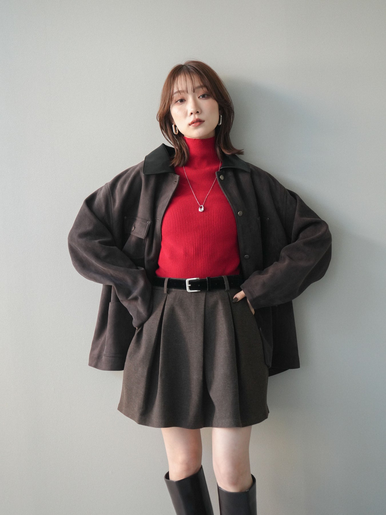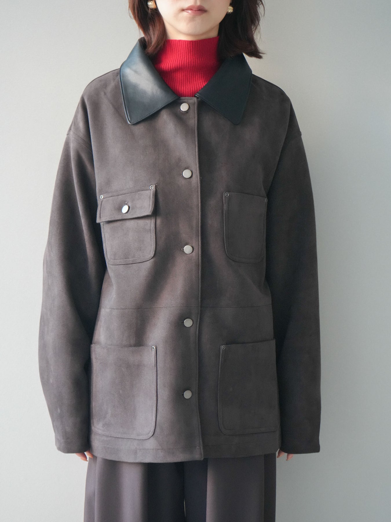 スエードタッチの柔らかな素材にレザー調の襟を組み合わせた、上品さとモード感を兼ね備えたステンカラージャケット。異素材のコントラストがスタイリングに奥行きを生み、シンプルなシルエットでもしっかりと存在感のある一枚に仕上がっています。大きめのポケットやメタルボタンがアクセントとなり、実用性とデザイン性を両立。ゆとりのあるシルエットでニットの上からも羽織りやすく、デイリーからきれいめコーデまで幅広く活躍する万能アウターです。 ※ボトムス、キャミソール(インナー)以外の商品は一律でインナーは付属していません。