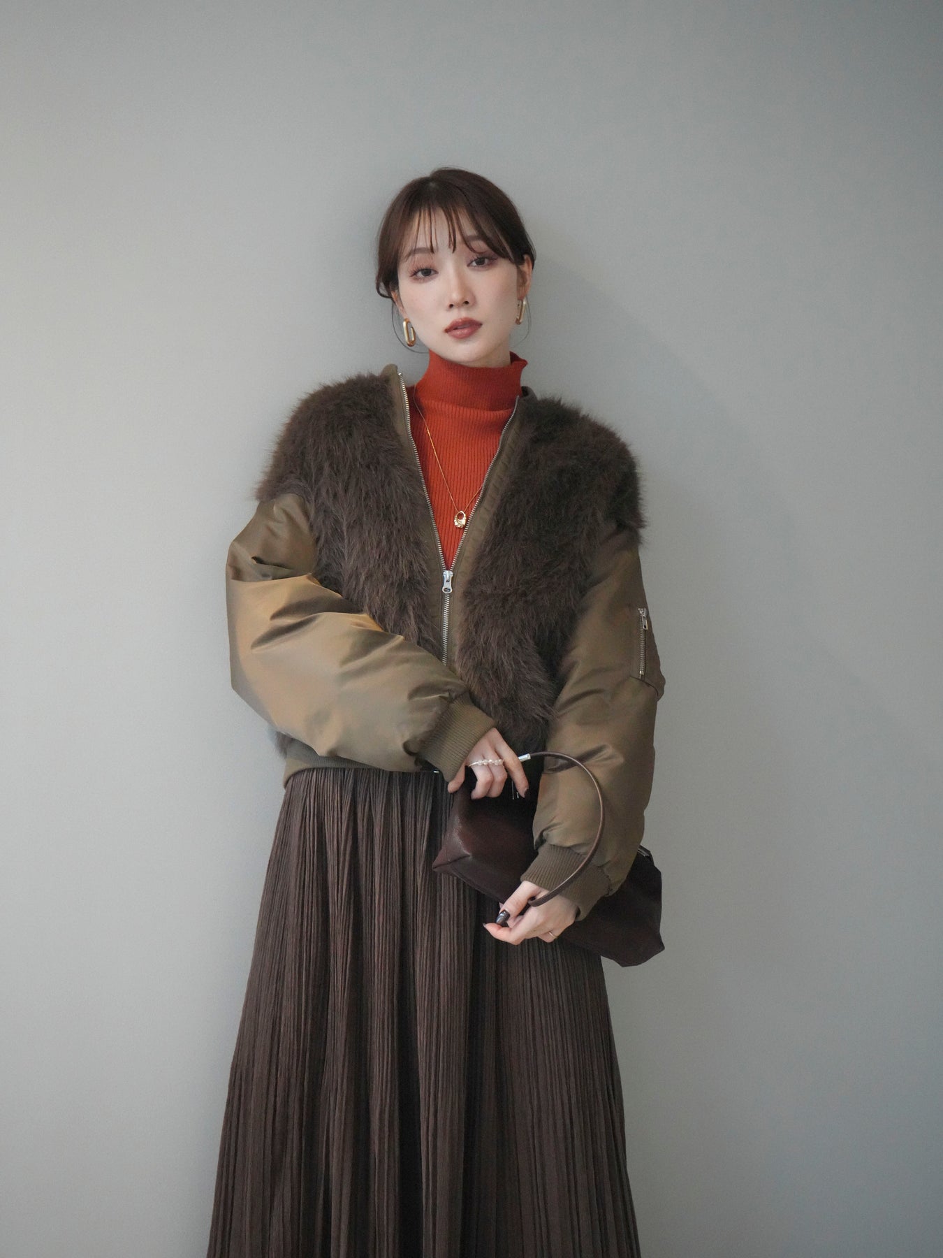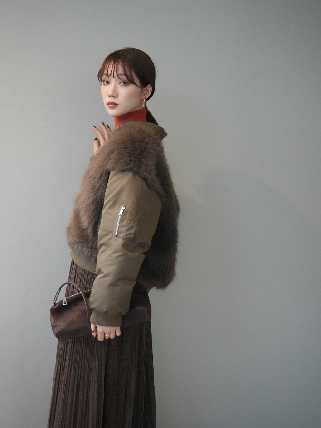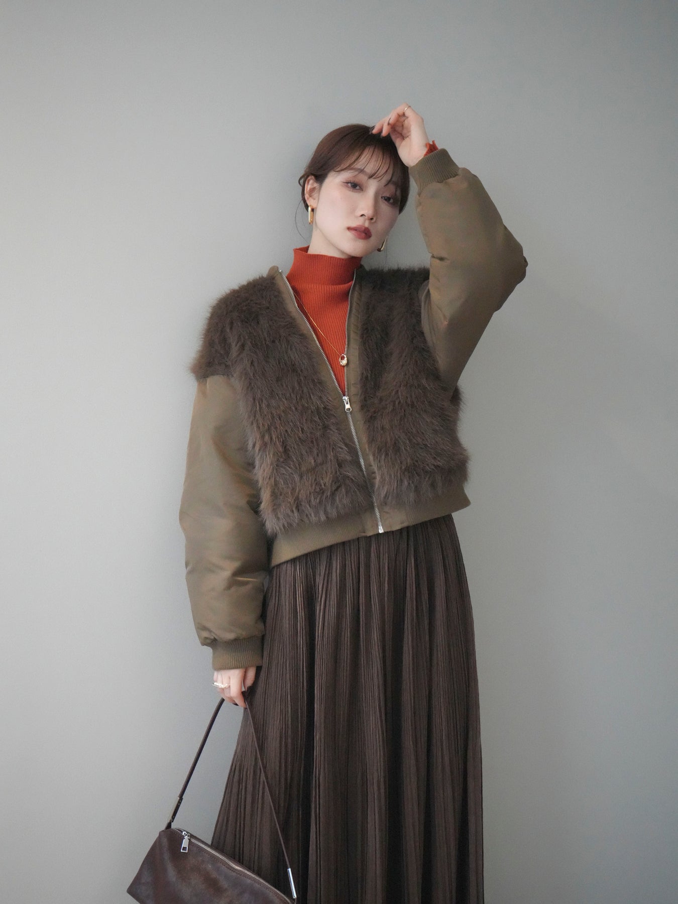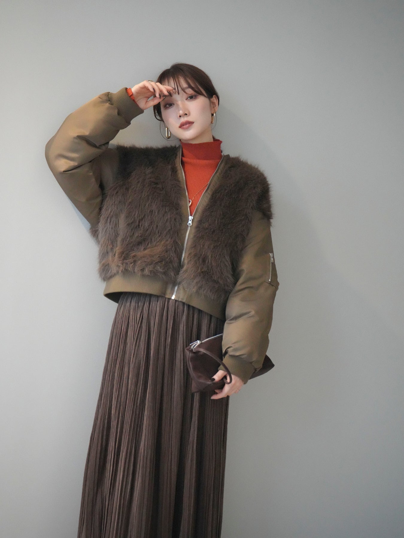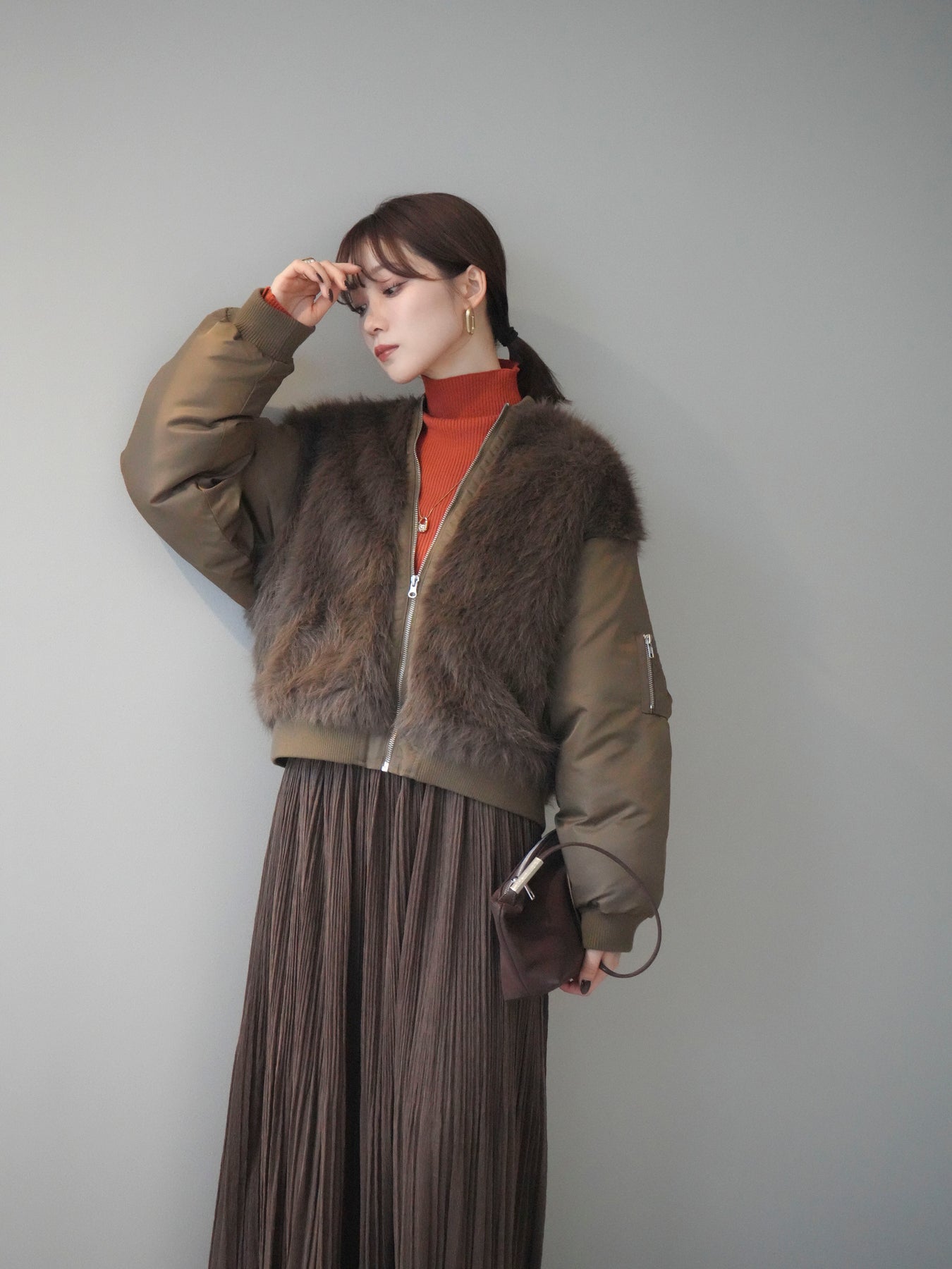 ふわりとしたフェイクファーをフロントに贅沢にあしらった、存在感抜群のドッキングMA-1ブルゾン。異素材の組み合わせがコーデに奥行きを生み、定番のMA-1に上品なニュアンスをプラスしています。身頃は程よくゆとりのあるシルエットで、厚手のニットの上からも羽織りやすいバランスに。ファー部分が視線を引き上げるため、スタイルアップ効果も期待できます。カジュアルにもきれいめにも合わせやすく、1枚で着映えする主役アウターです。 ※ボトムス、キャミソール(インナー)以外の商品は一律でインナーは付属していません。