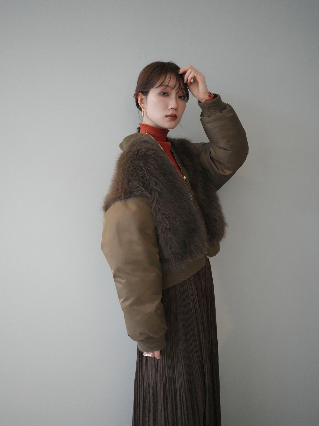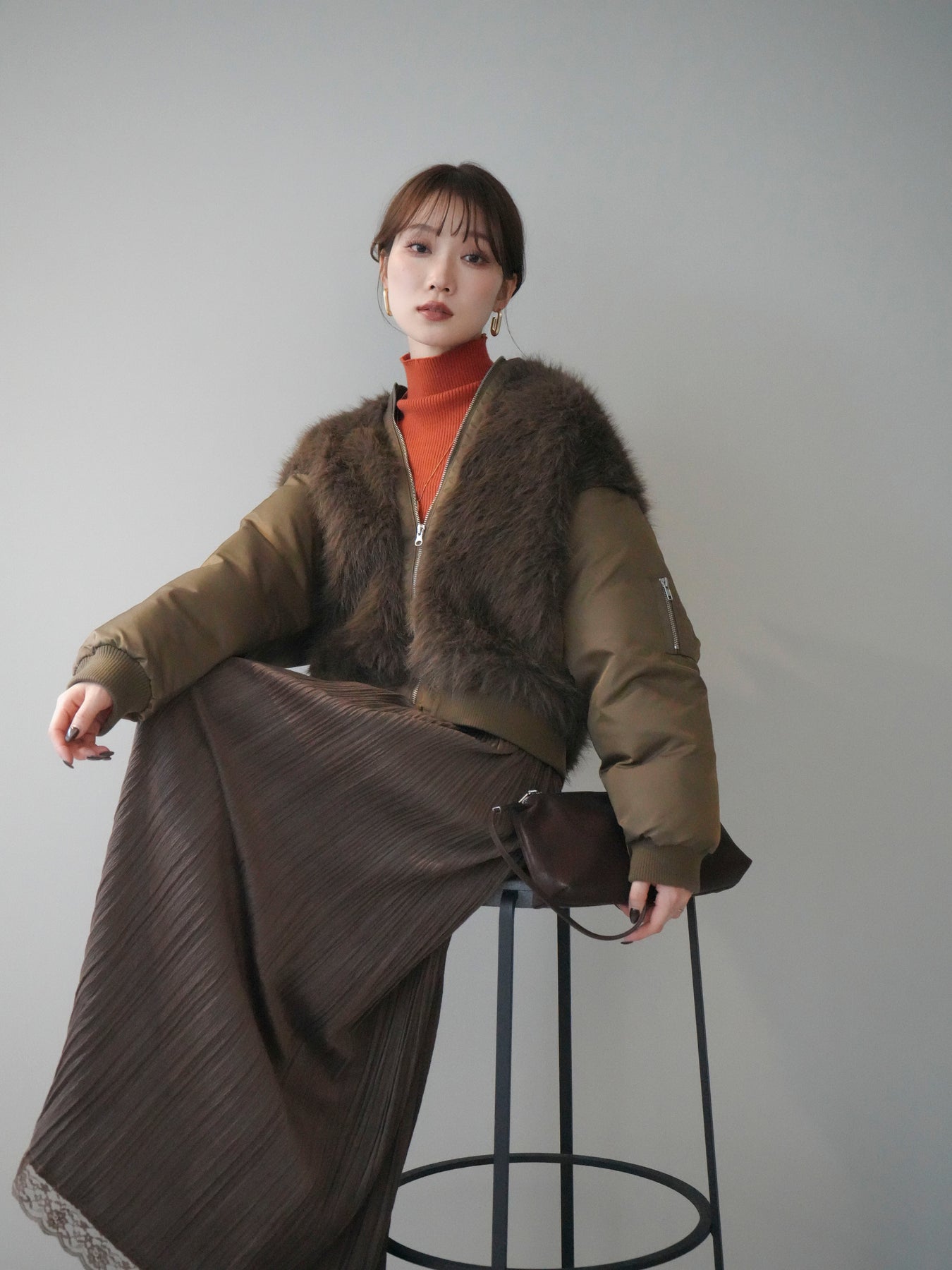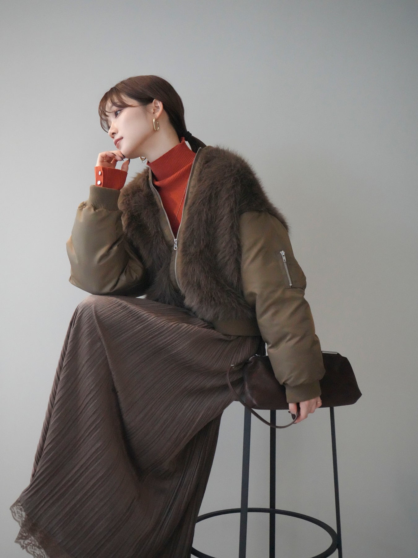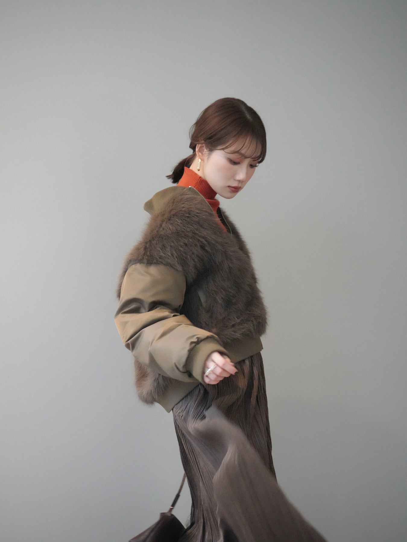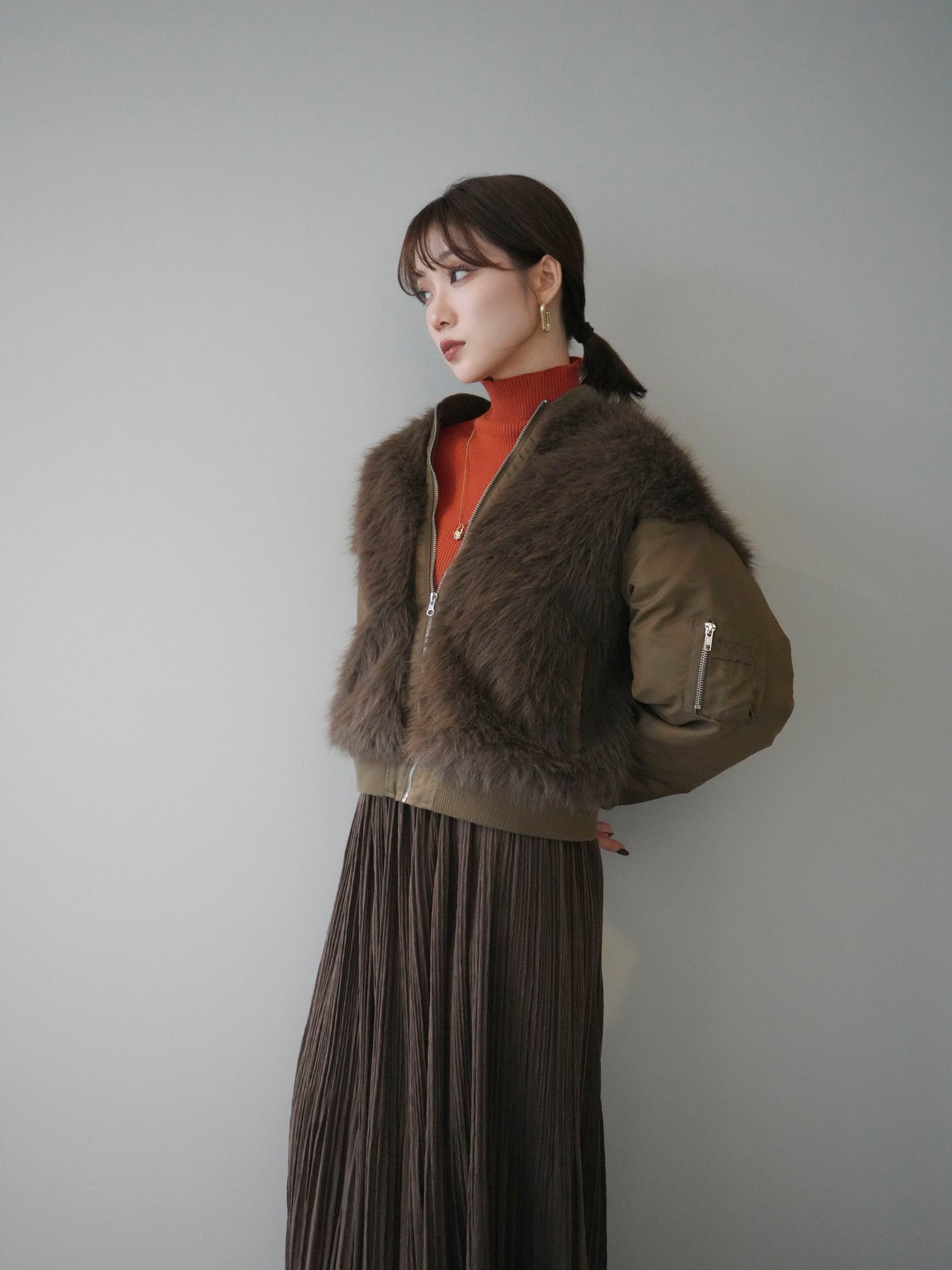 ふわりとしたフェイクファーをフロントに贅沢にあしらった、存在感抜群のドッキングMA-1ブルゾン。異素材の組み合わせがコーデに奥行きを生み、定番のMA-1に上品なニュアンスをプラスしています。身頃は程よくゆとりのあるシルエットで、厚手のニットの上からも羽織りやすいバランスに。ファー部分が視線を引き上げるため、スタイルアップ効果も期待できます。カジュアルにもきれいめにも合わせやすく、1枚で着映えする主役アウターです。 ※ボトムス、キャミソール(インナー)以外の商品は一律でインナーは付属していません。