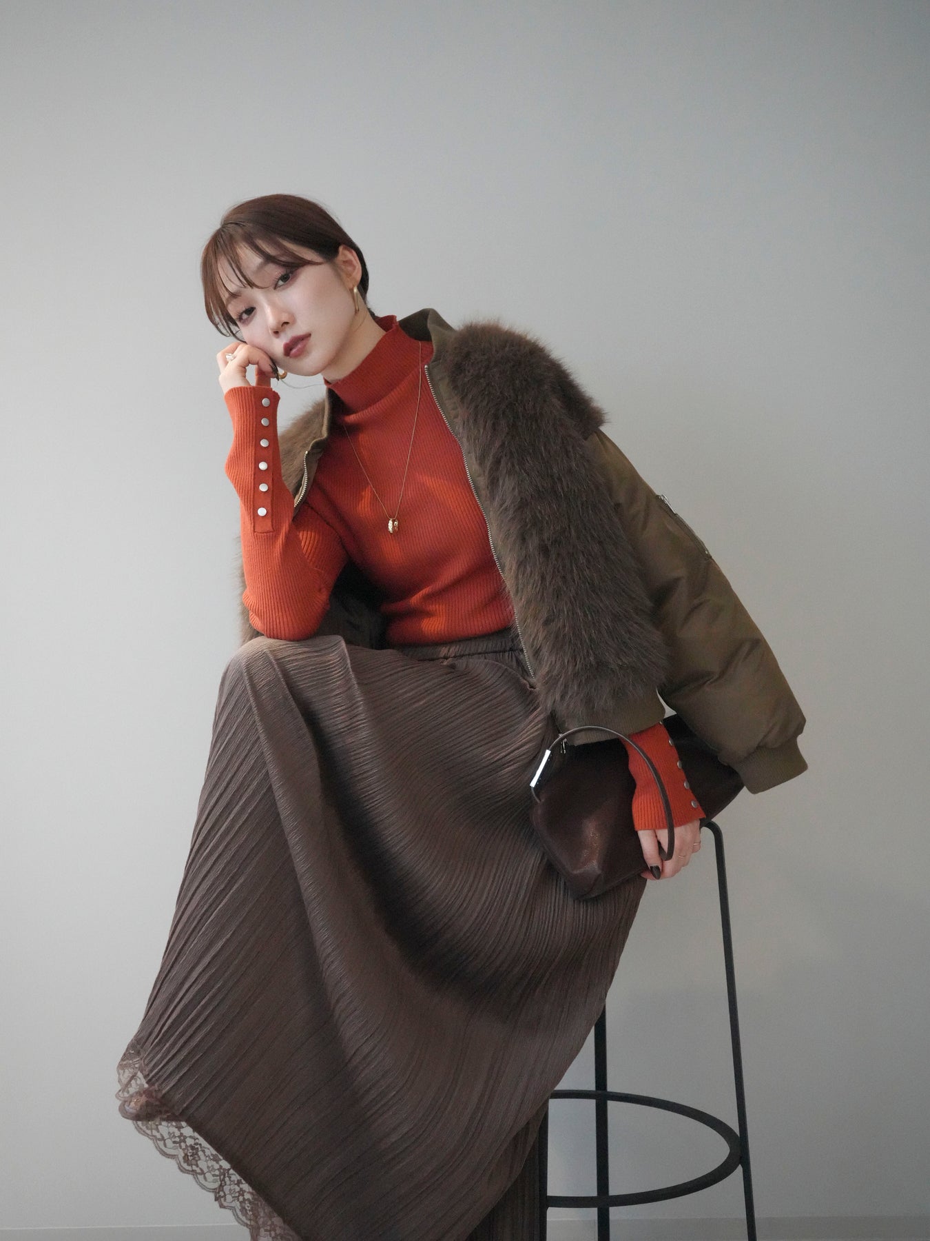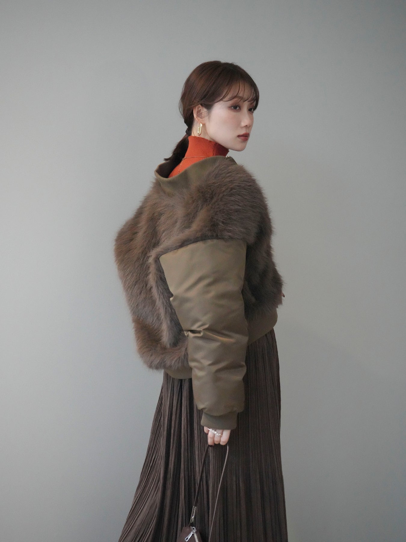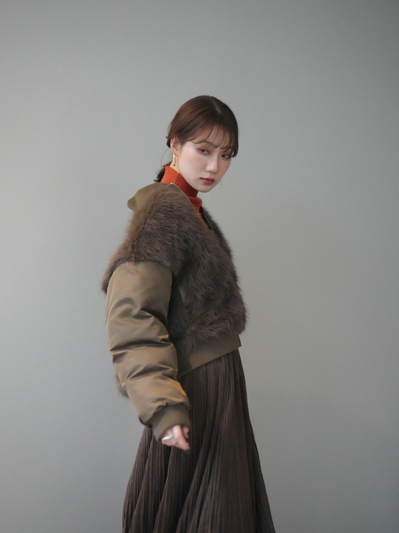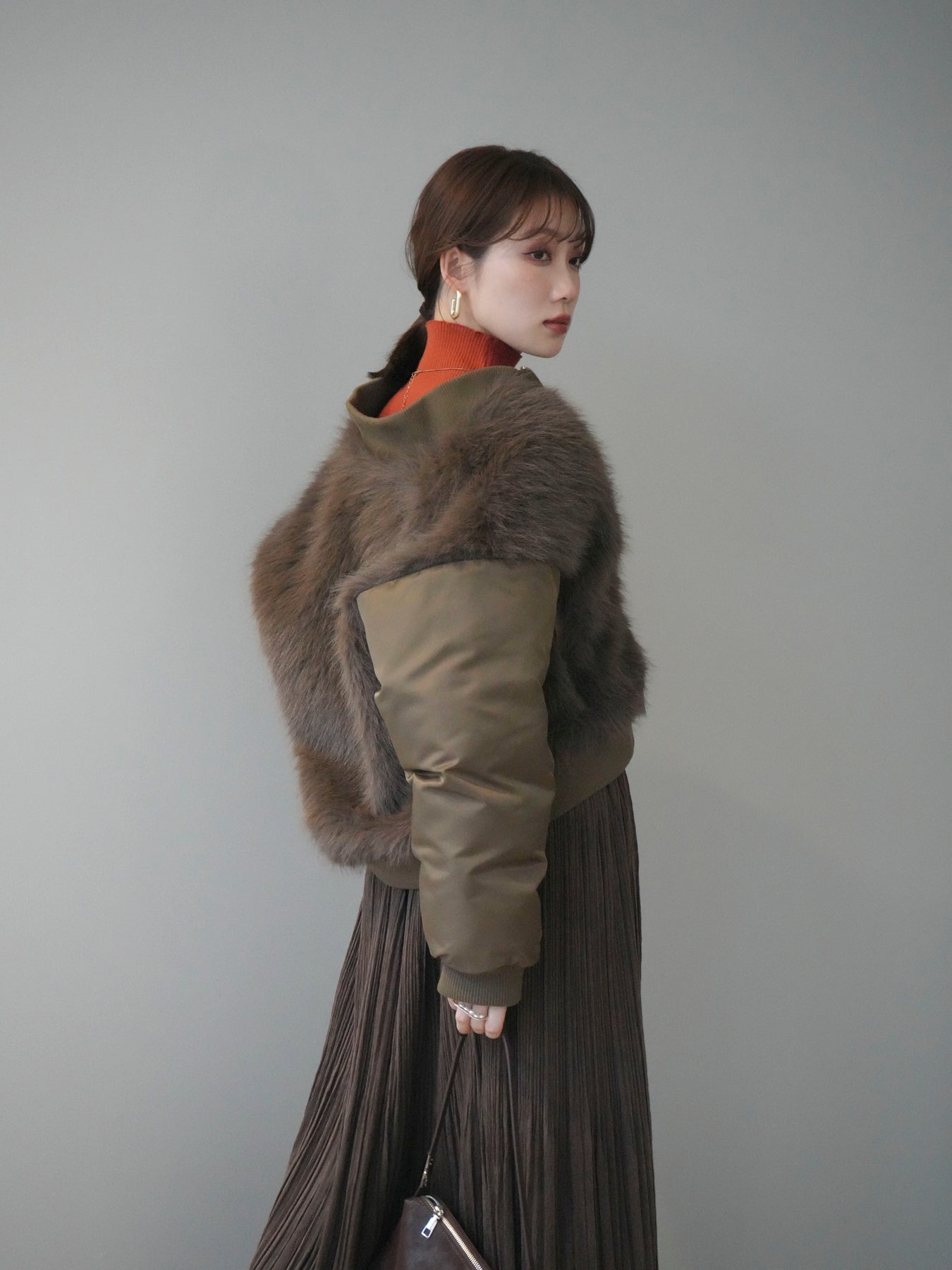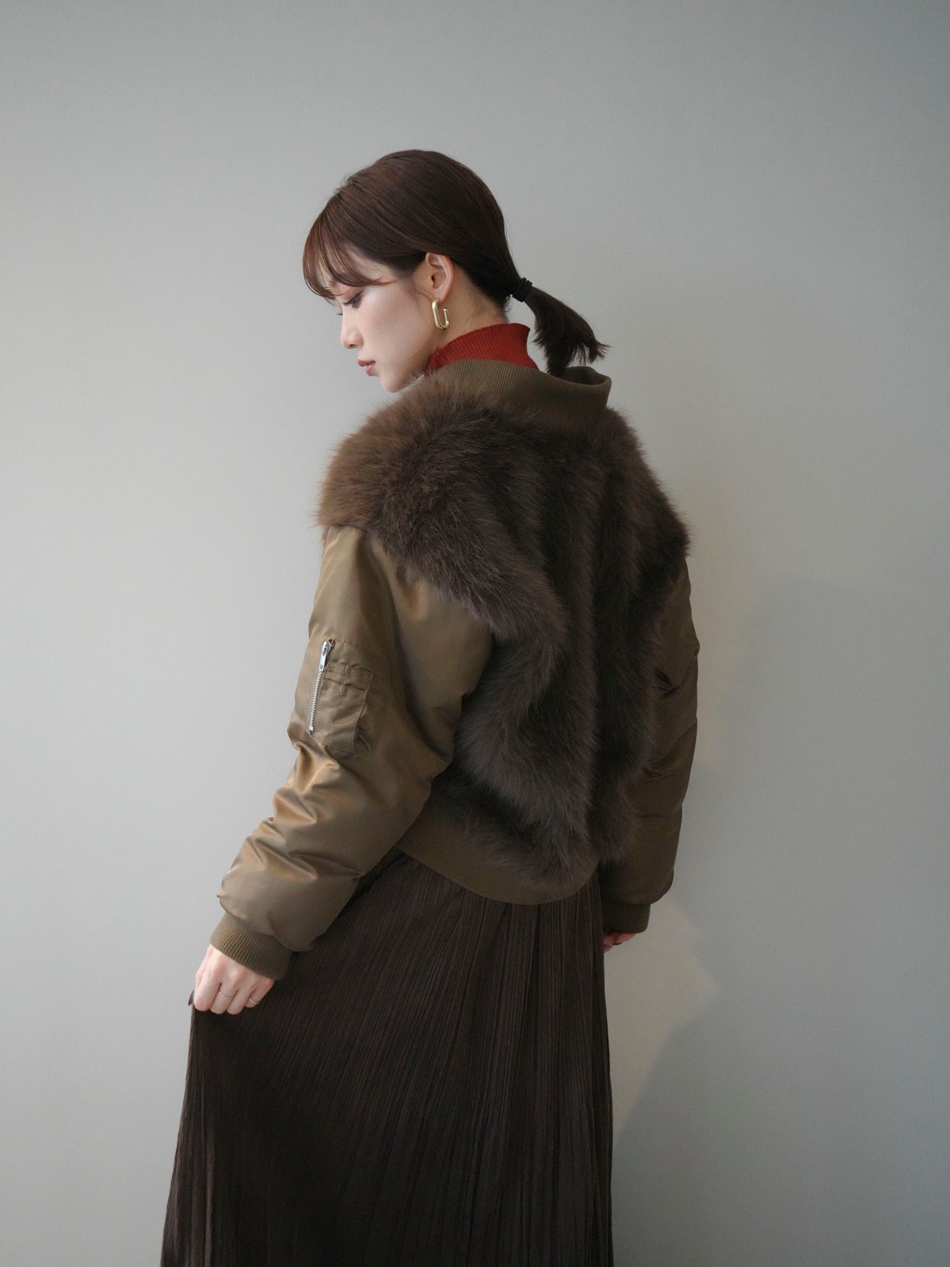 ふわりとしたフェイクファーをフロントに贅沢にあしらった、存在感抜群のドッキングMA-1ブルゾン。異素材の組み合わせがコーデに奥行きを生み、定番のMA-1に上品なニュアンスをプラスしています。身頃は程よくゆとりのあるシルエットで、厚手のニットの上からも羽織りやすいバランスに。ファー部分が視線を引き上げるため、スタイルアップ効果も期待できます。カジュアルにもきれいめにも合わせやすく、1枚で着映えする主役アウターです。 ※ボトムス、キャミソール(インナー)以外の商品は一律でインナーは付属していません。