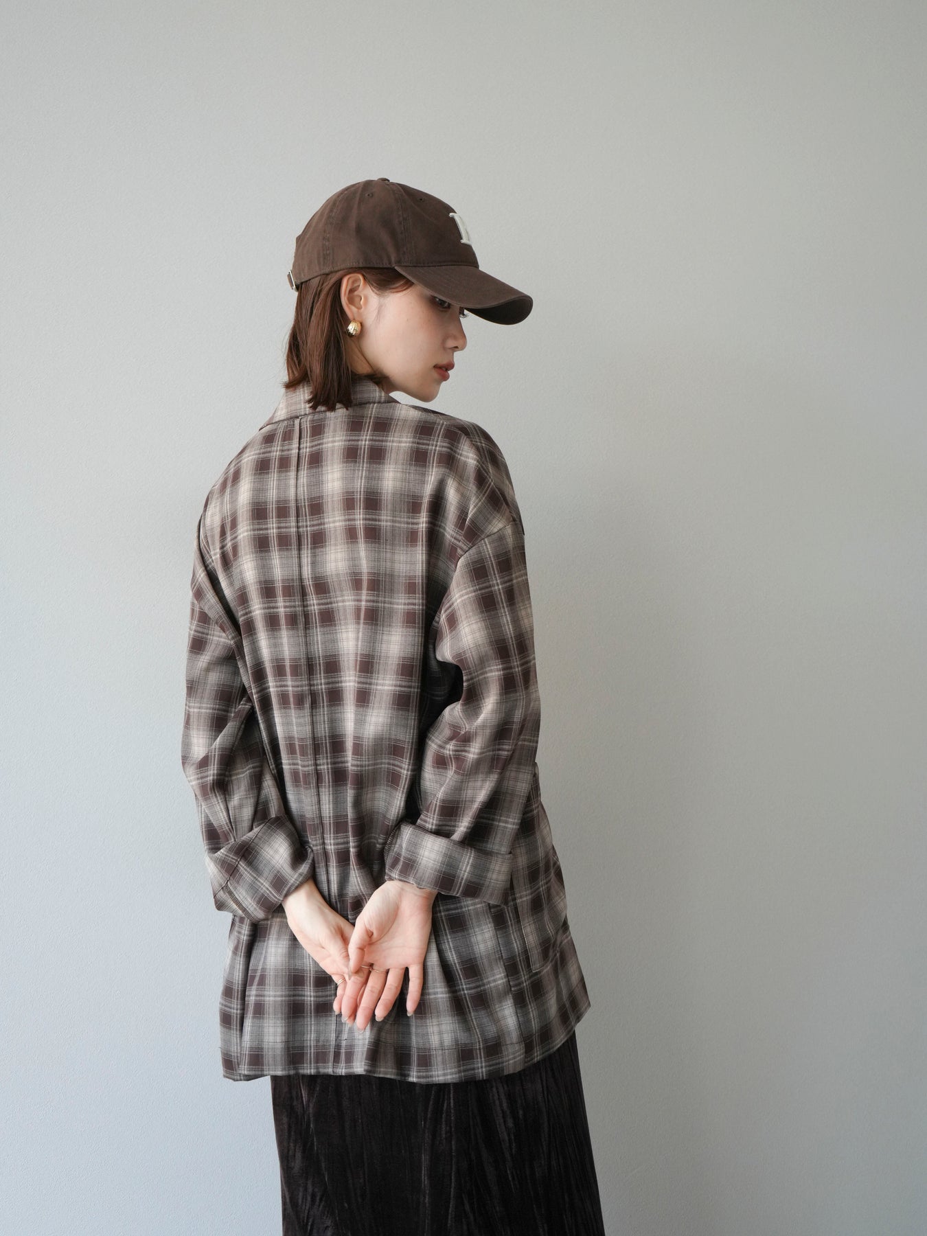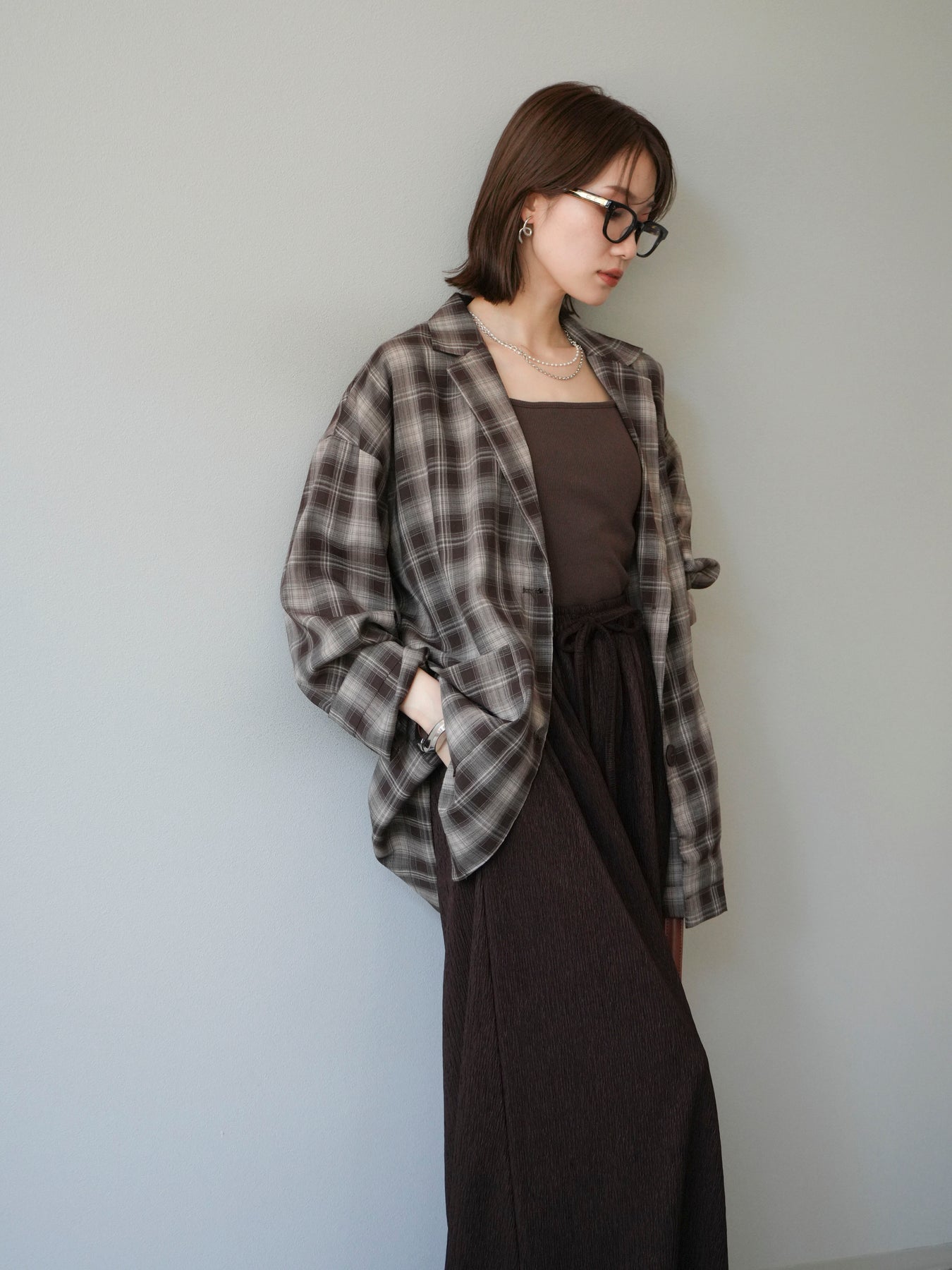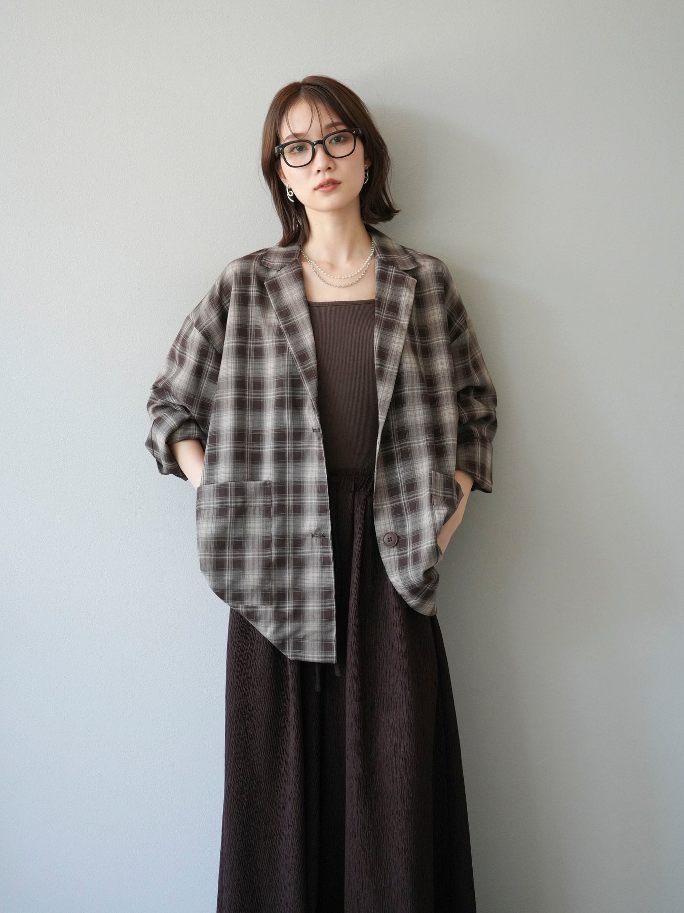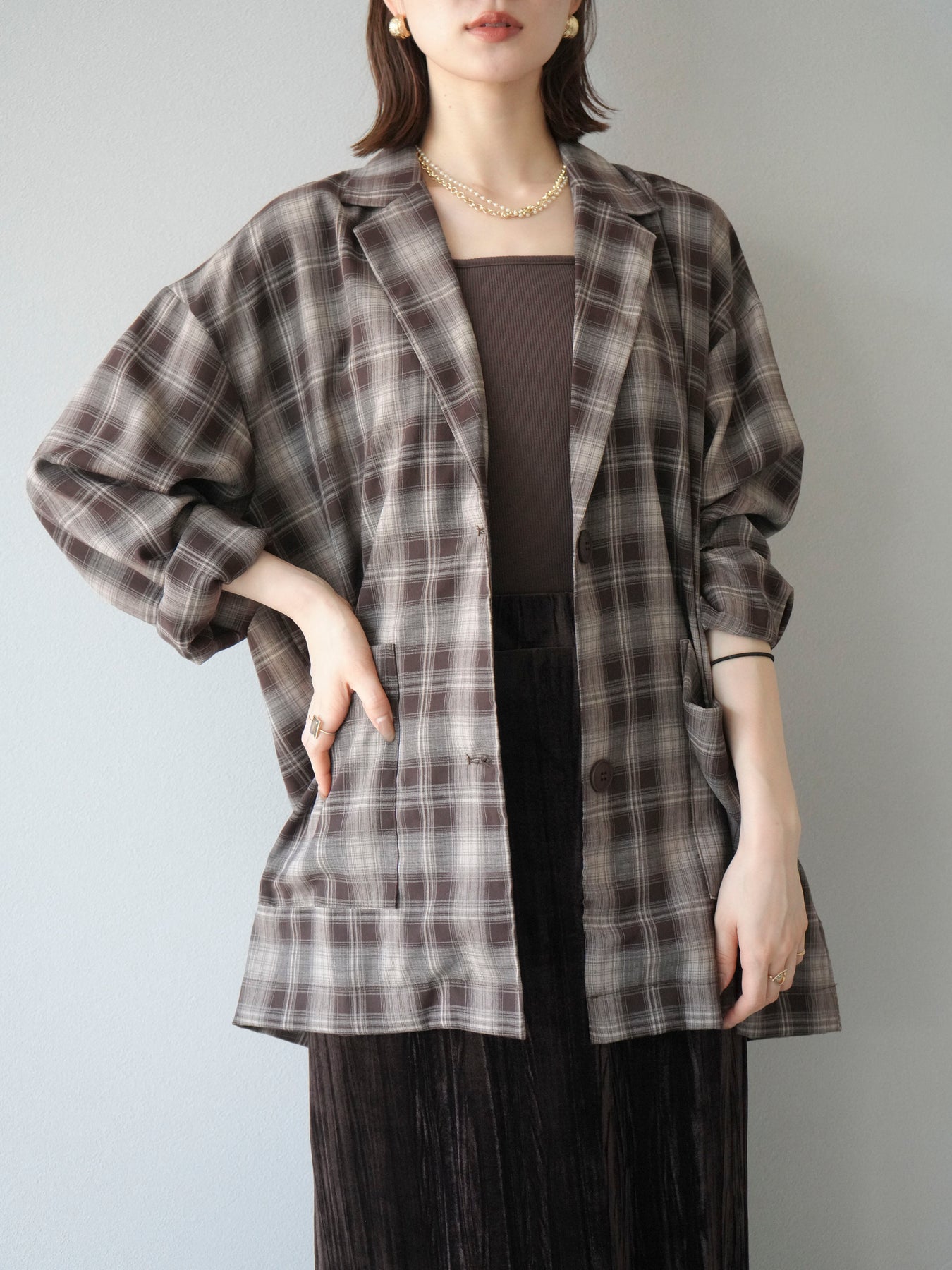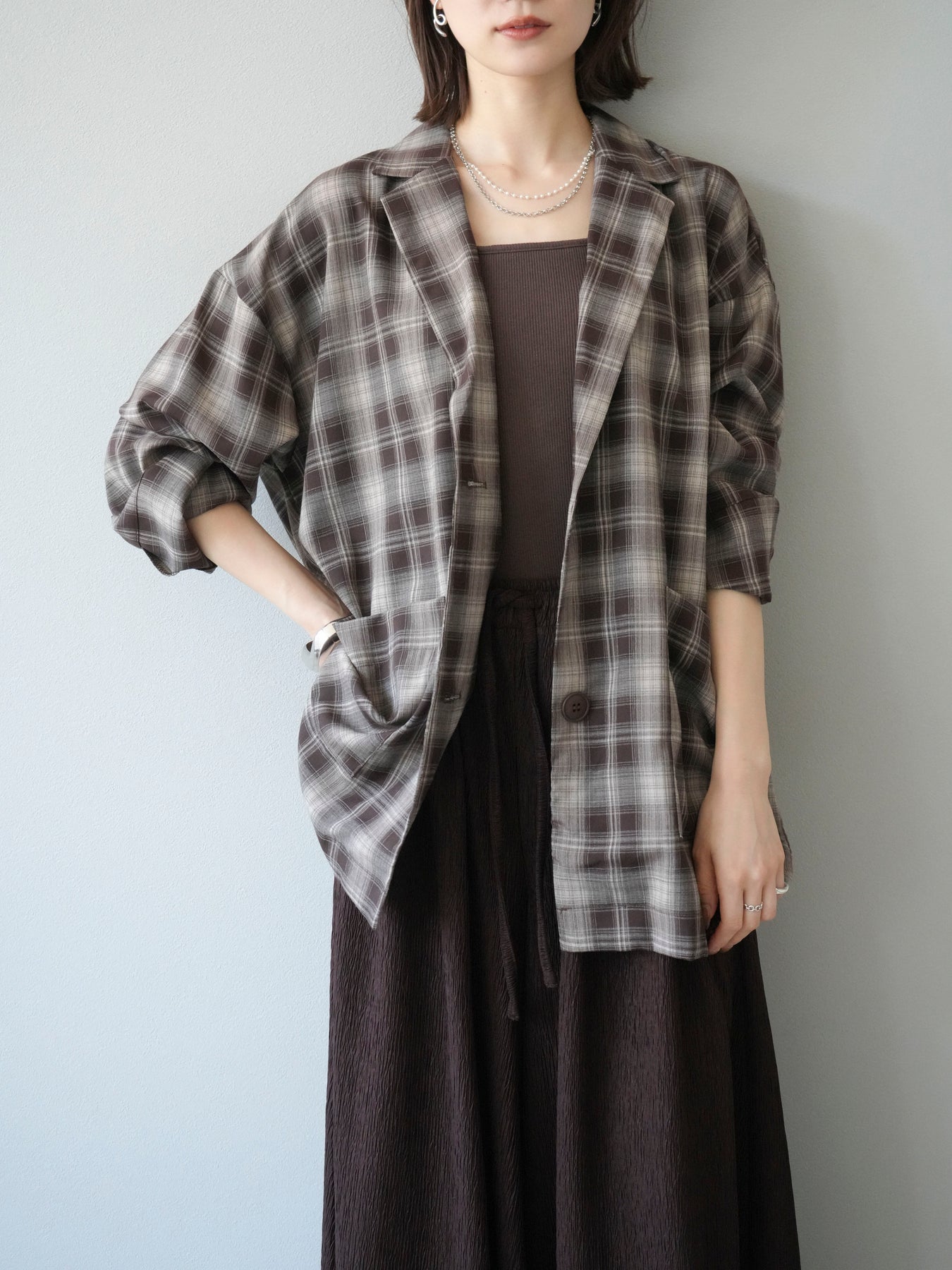 軽やかなシャツ感覚で羽織れるチェック柄のジャケット。程よくリラックスしたシルエットに仕上げることで、抜け感のあるスタイリングを叶えてくれます。さらりとした素材感でシーズンを問わず着やすく、Tシャツやカットソーに合わせてカジュアルに、ブラウスやニットに重ねてきれいめにと幅広いコーディネートに対応。フロントのポケットがさりげないアクセントとなり、実用性も兼ね備えています。デイリー使いからライトアウターとしてまで活躍する万能アイテムです。 ※ボトムス、キャミソール(インナー)以外の商品は一律でインナーは付属していません。