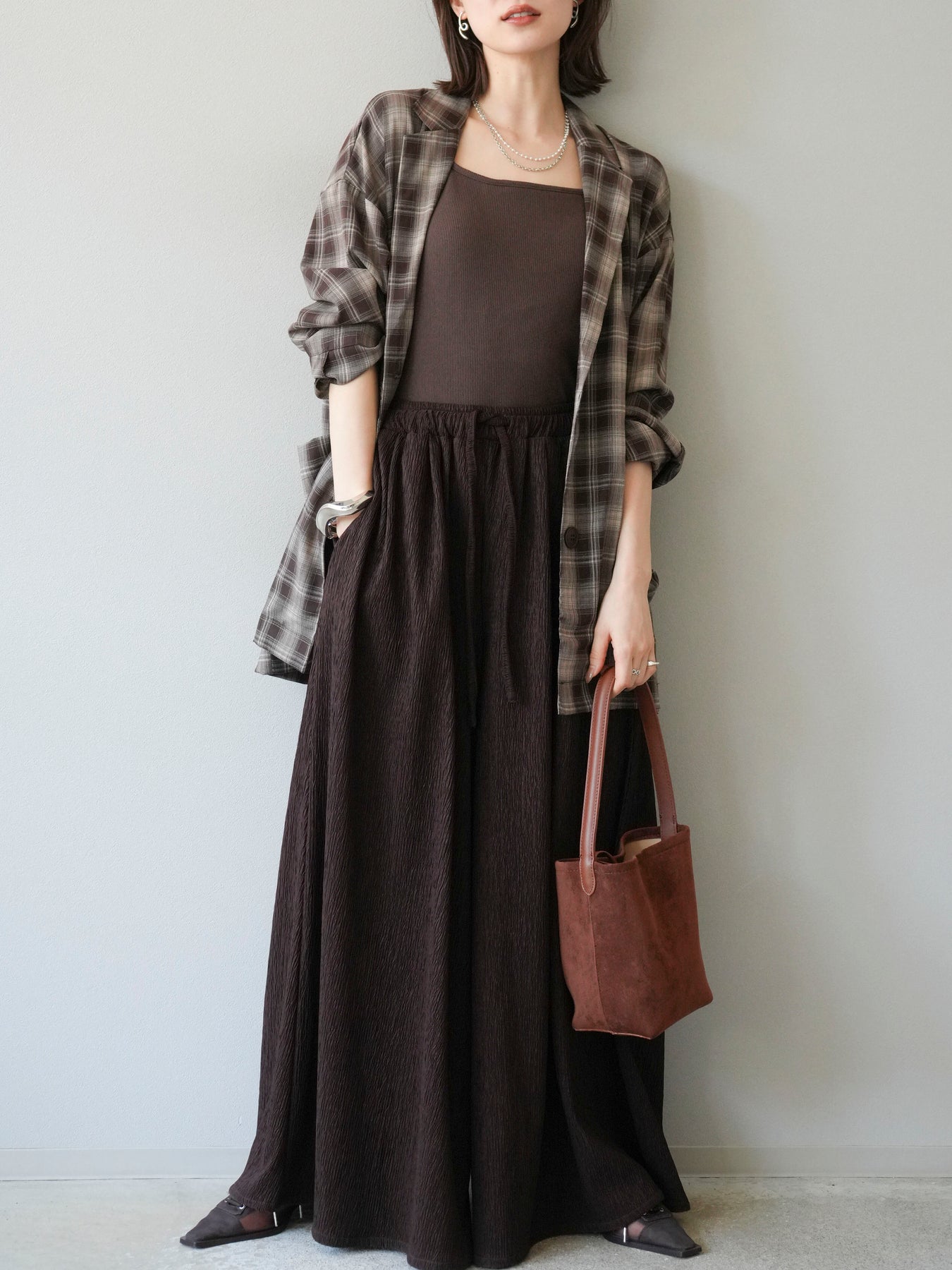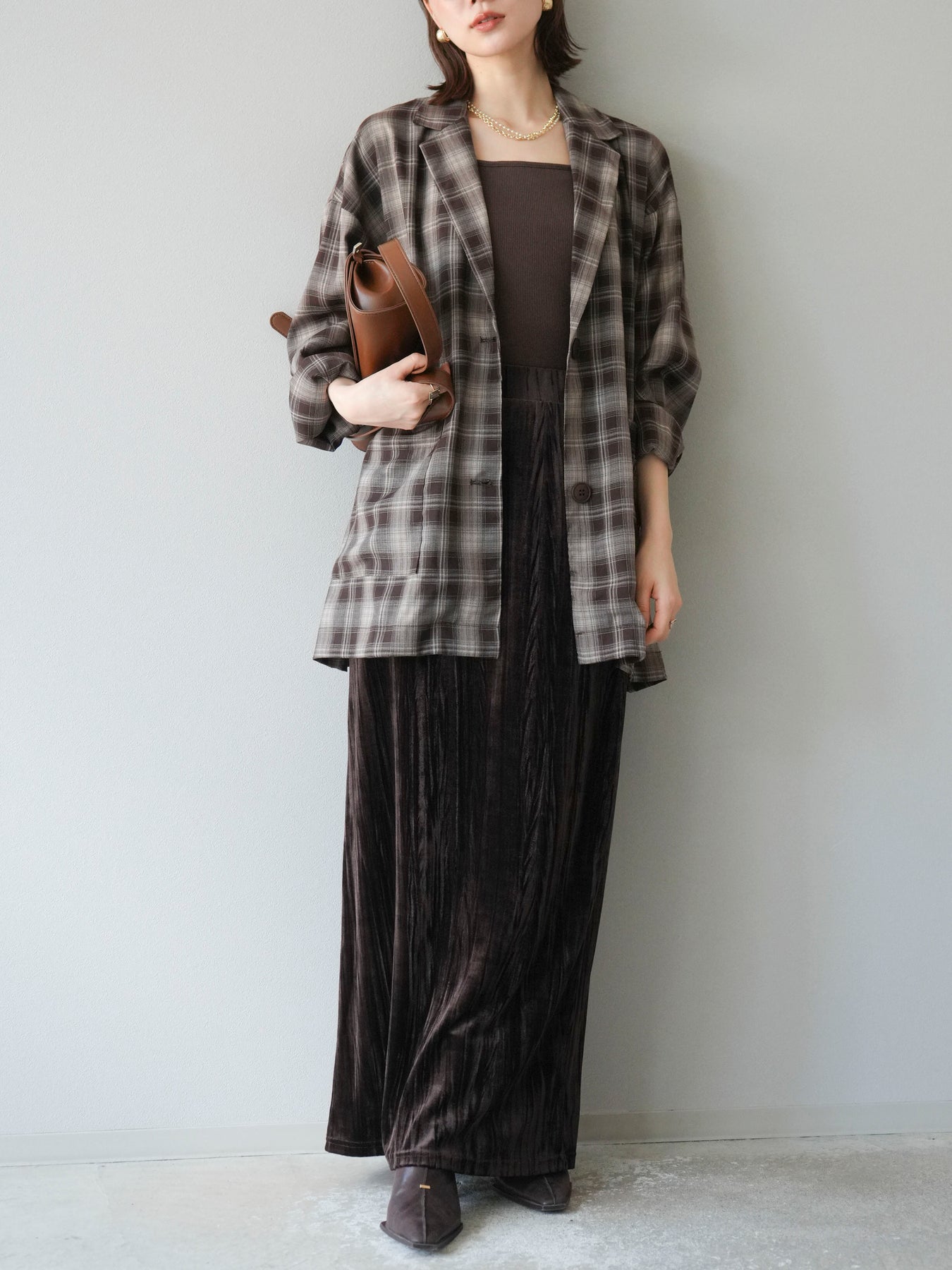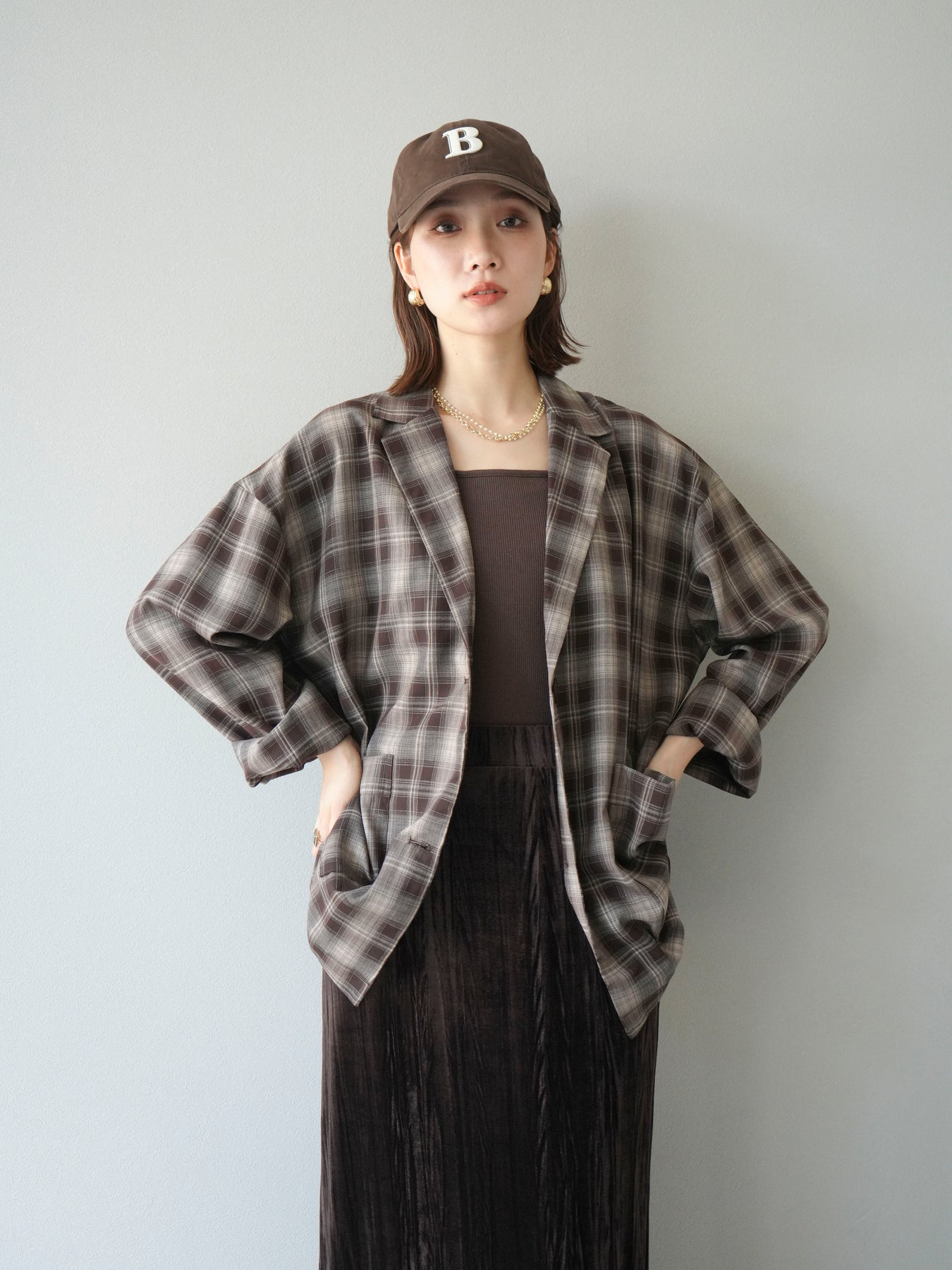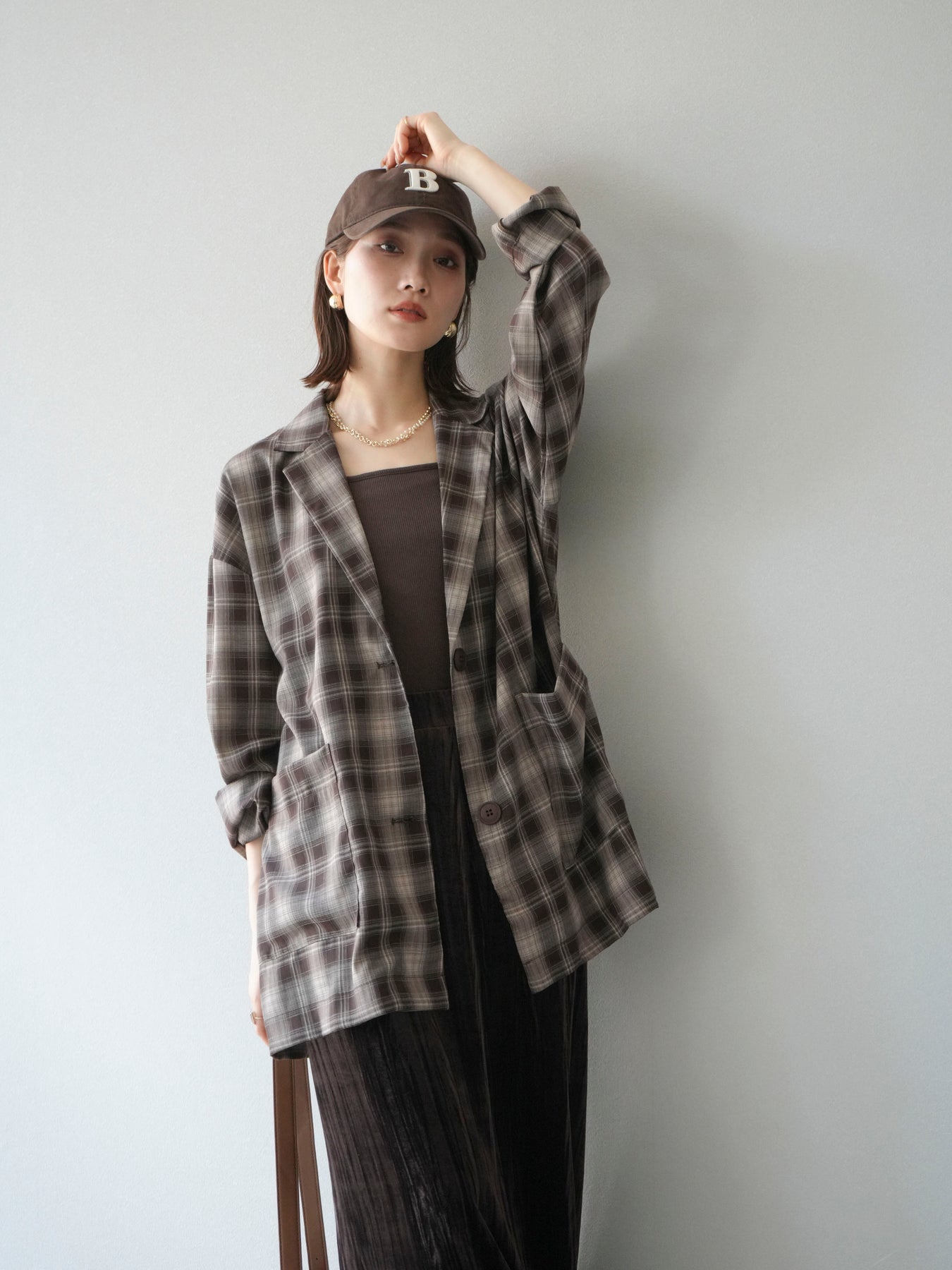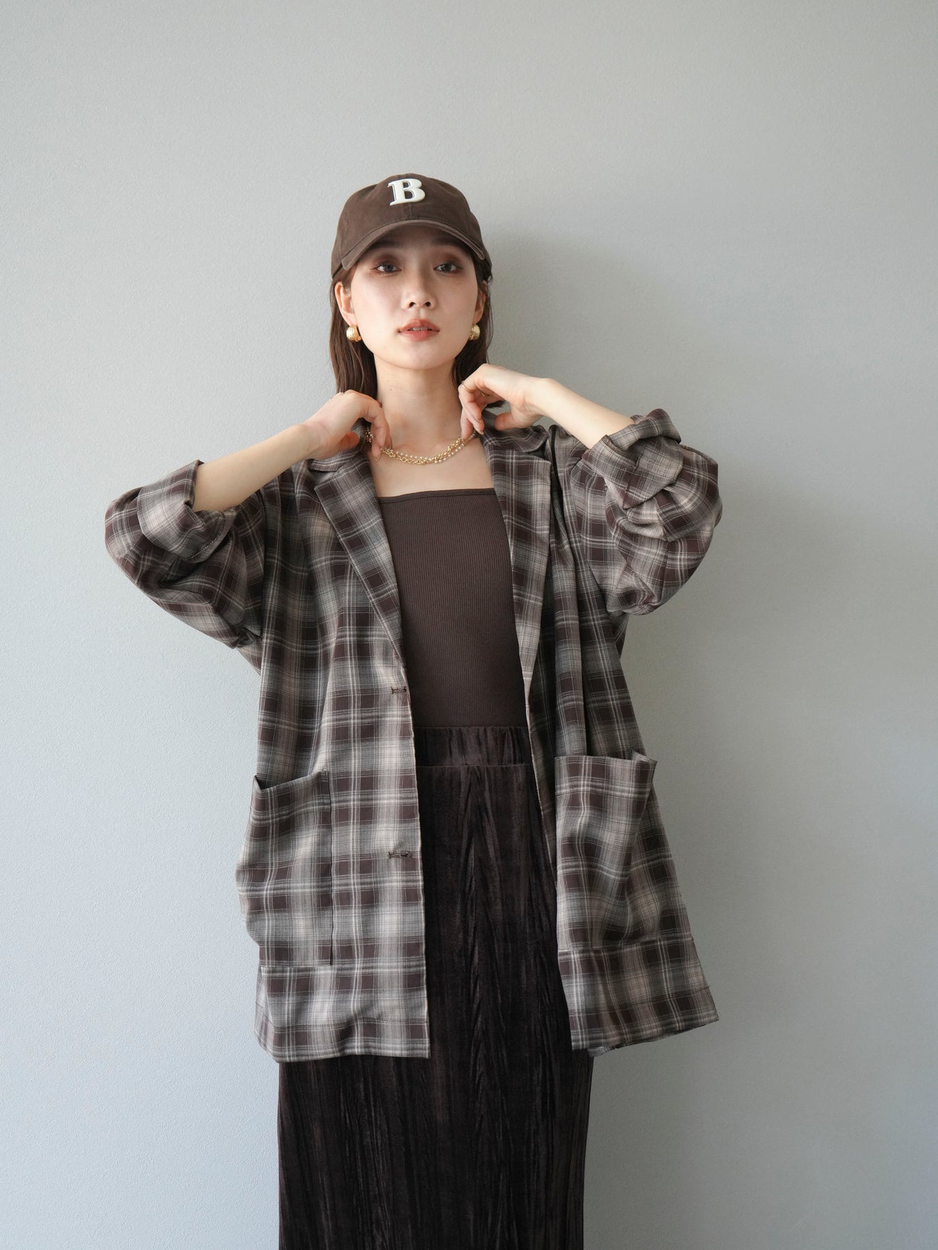 軽やかなシャツ感覚で羽織れるチェック柄のジャケット。程よくリラックスしたシルエットに仕上げることで、抜け感のあるスタイリングを叶えてくれます。さらりとした素材感でシーズンを問わず着やすく、Tシャツやカットソーに合わせてカジュアルに、ブラウスやニットに重ねてきれいめにと幅広いコーディネートに対応。フロントのポケットがさりげないアクセントとなり、実用性も兼ね備えています。デイリー使いからライトアウターとしてまで活躍する万能アイテムです。 ※ボトムス、キャミソール(インナー)以外の商品は一律でインナーは付属していません。
