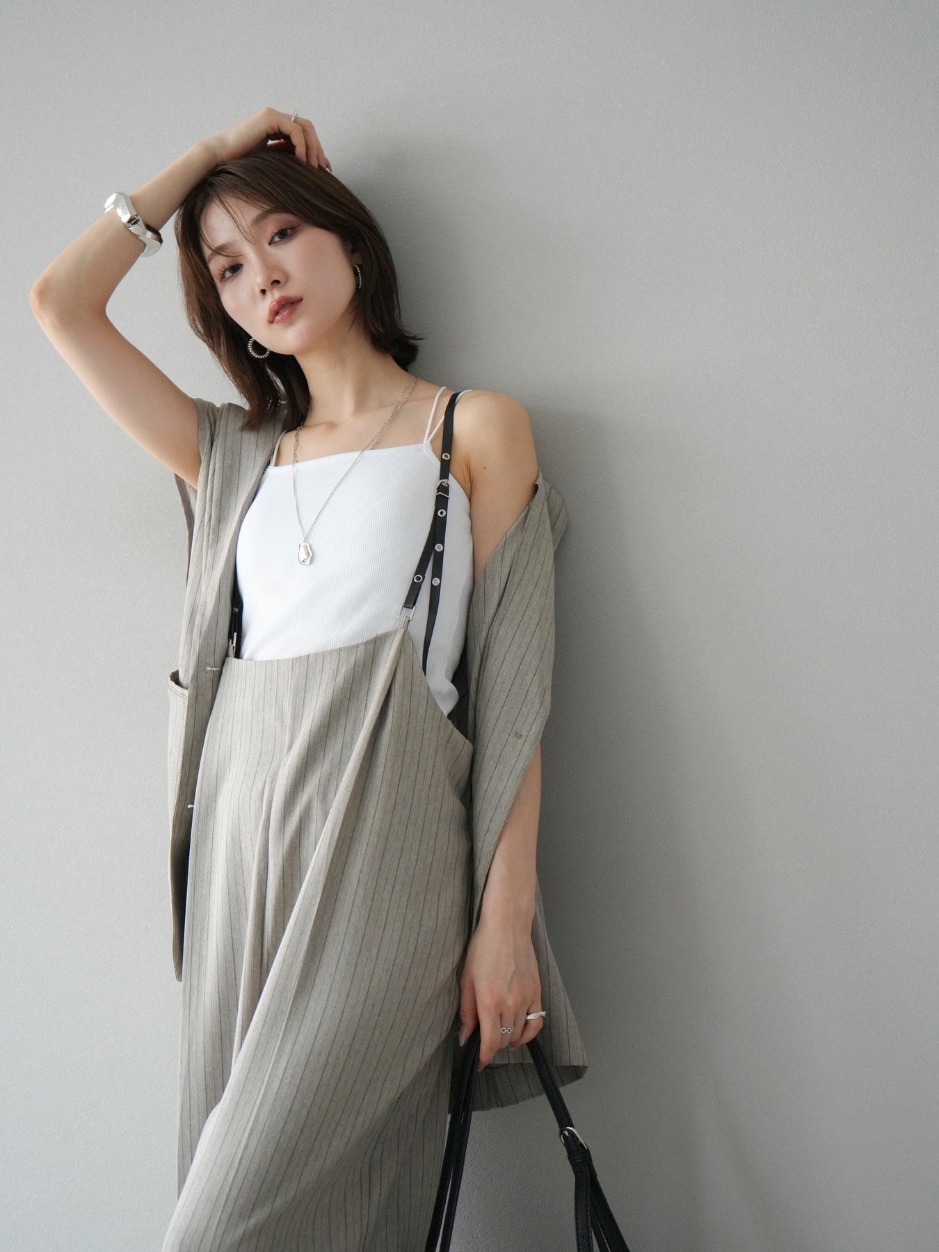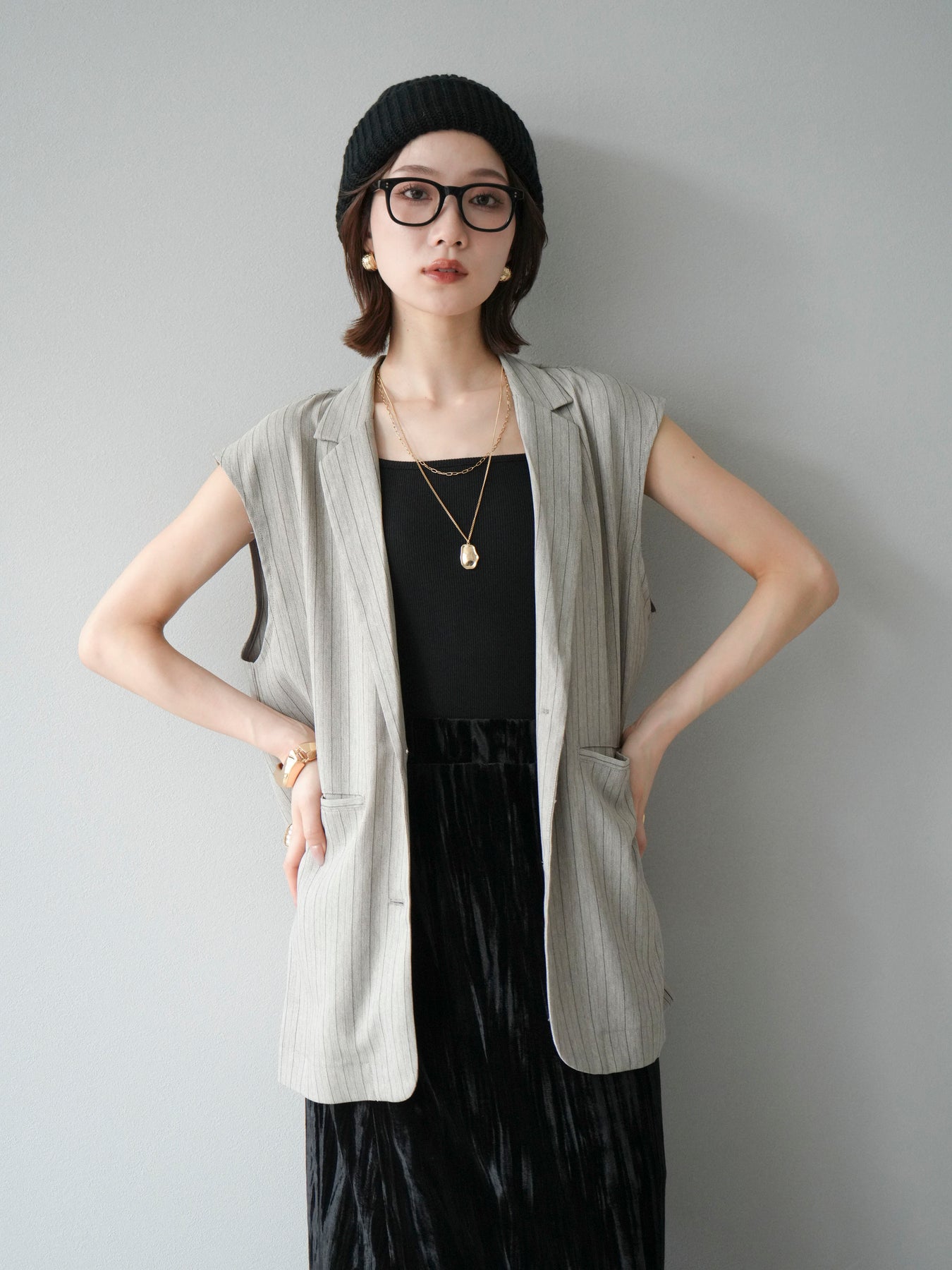 クラシカルなヘリンボーンストライプ柄が印象的なジレ。すとんと落ちるIラインシルエットで縦のラインを強調し、羽織るだけでスタイリッシュな雰囲気を演出します。やや長めの丈感がヒップ周りをさりげなくカバーし、パンツにもスカートにも好相性。フロントのポケットが実用性とデザイン性を兼ね備え、シンプルなコーディネートにプラスするだけで着映えするアイテムです。インナーを変えることでロングシーズン活躍し、オンオフ問わず幅広いシーンに対応できる万能ジレです。 ※ボトムス、キャミソール(インナー)以外の商品は一律でインナーは付属していません。