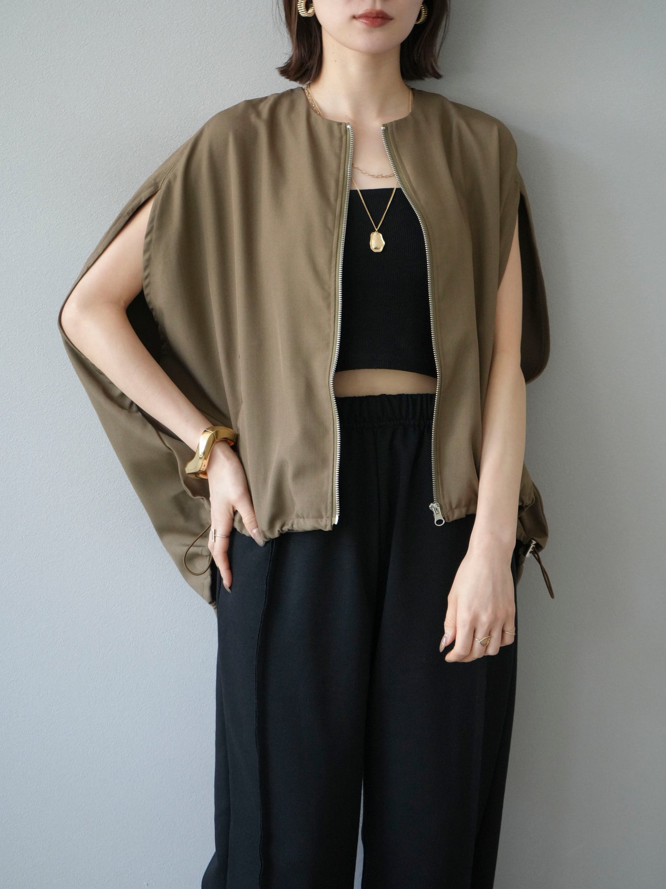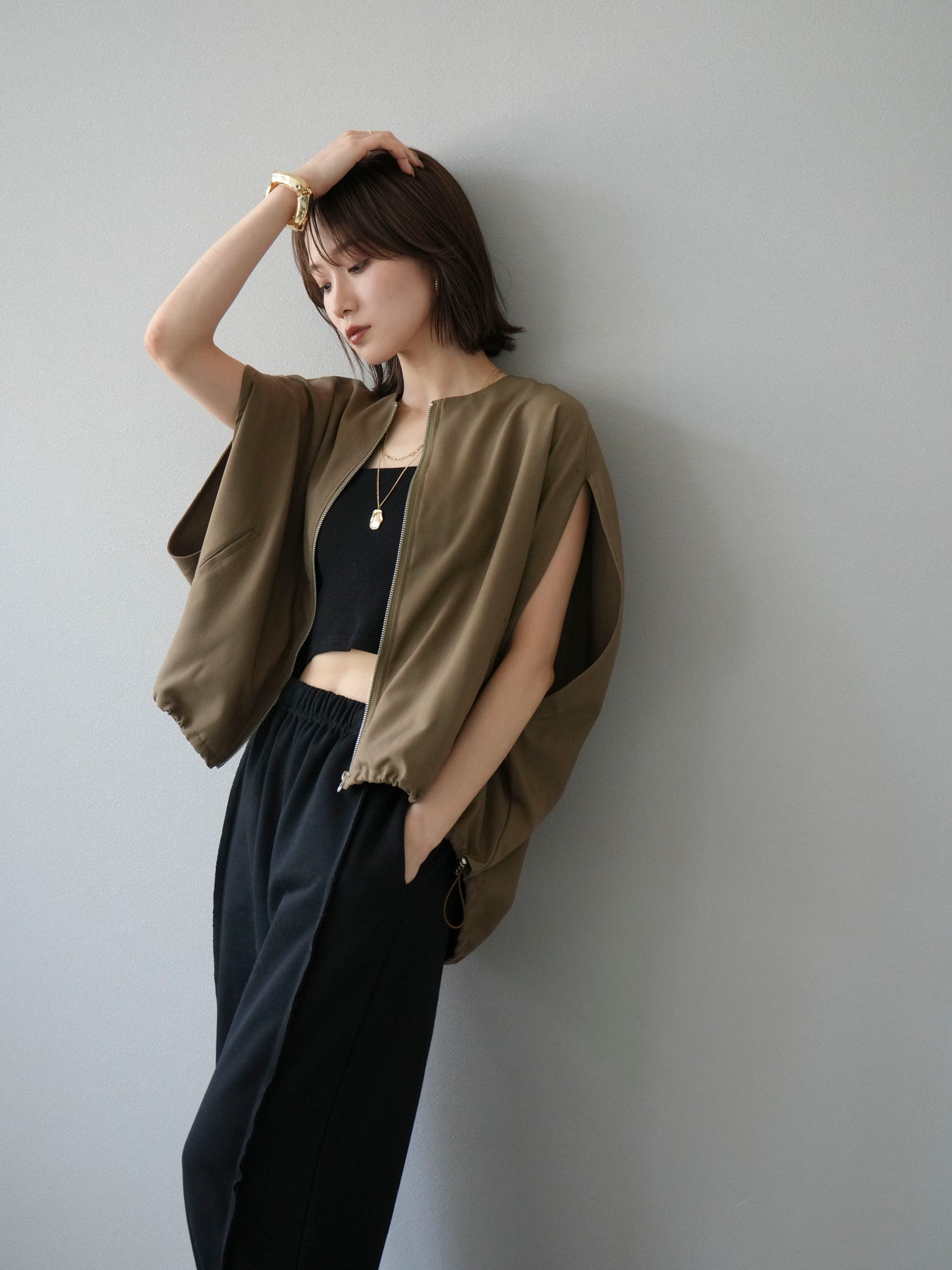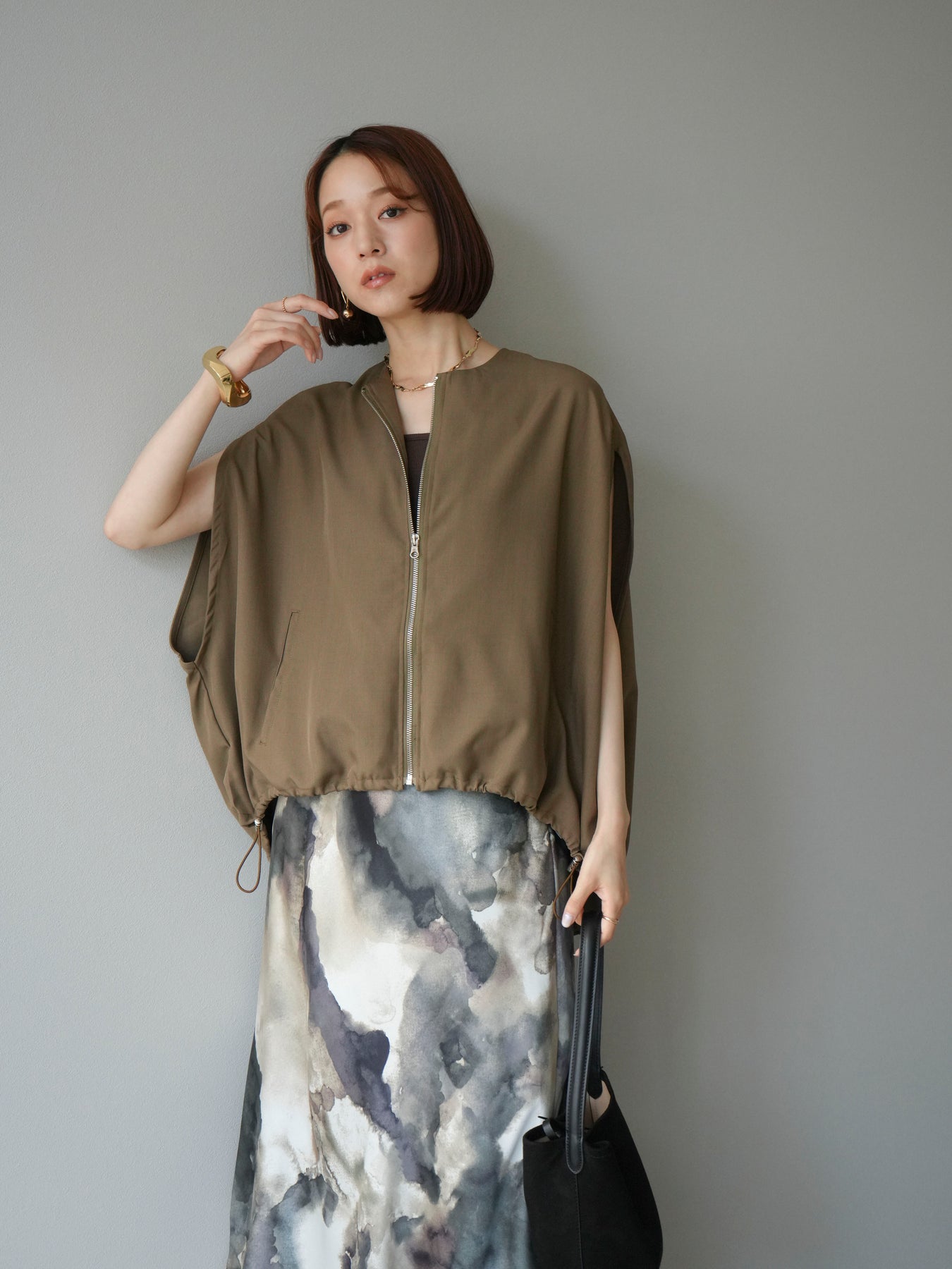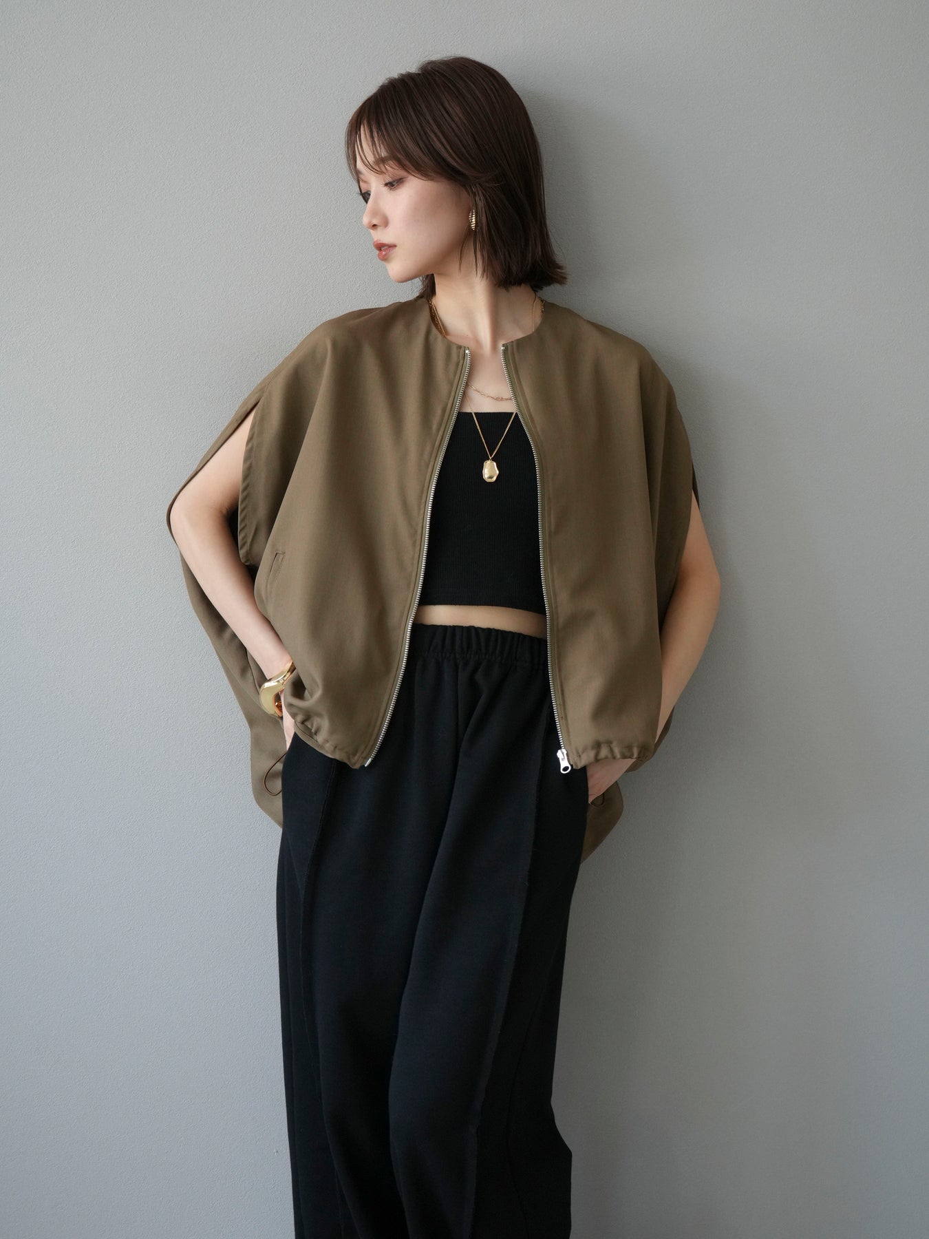 ノーカラーですっきりと仕上げたスリーブレスブルゾン。軽やかな着心地でシーズンレスに取り入れやすく、フロントZIP仕様で着脱もスムーズです。裾にはドロストコードを施し、シルエットに変化をつけられるのもポイント。ゆとりのあるアームホールデザインでレイヤードがしやすく、シャツやカットソーの上から羽織るだけでトレンド感のあるスタイリングが完成します。スポーティーさとモード感を兼ね備えた、デイリーからアクティブシーンまで活躍する万能アイテムです。 ※ボトムス、キャミソール(インナー)以外の商品は一律でインナーは付属していません。