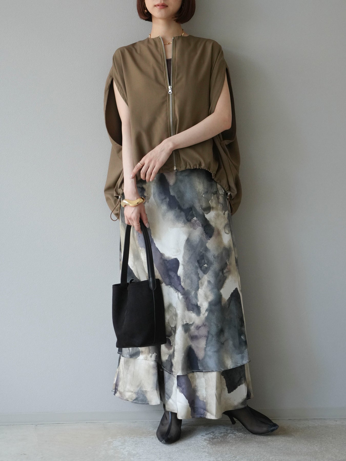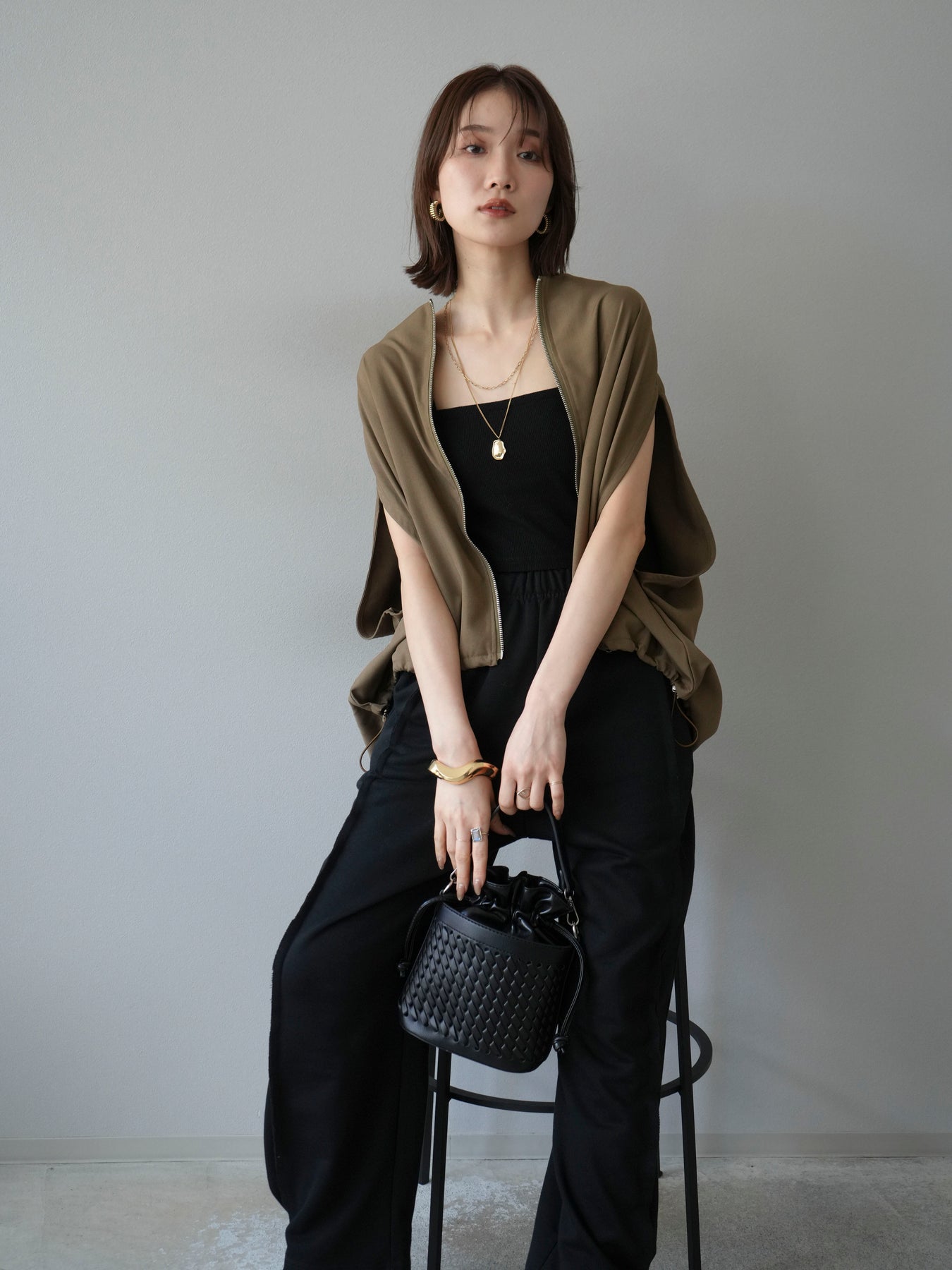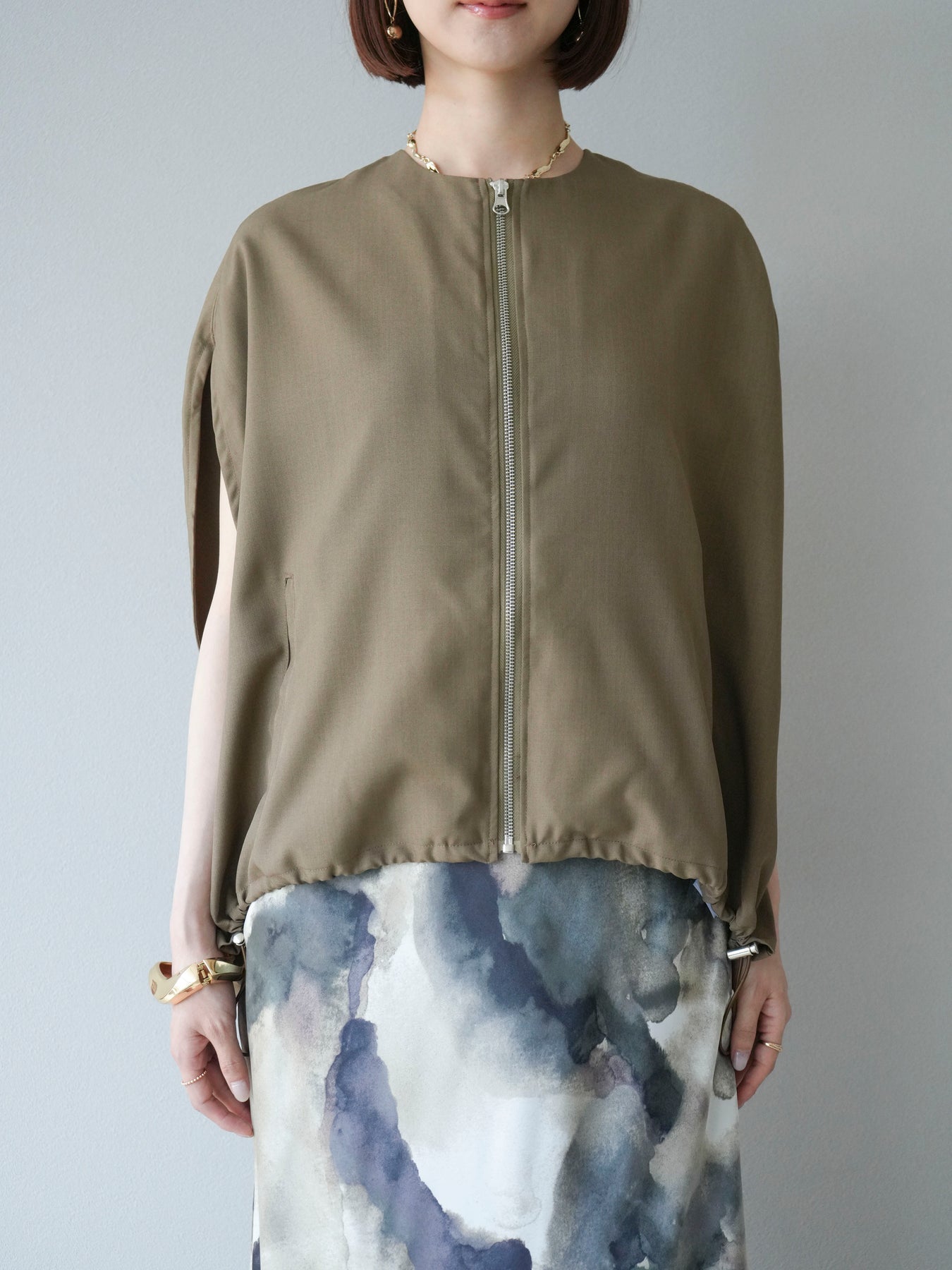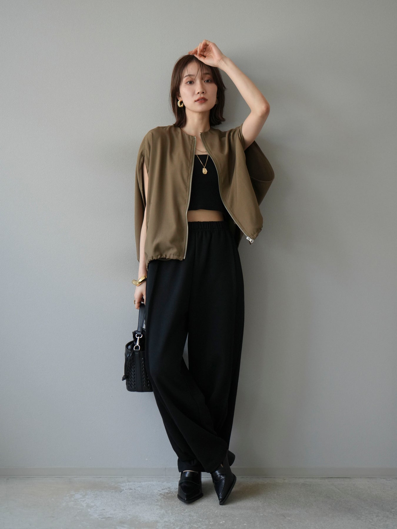 ノーカラーですっきりと仕上げたスリーブレスブルゾン。軽やかな着心地でシーズンレスに取り入れやすく、フロントZIP仕様で着脱もスムーズです。裾にはドロストコードを施し、シルエットに変化をつけられるのもポイント。ゆとりのあるアームホールデザインでレイヤードがしやすく、シャツやカットソーの上から羽織るだけでトレンド感のあるスタイリングが完成します。スポーティーさとモード感を兼ね備えた、デイリーからアクティブシーンまで活躍する万能アイテムです。 ※ボトムス、キャミソール(インナー)以外の商品は一律でインナーは付属していません。