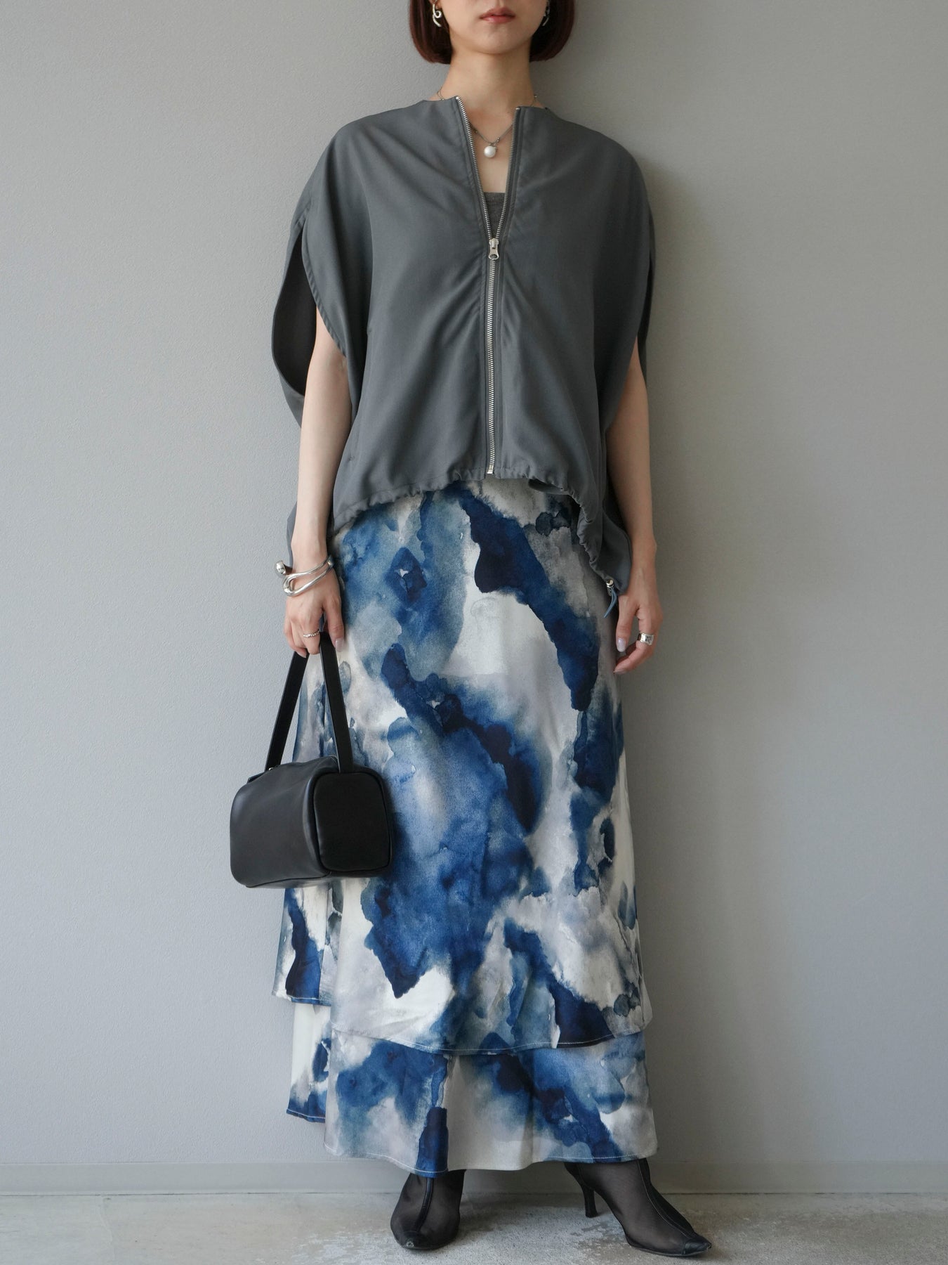 ノーカラーですっきりと仕上げたスリーブレスブルゾン。軽やかな着心地でシーズンレスに取り入れやすく、フロントZIP仕様で着脱もスムーズです。裾にはドロストコードを施し、シルエットに変化をつけられるのもポイント。ゆとりのあるアームホールデザインでレイヤードがしやすく、シャツやカットソーの上から羽織るだけでトレンド感のあるスタイリングが完成します。スポーティーさとモード感を兼ね備えた、デイリーからアクティブシーンまで活躍する万能アイテムです。 ※ボトムス、キャミソール(インナー)以外の商品は一律でインナーは付属していません。