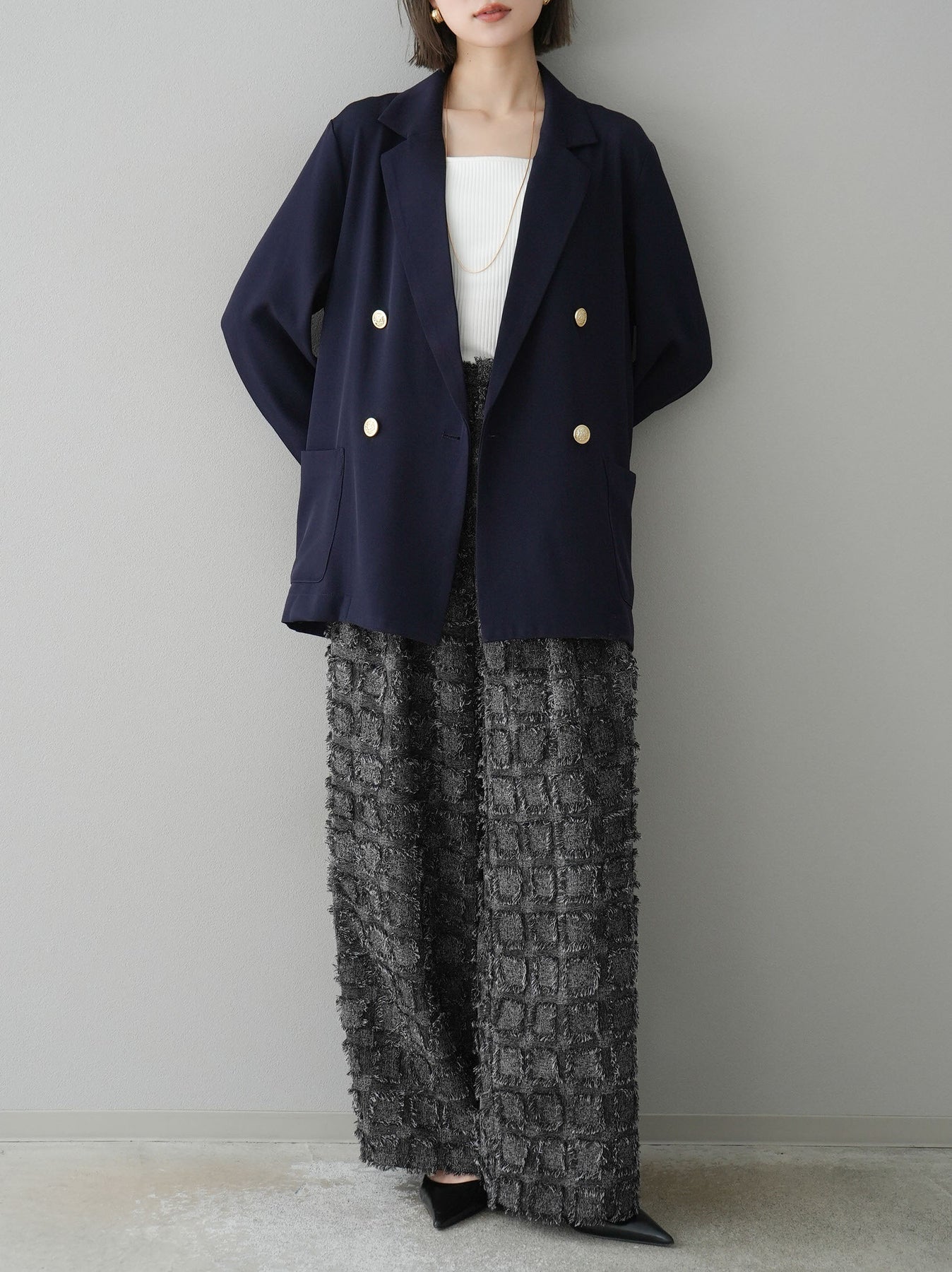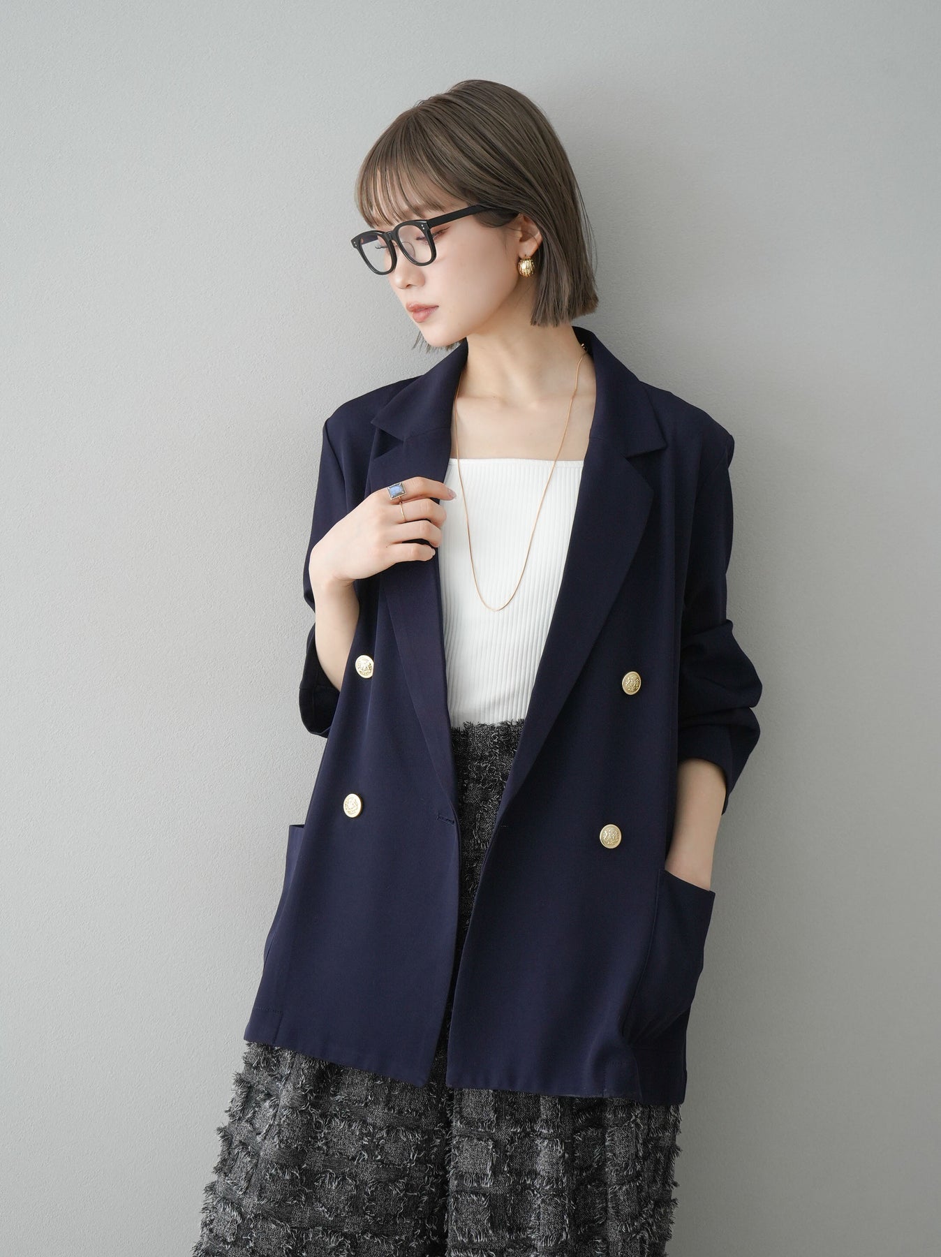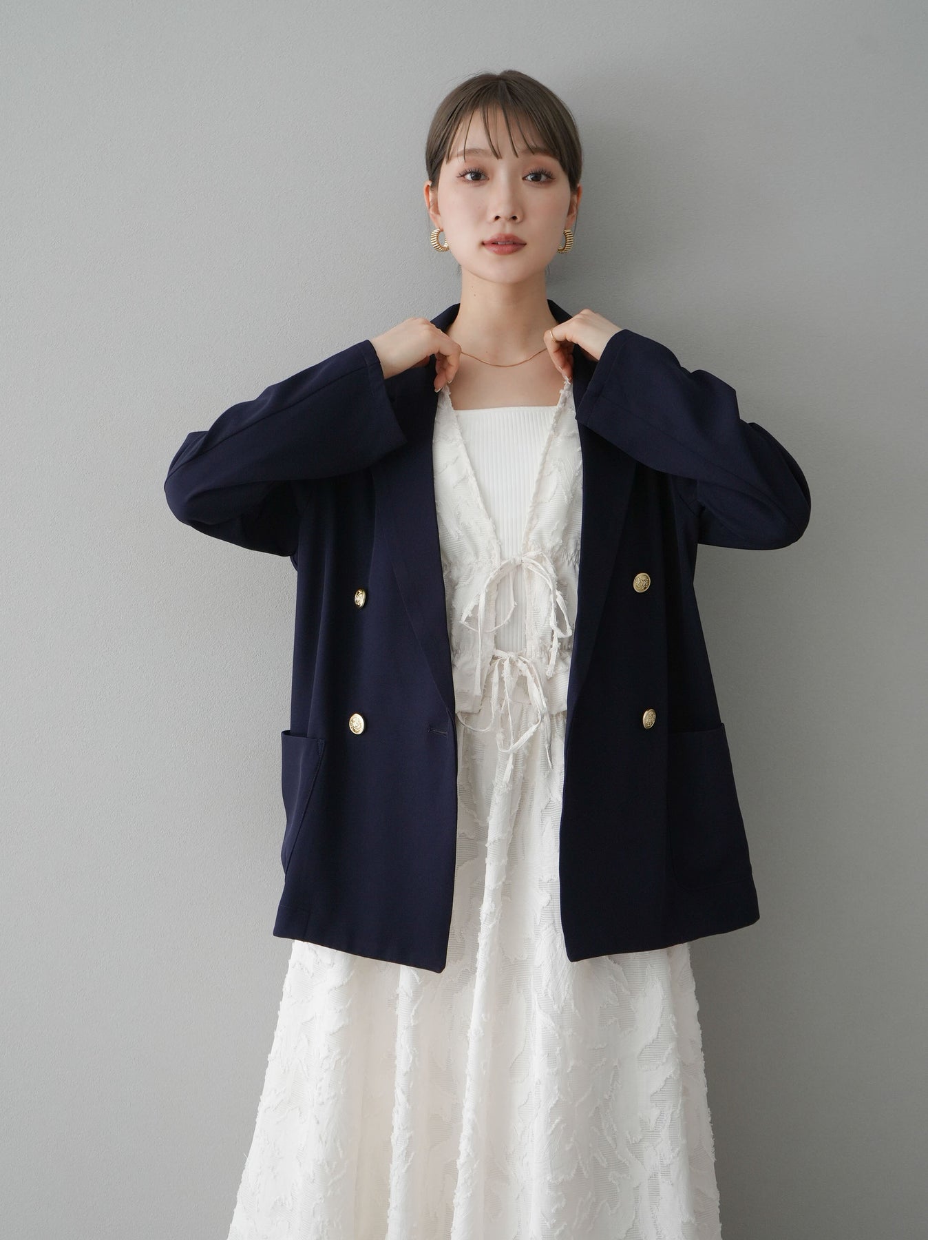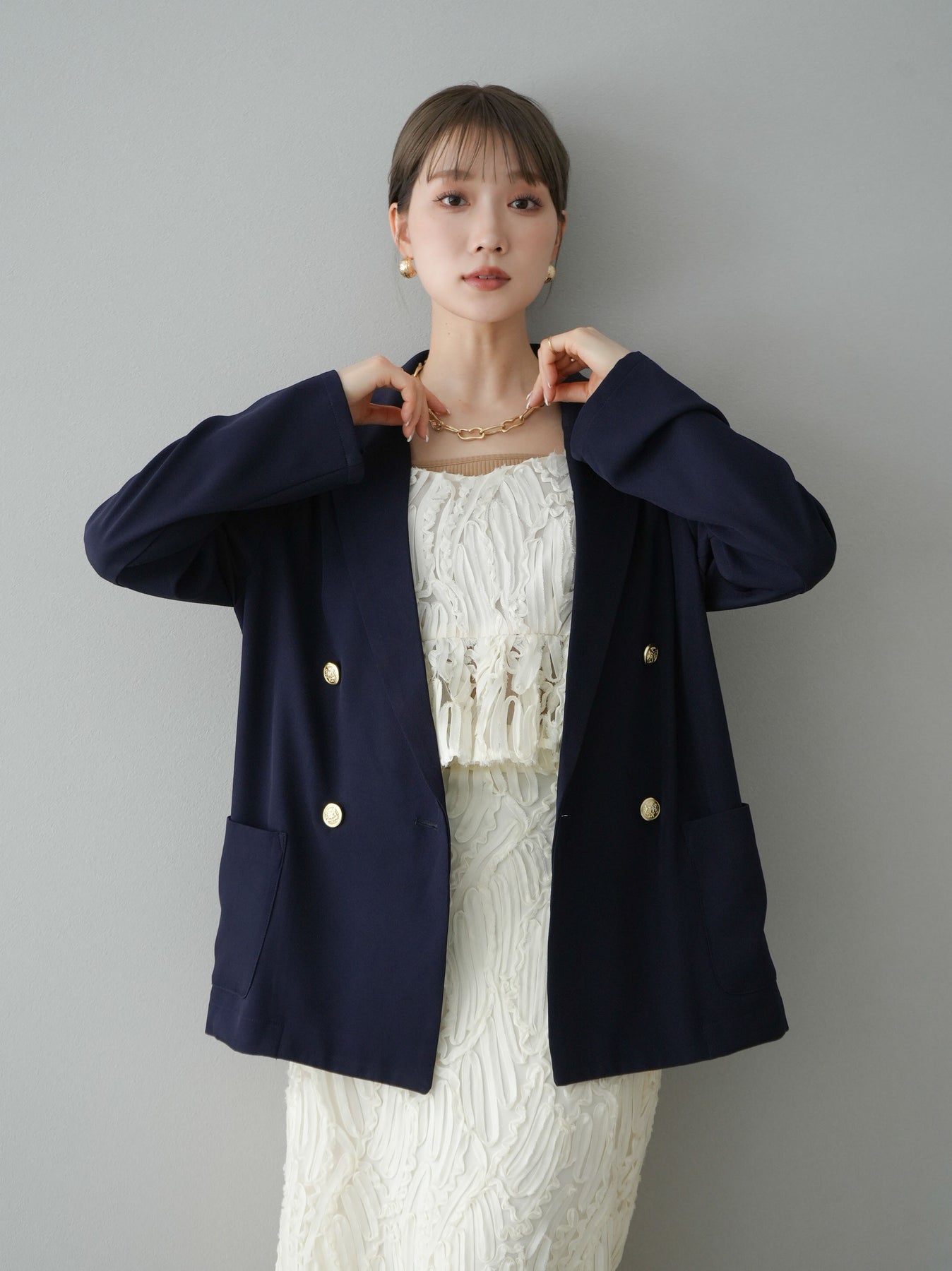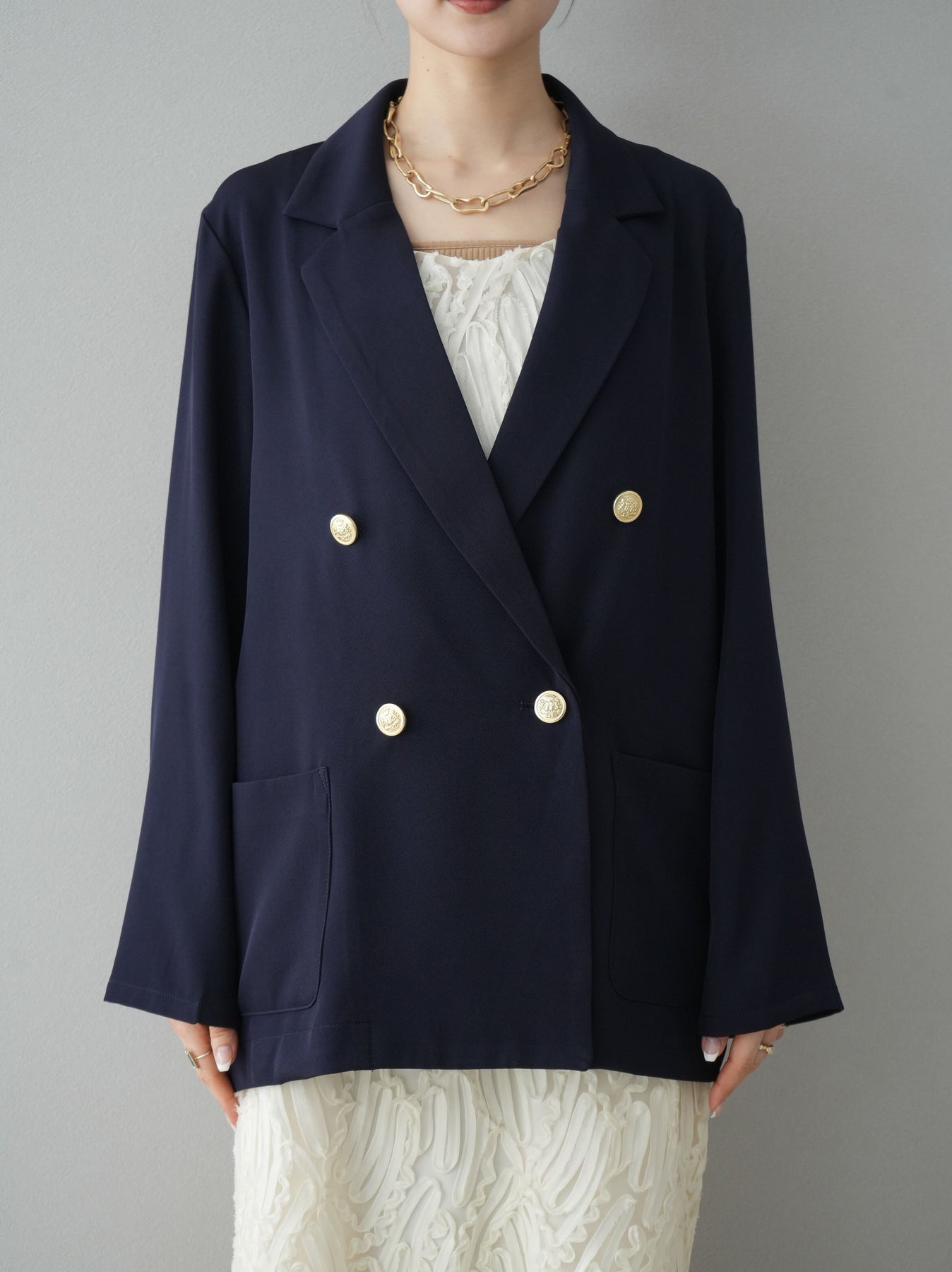 クラシックなダブルブレストデザインに、ゴールドボタンが華やかさを添えるテーラードジャケット。ゆったりとしたシルエットで、こなれ感のある着こなしが叶います。シンプルながらも洗練されたデザインで、カジュアルからオフィススタイルまで幅広く活躍。トレンド感をプラスできる一着として、ワードローブに取り入れたいアイテムです。 ※ボトムス、キャミソール(インナー)以外の商品は一律でインナーは付属していません。