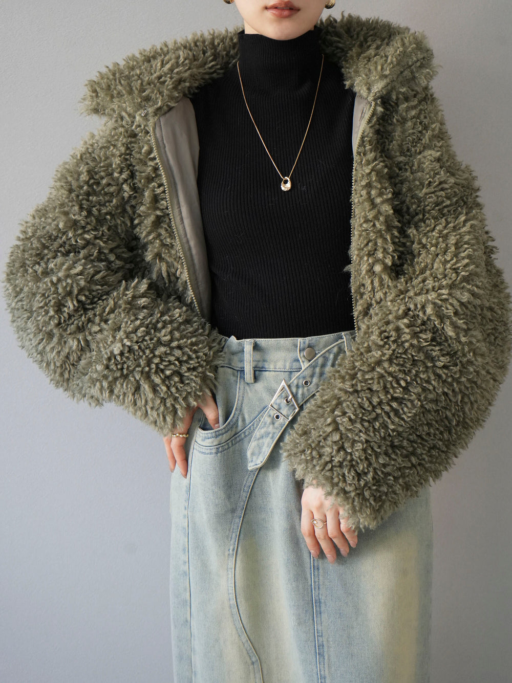 [予約]スタンドカラープードルファーショートコート/グリーン
