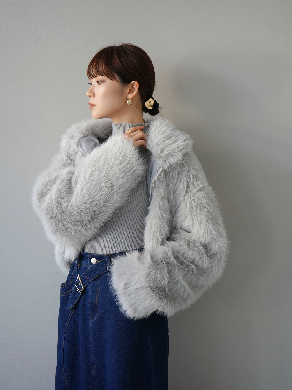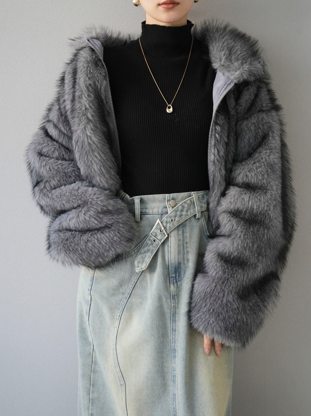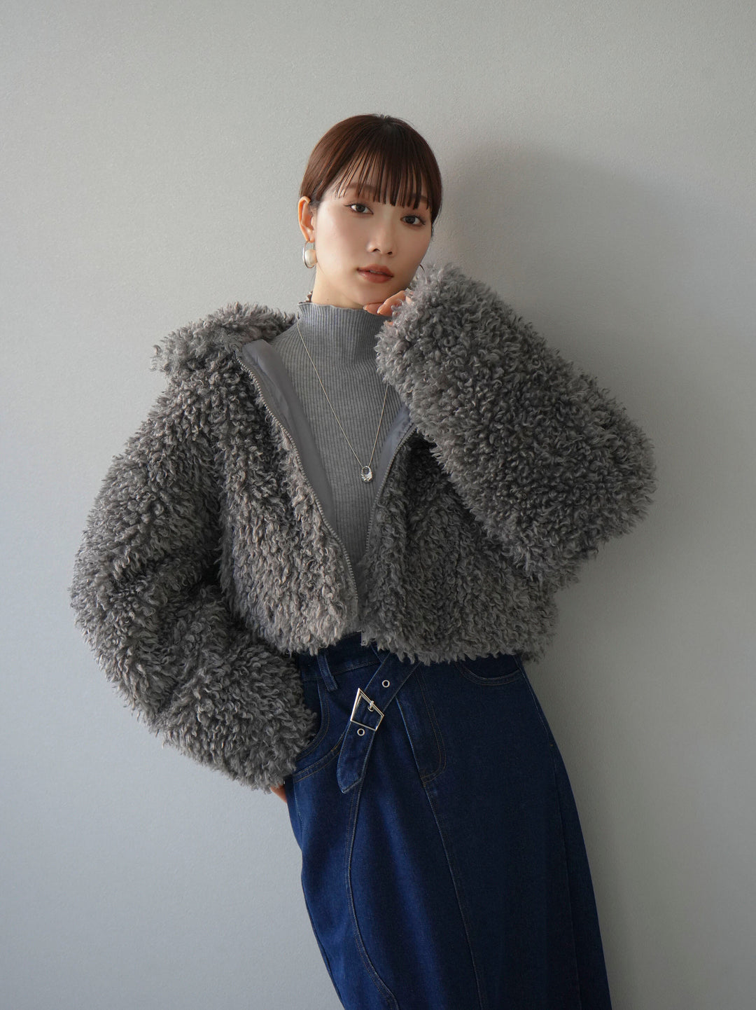 [予約]スタンドカラーエコファーショートコート/グレー