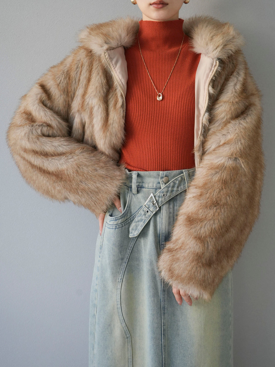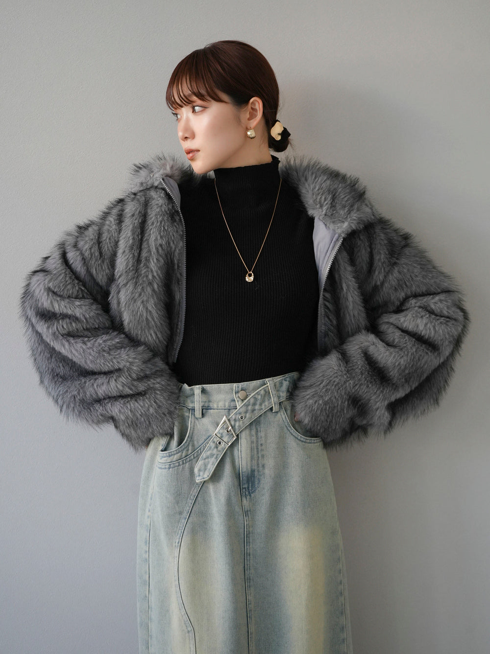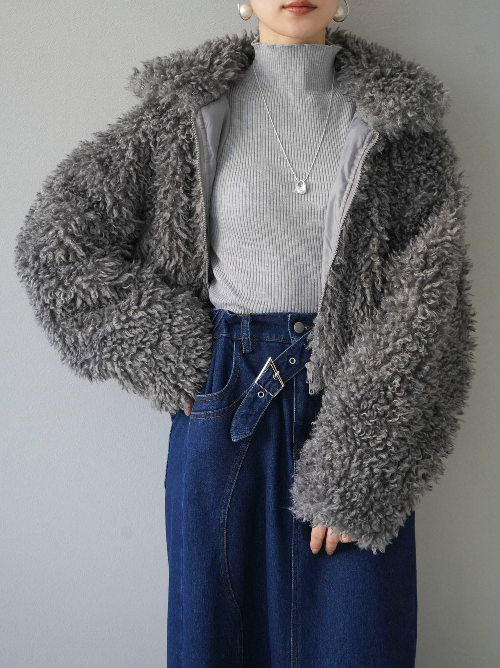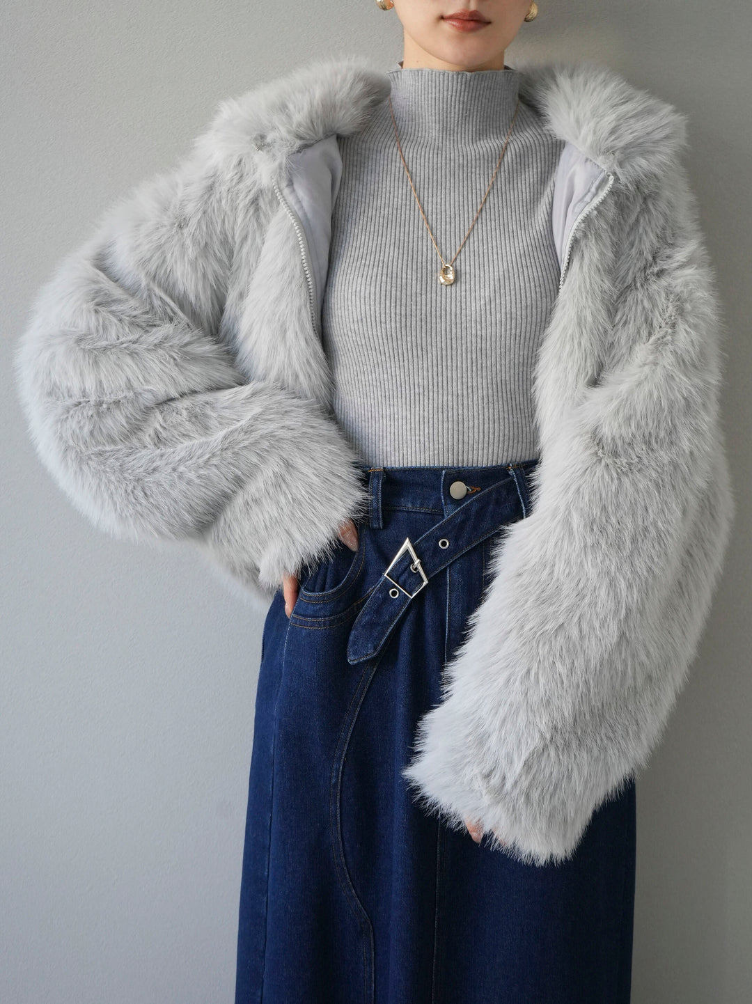 [予約]スタンドカラーエコファーショートコート/グレー