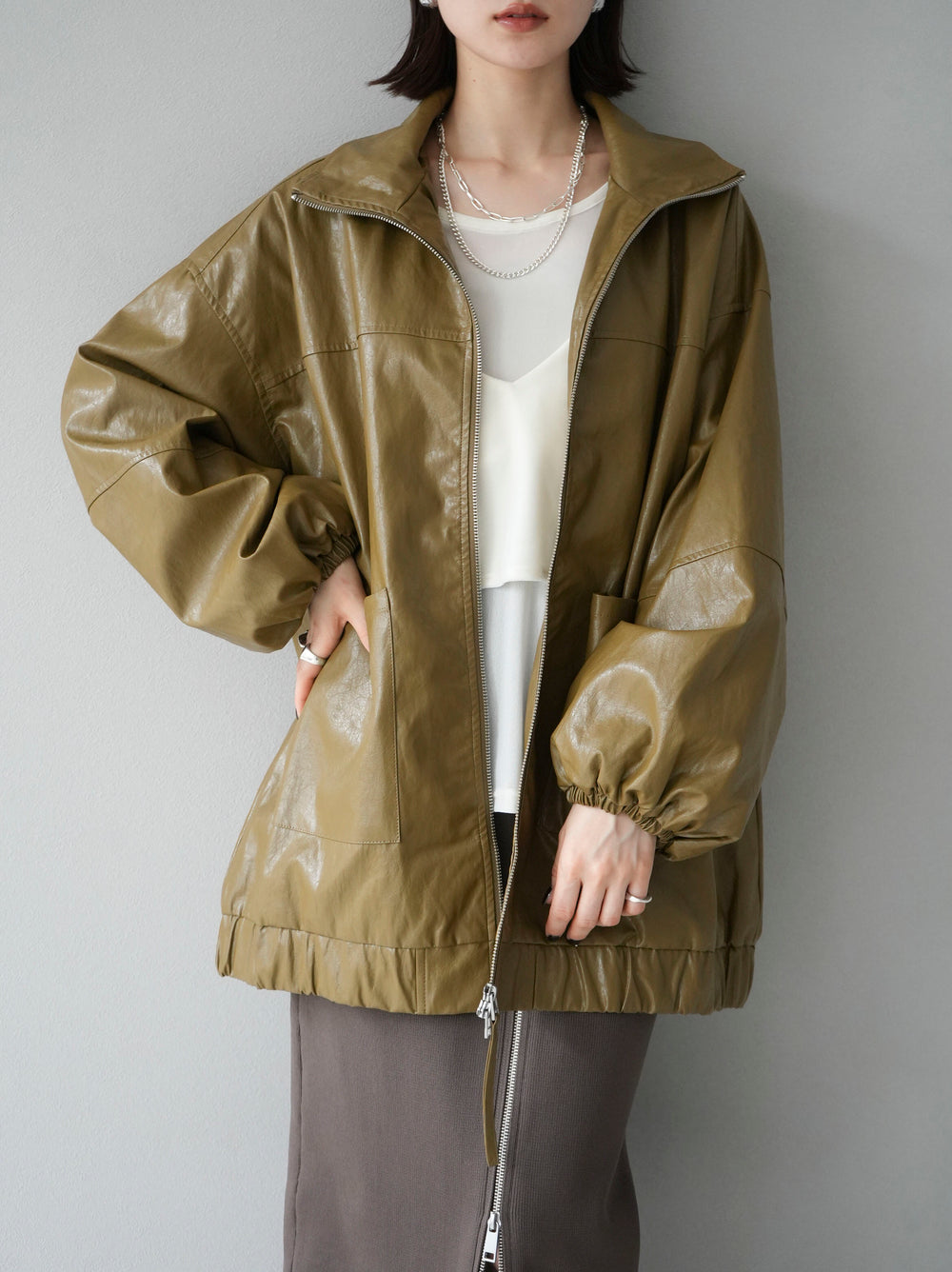 [予約]フェイクレザーオーバーブルゾン/オリーブ