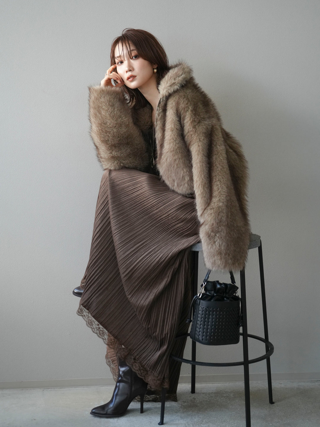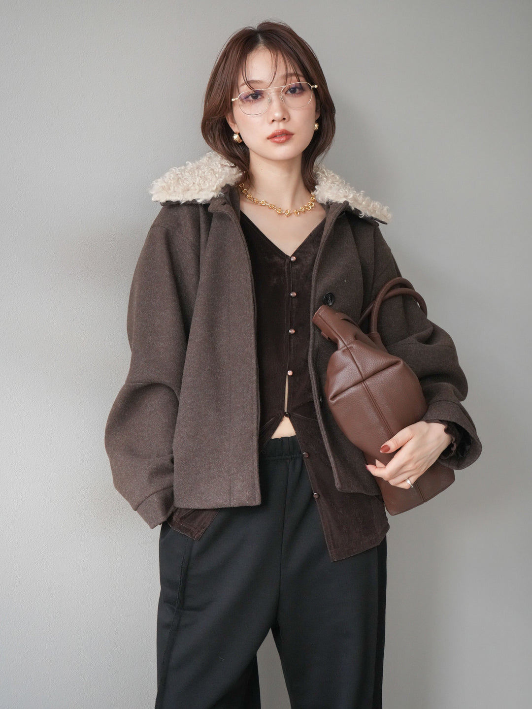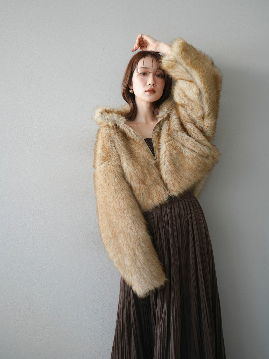 [予約]フェイクファーショートZIPジャケット/brown