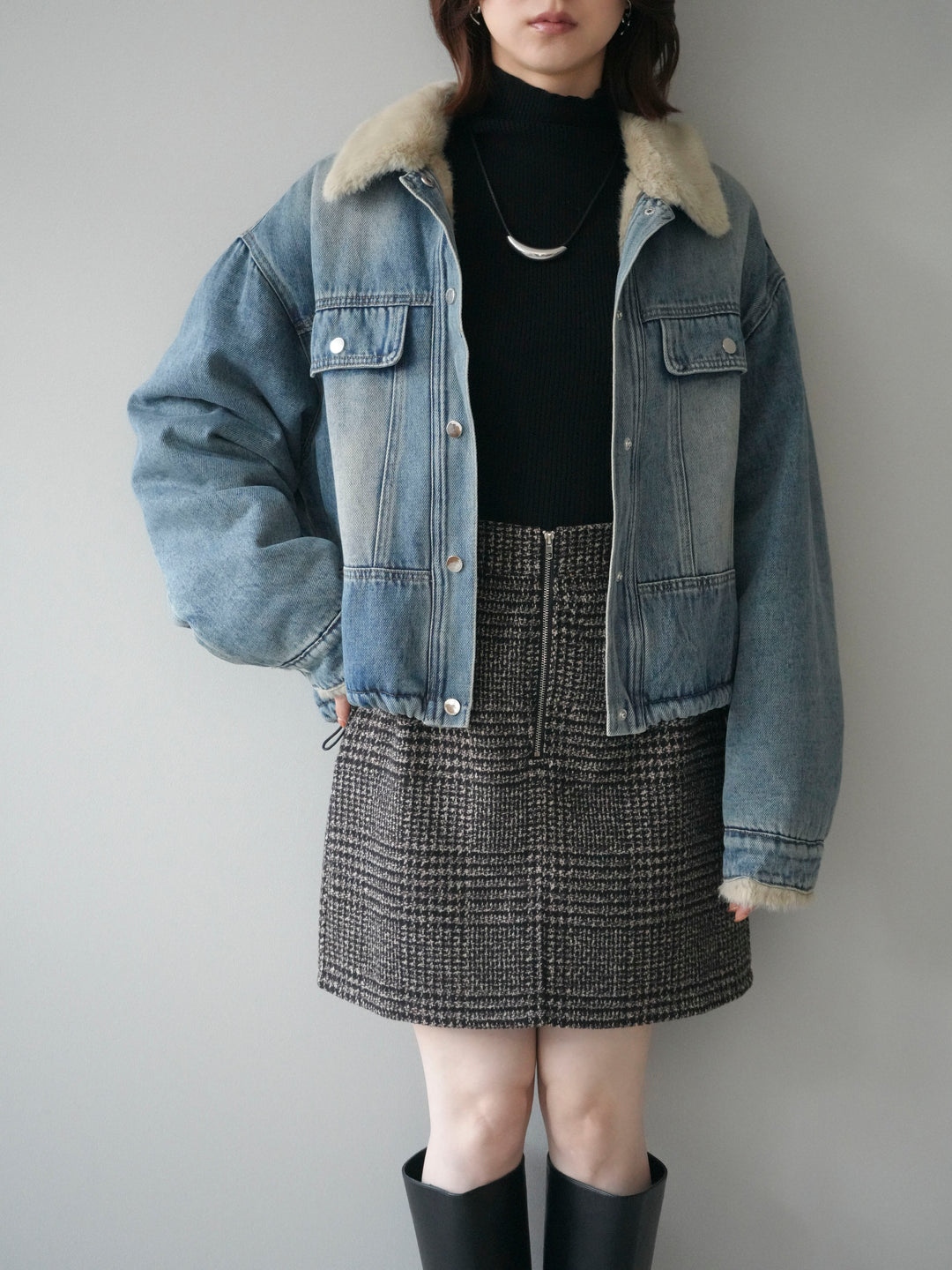[予約]スタンドカラーファー×デニムジャケット/lightblue