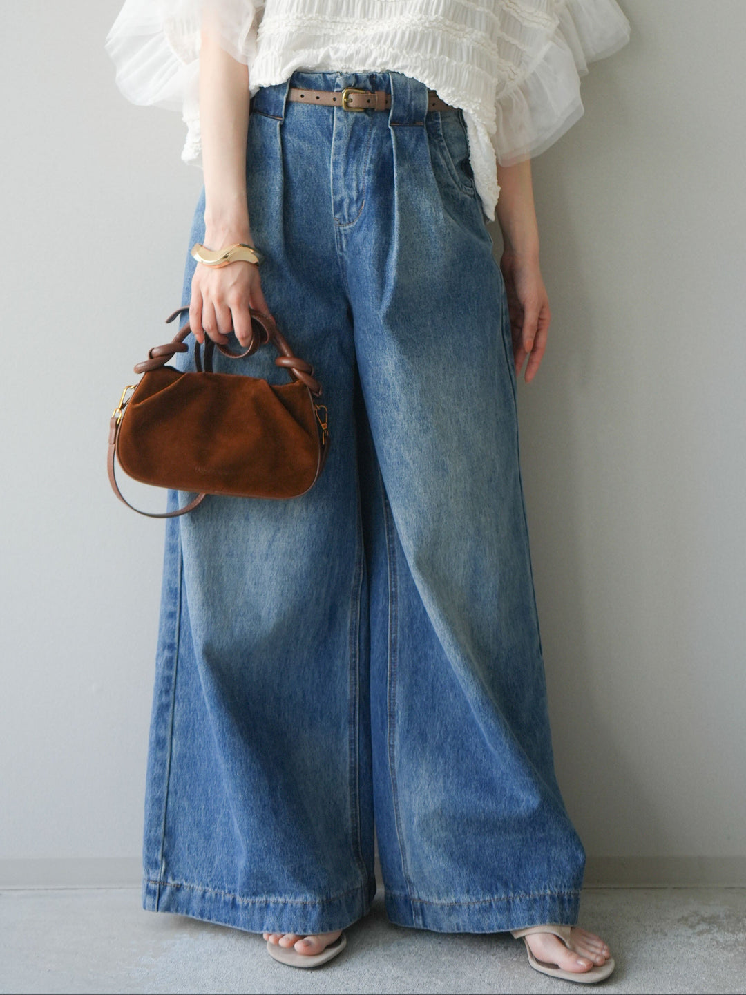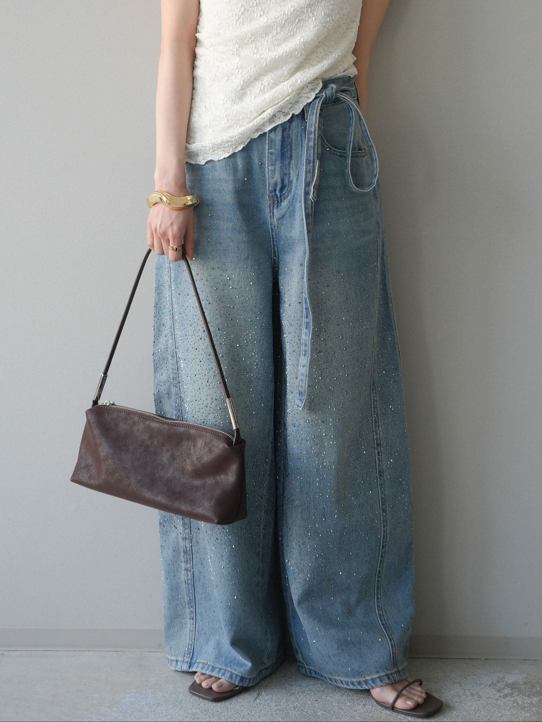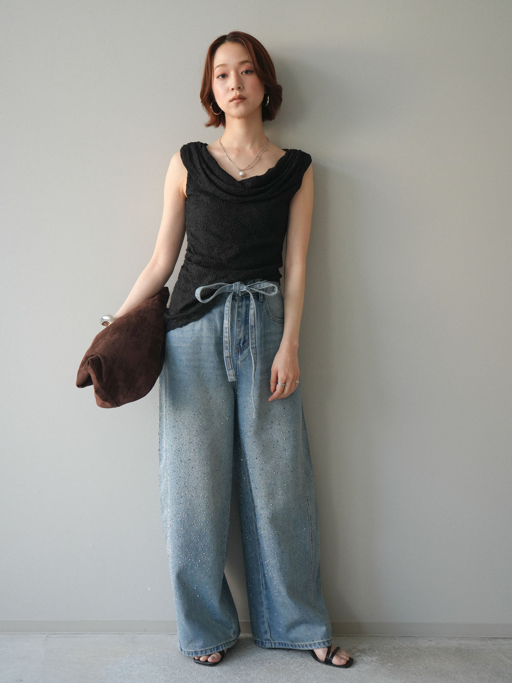 [予約]ウエストベルトビジューワイドデニムパンツ/lightblue
