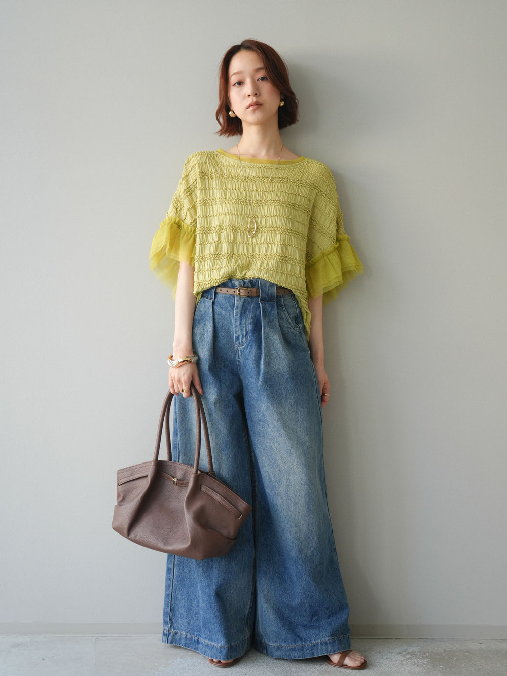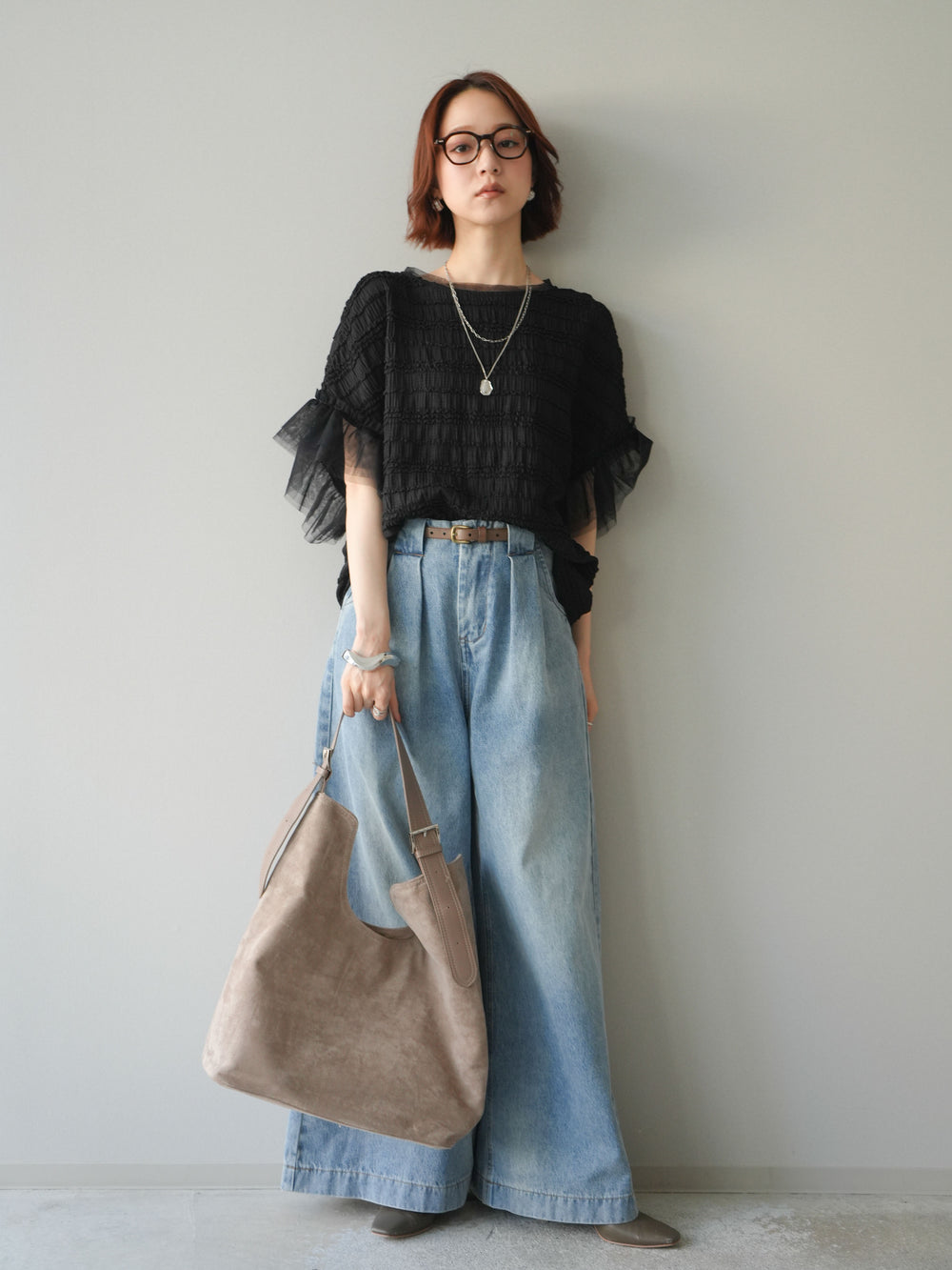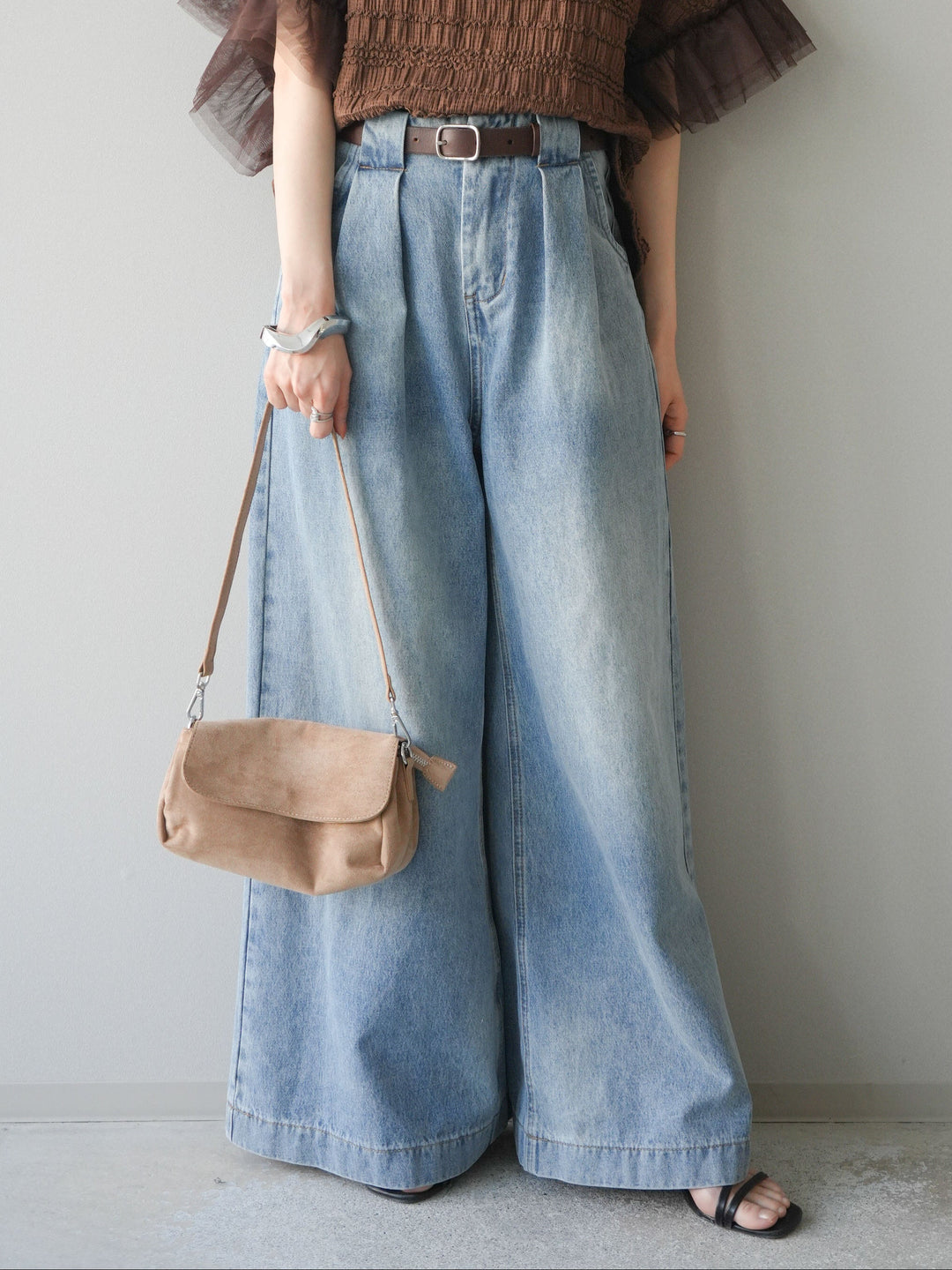 [予約]ウエストベルトビジューワイドデニムパンツ/lightblue
