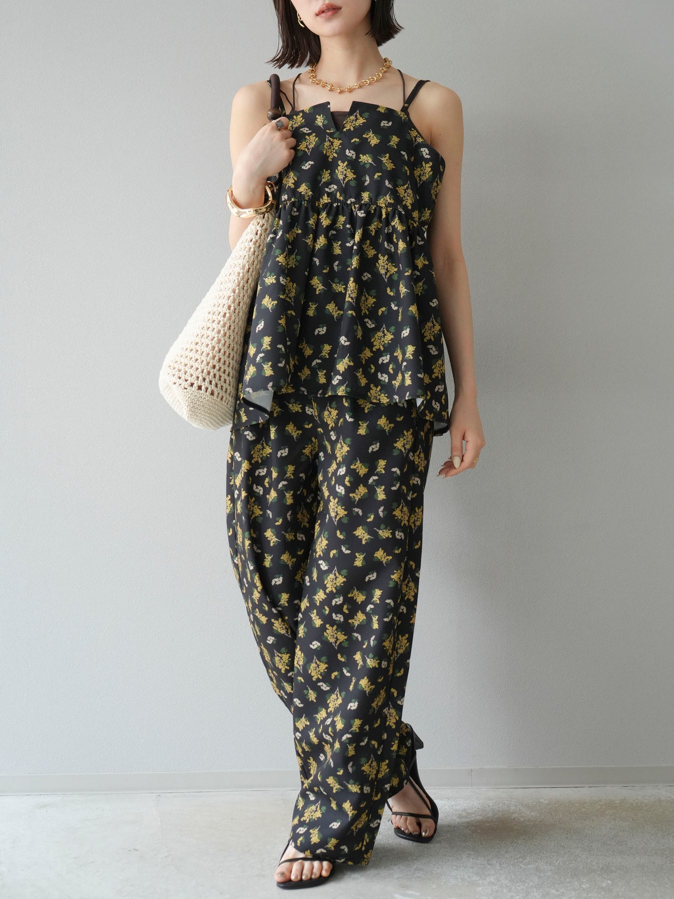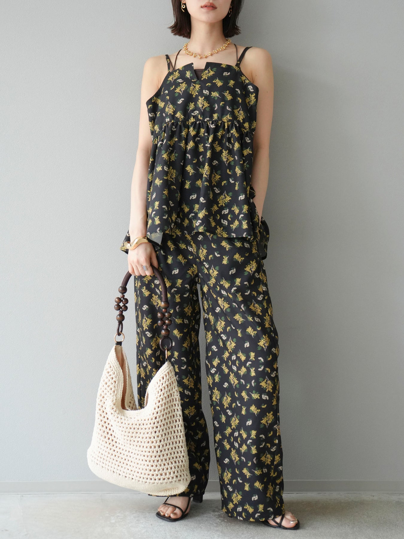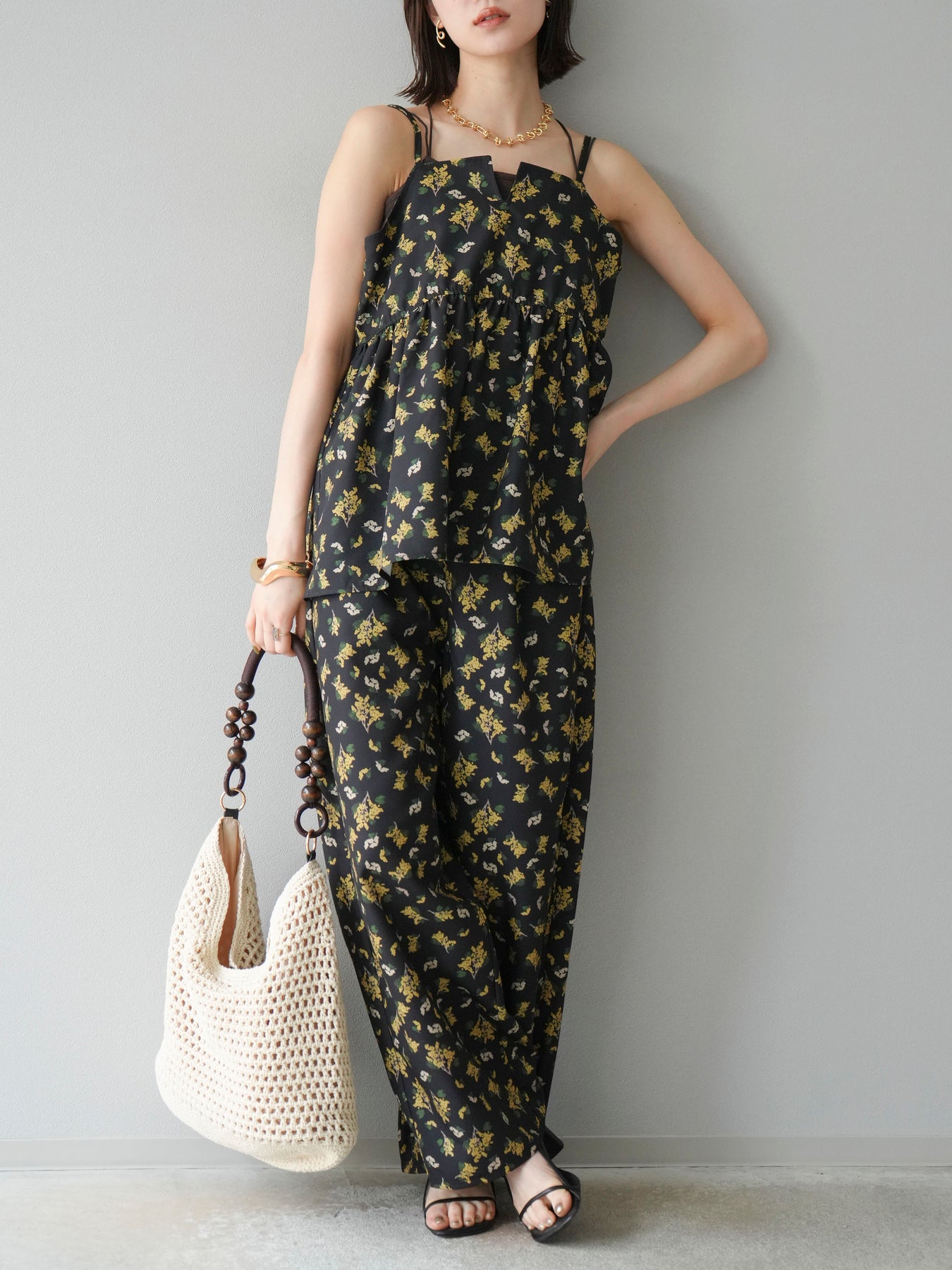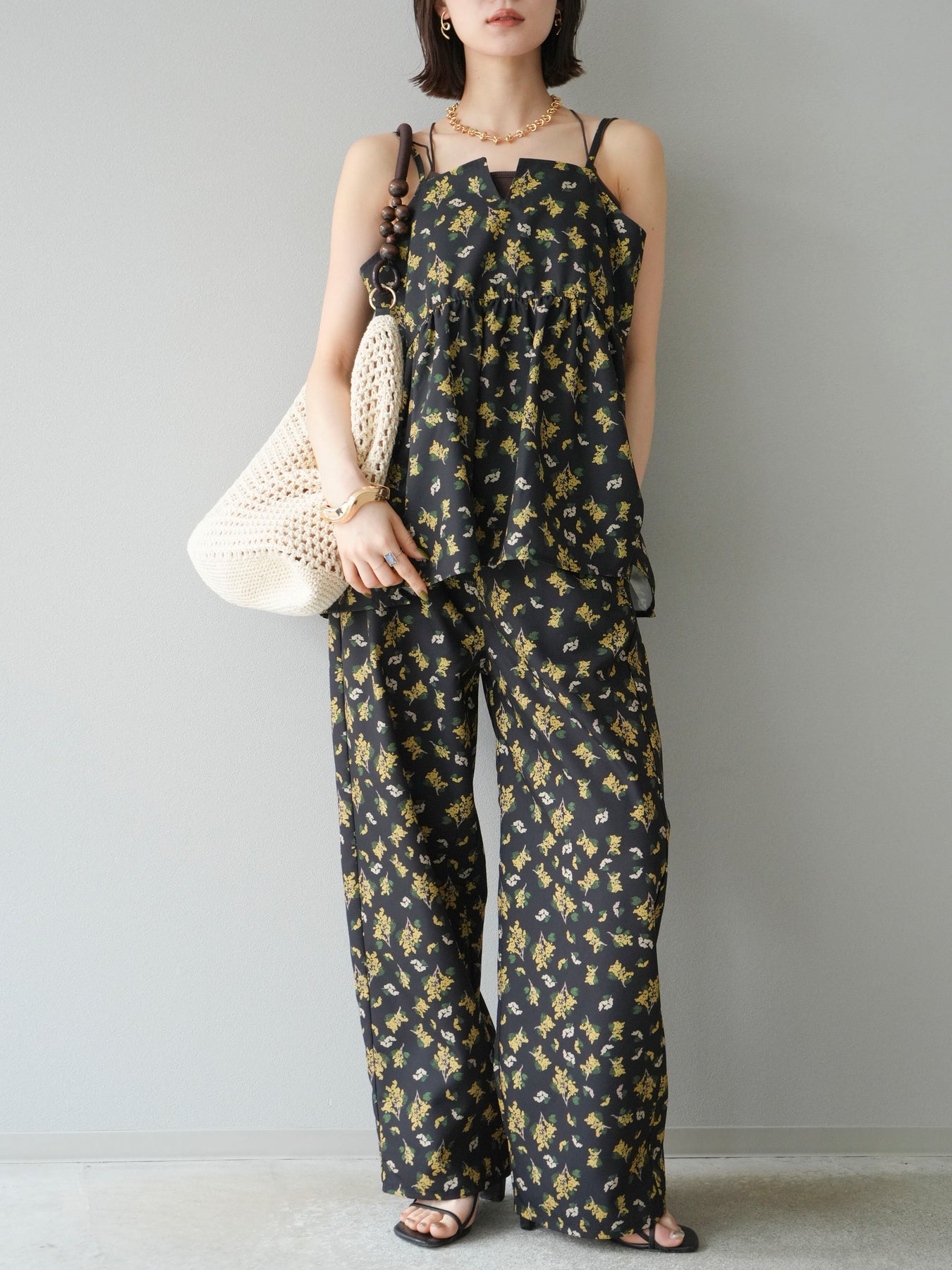 小花が散りばめられたブーケ柄が大人可愛い、主役級のキャミソールトップス。 細めのストラップとデコルテが綺麗に見えるネックラインで、女性らしさが際立つ一枚です。 切り替え位置を高めに設定したふんわりとしたシルエットが、体のラインをさりげなくカバーしつつ、軽やかで華やかな印象に。 さらりとした肌触りの素材感で、暑い季節も快適に着用できます。 一枚での着用はもちろん、インナーにTシャツやシアートップスをレイヤードするスタイルもおすすめ。 デニムやワイドパンツとの相性も抜群で、コーディネートに季節感をプラスしてくれるアイテムです。