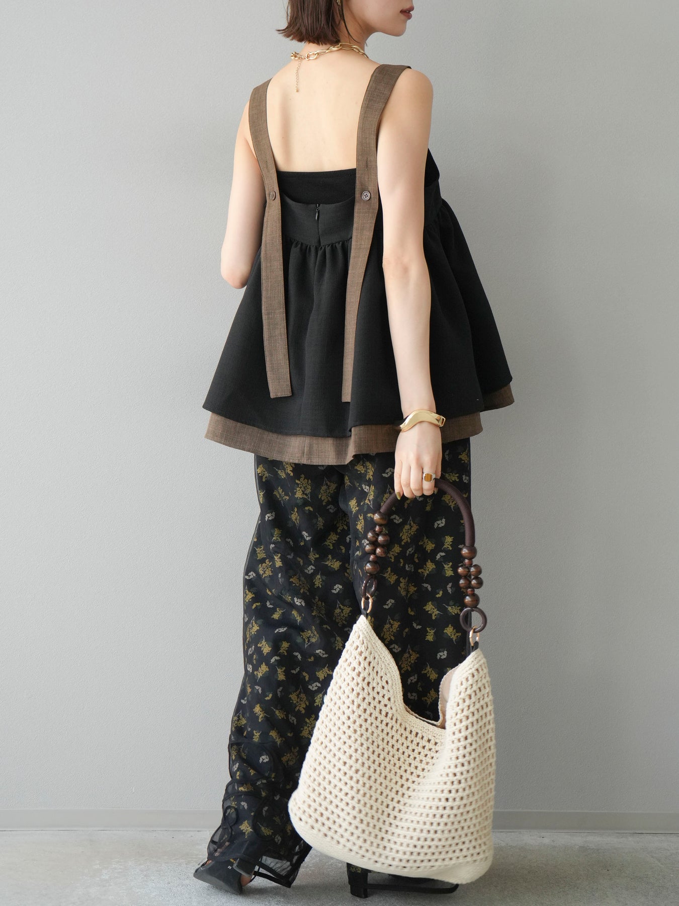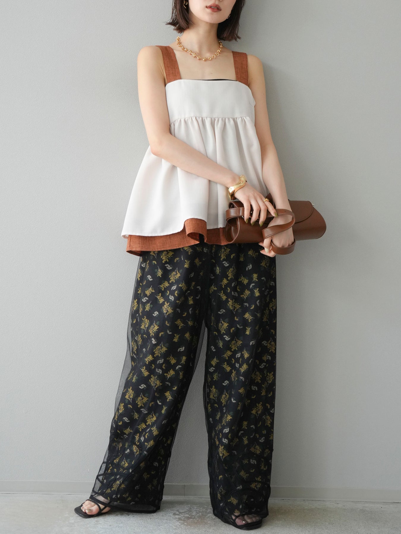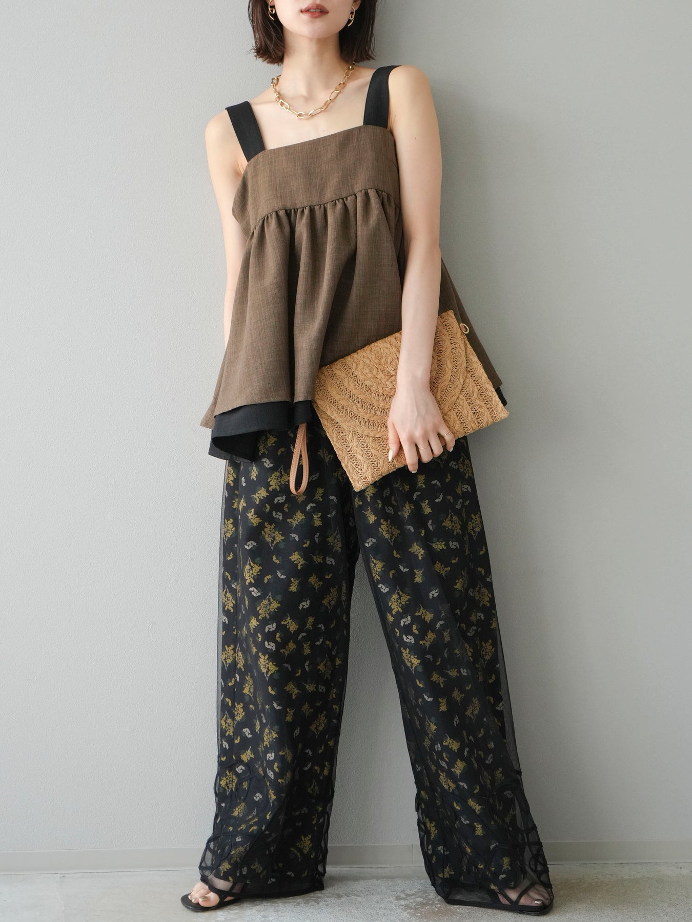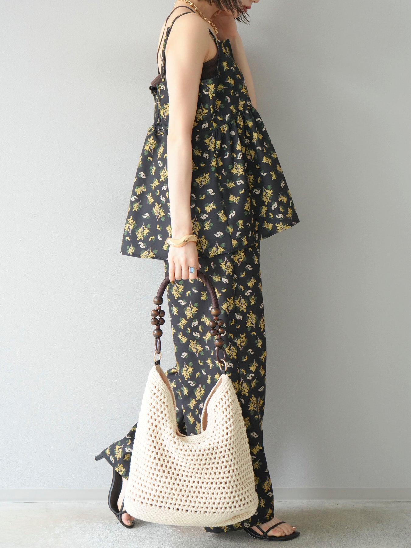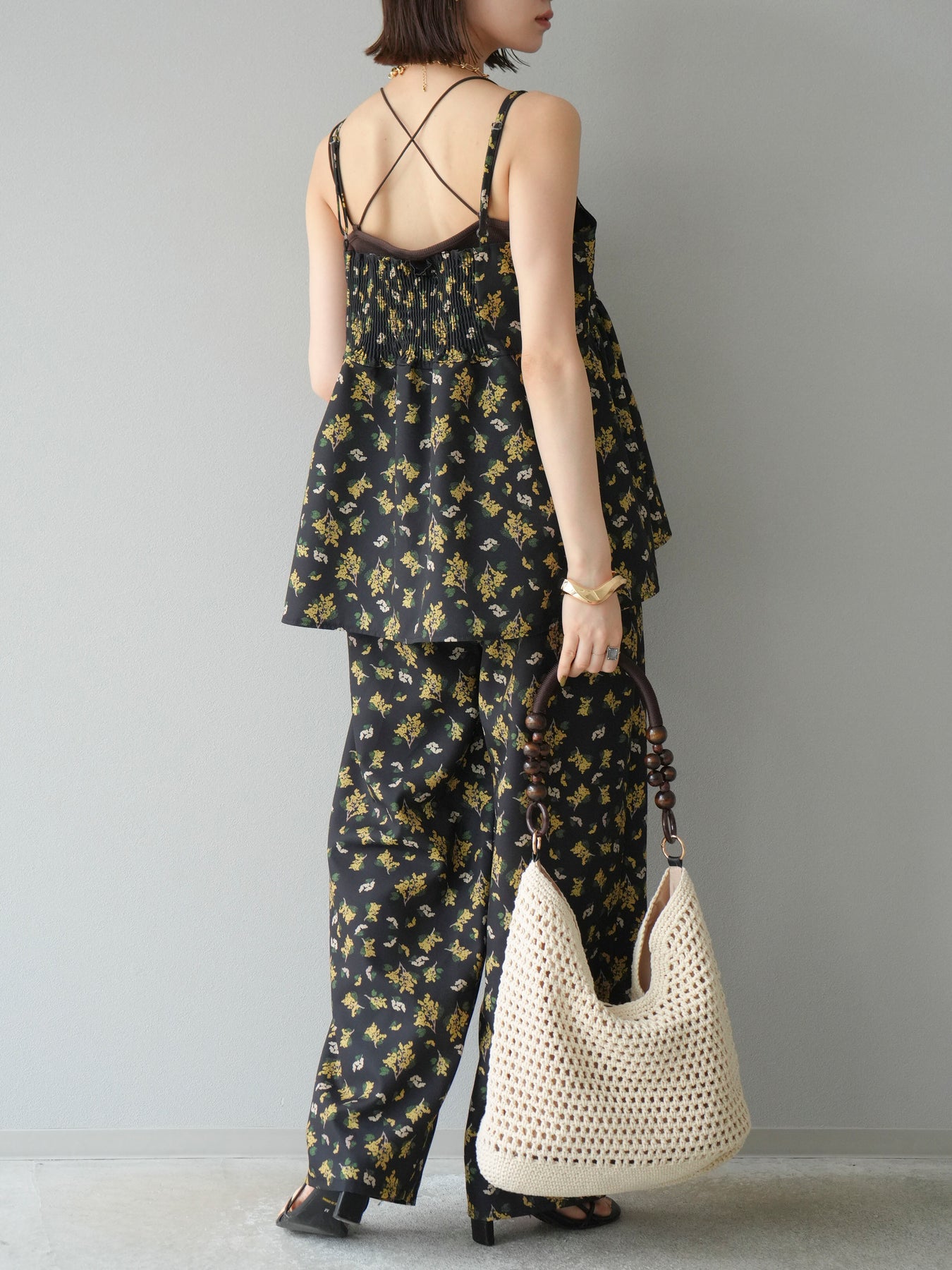 小花が散りばめられたブーケ柄が大人可愛い、主役級のキャミソールトップス。 細めのストラップとデコルテが綺麗に見えるネックラインで、女性らしさが際立つ一枚です。 切り替え位置を高めに設定したふんわりとしたシルエットが、体のラインをさりげなくカバーしつつ、軽やかで華やかな印象に。 さらりとした肌触りの素材感で、暑い季節も快適に着用できます。 一枚での着用はもちろん、インナーにTシャツやシアートップスをレイヤードするスタイルもおすすめ。 デニムやワイドパンツとの相性も抜群で、コーディネートに季節感をプラスしてくれるアイテムです。
