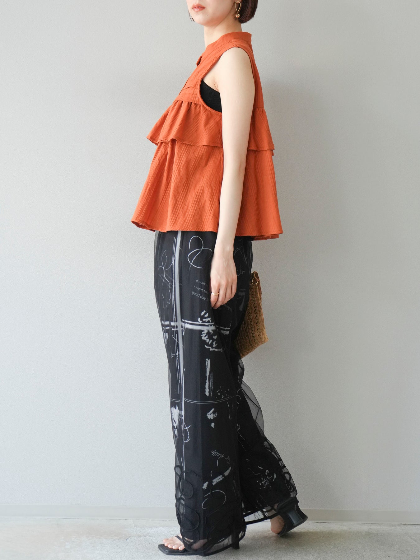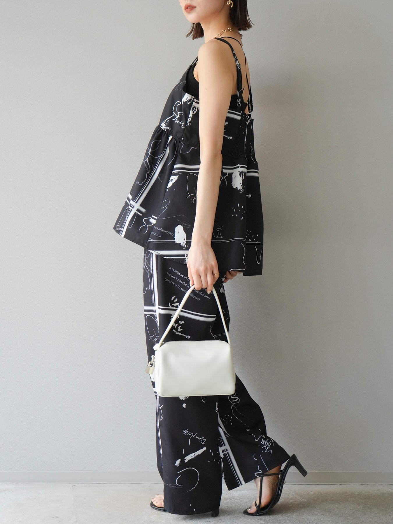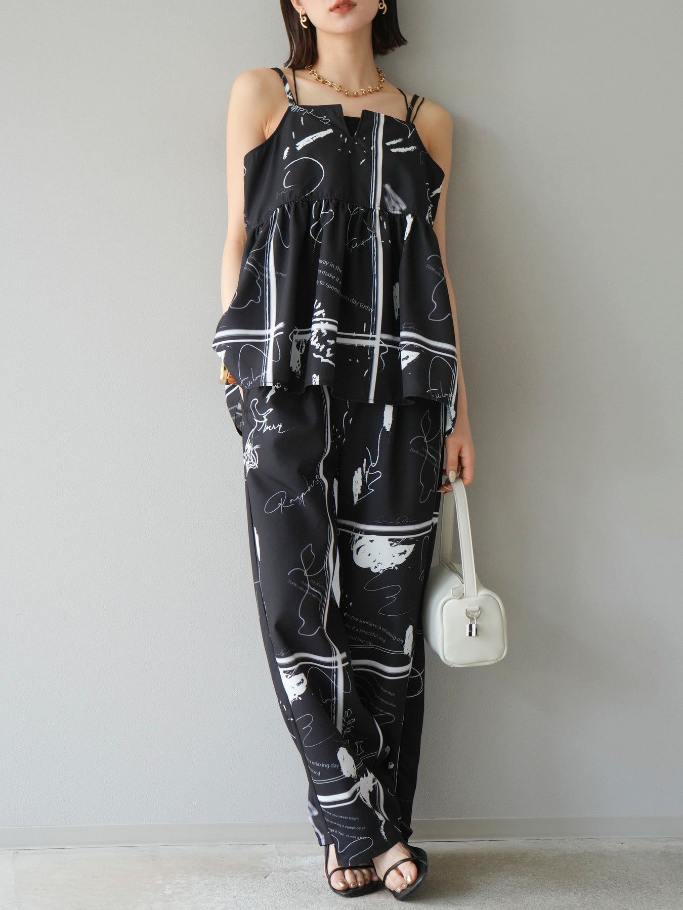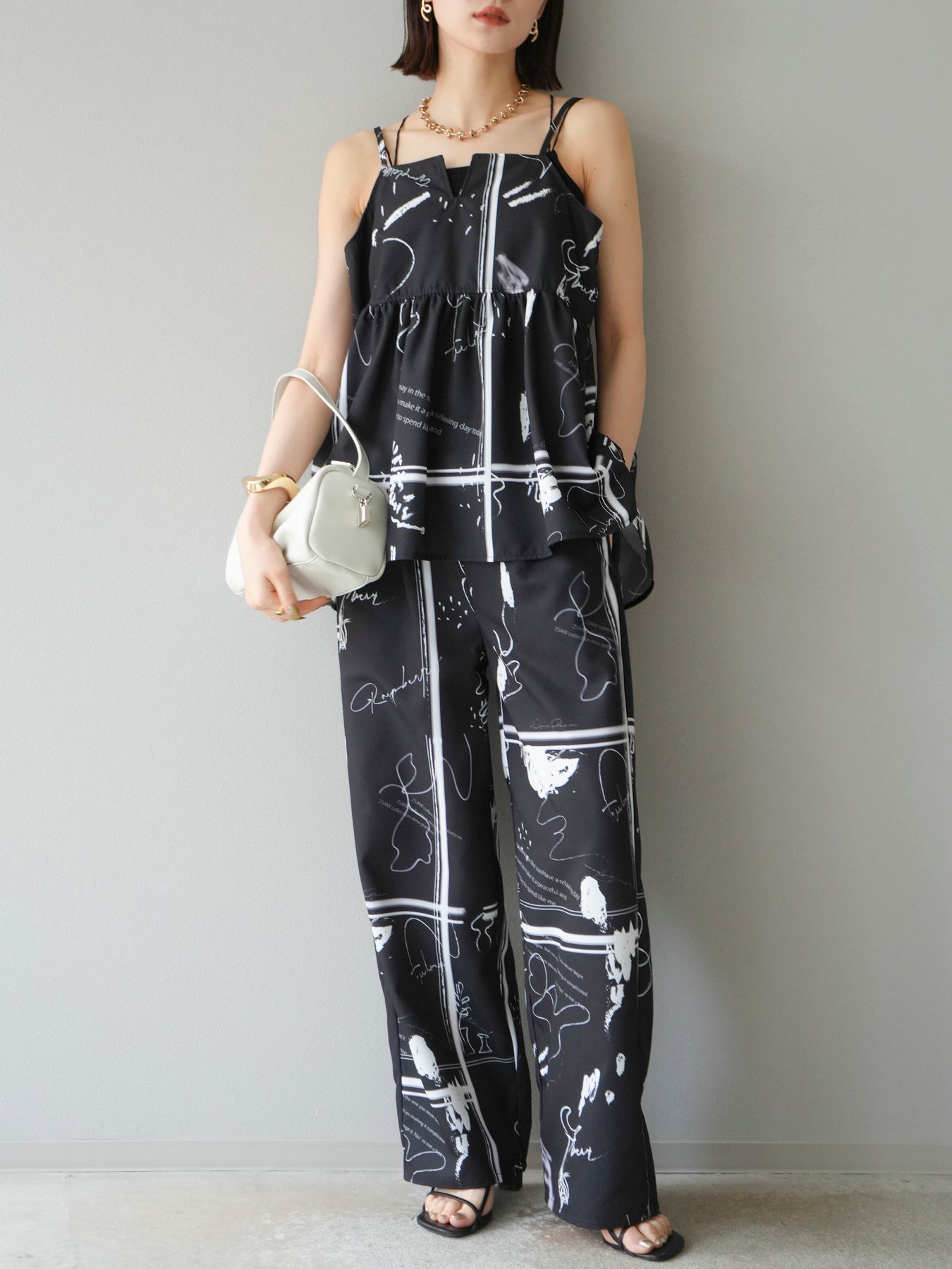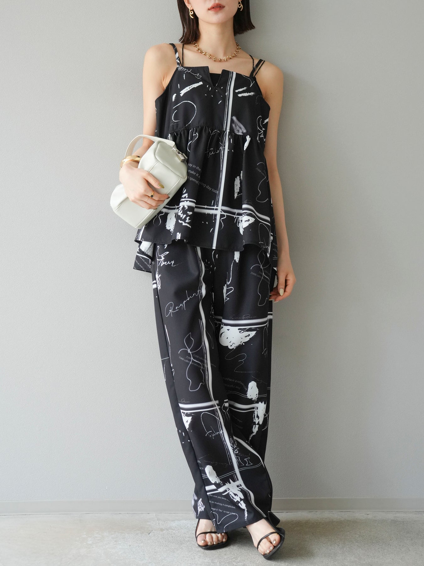 アーティスティックなペイント柄が目を惹く、感度高めなキャミソールトップス。 細めのストラップと切り替えギャザーで、女性らしさとリラックス感を兼ね備えたデザインに仕上げました。 目を引くグラフィックながらも、モノトーン配色でコーディネートに取り入れやすいバランス感が魅力。 フロントの直線的なカットが個性を加えつつ、裾のふんわり広がるシルエットで軽やかさも演出します。 セットアップのボトムとの着用はもちろん、デニムやワイドパンツ、スラックスとも好相性。 1枚でトレンド感を取り入れられる、夏の主役トップスです。