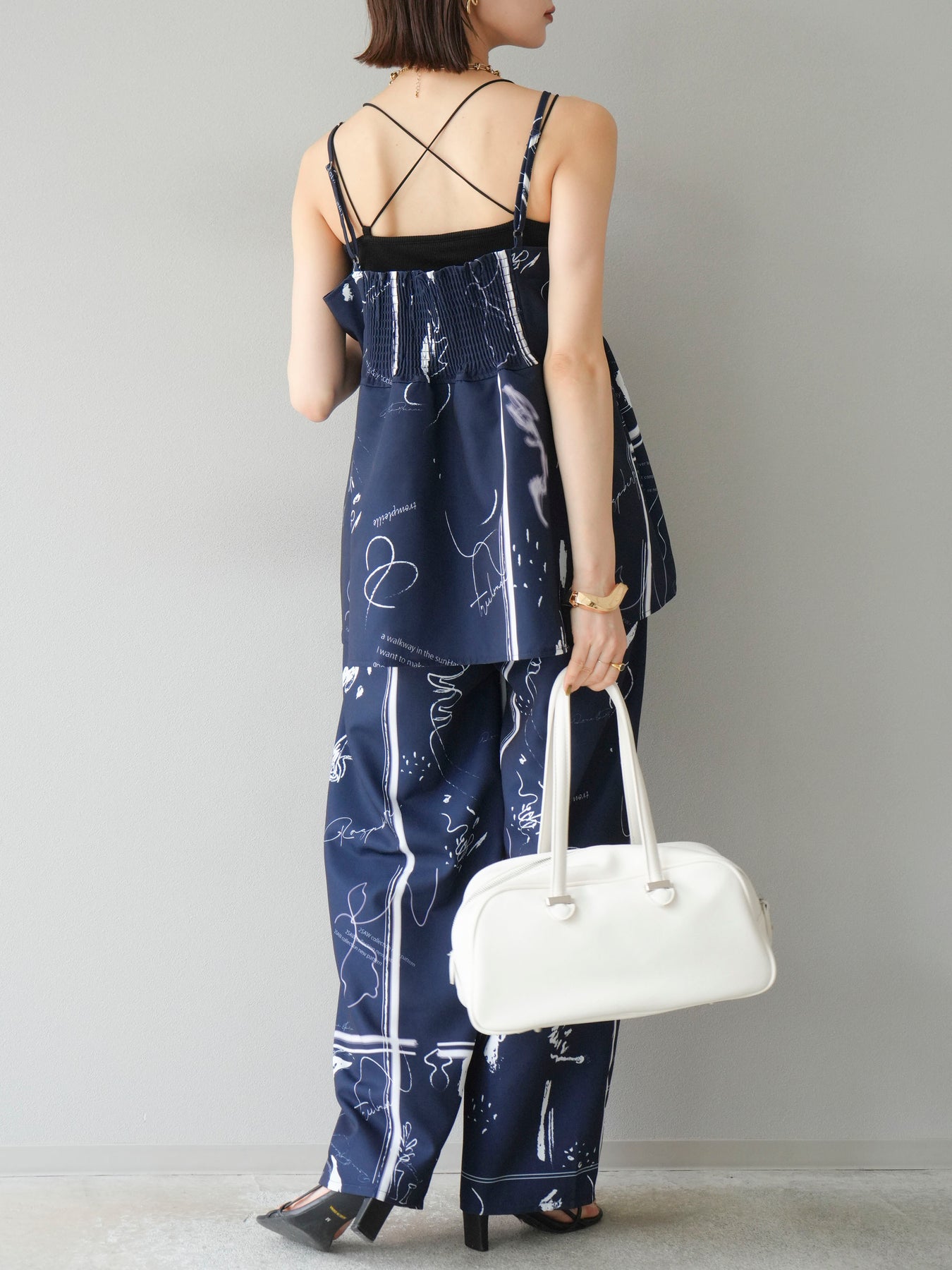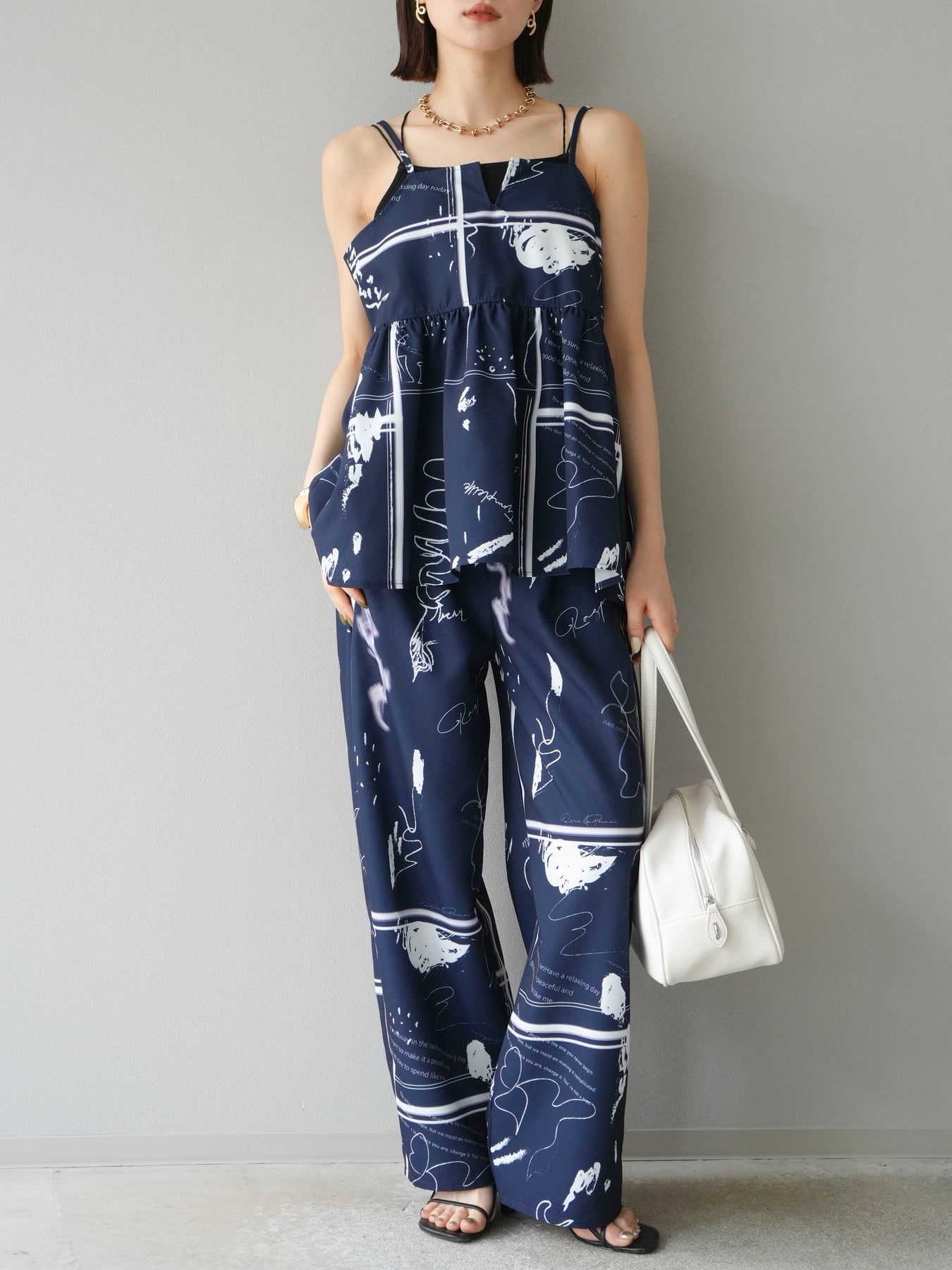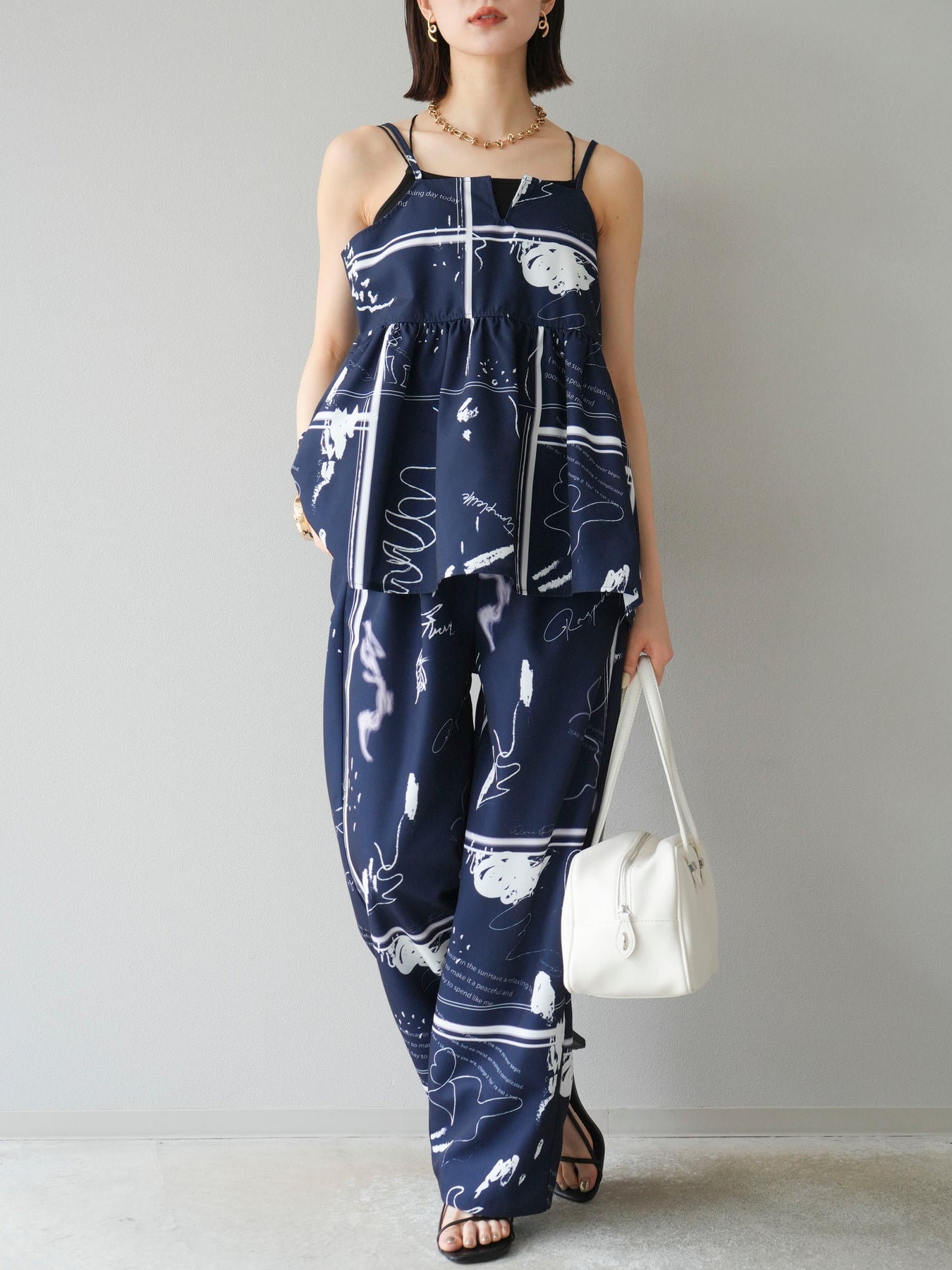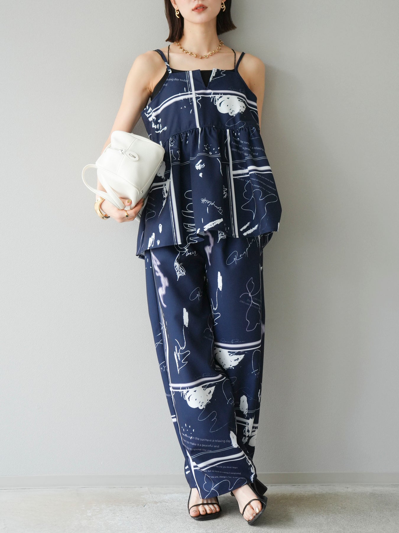 アーティスティックなペイント柄が目を惹く、感度高めなキャミソールトップス。 細めのストラップと切り替えギャザーで、女性らしさとリラックス感を兼ね備えたデザインに仕上げました。 目を引くグラフィックながらも、モノトーン配色でコーディネートに取り入れやすいバランス感が魅力。 フロントの直線的なカットが個性を加えつつ、裾のふんわり広がるシルエットで軽やかさも演出します。 セットアップのボトムとの着用はもちろん、デニムやワイドパンツ、スラックスとも好相性。 1枚でトレンド感を取り入れられる、夏の主役トップスです。