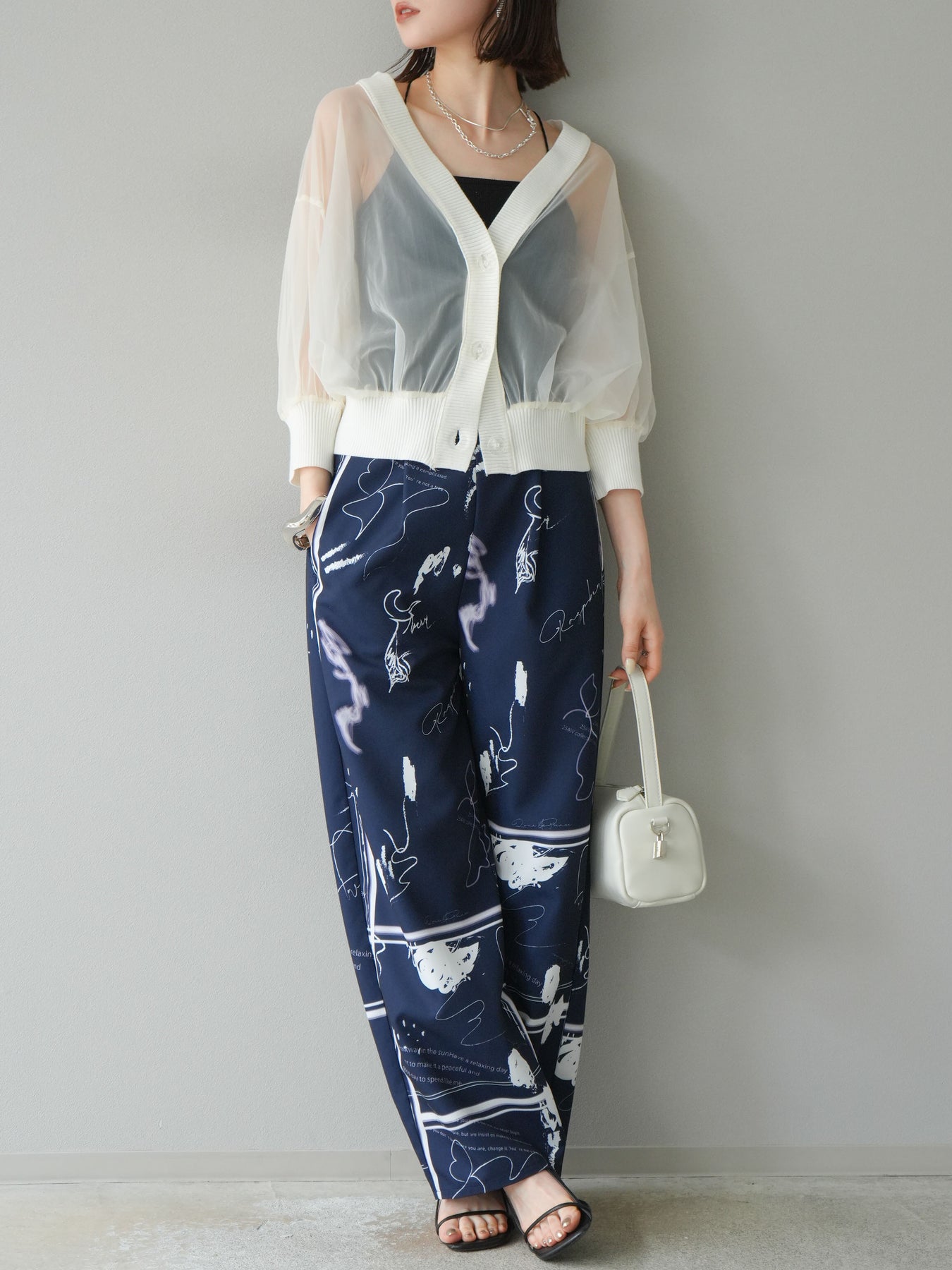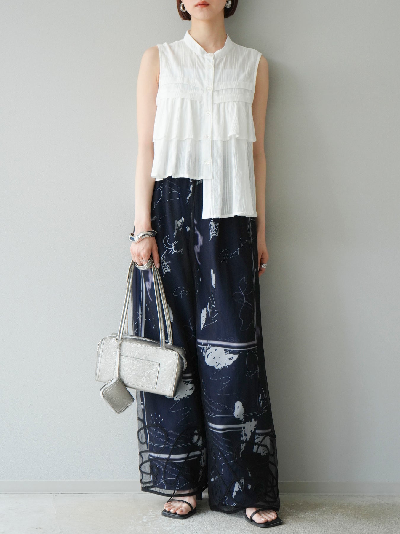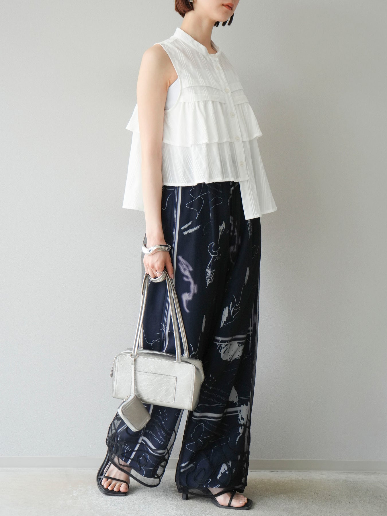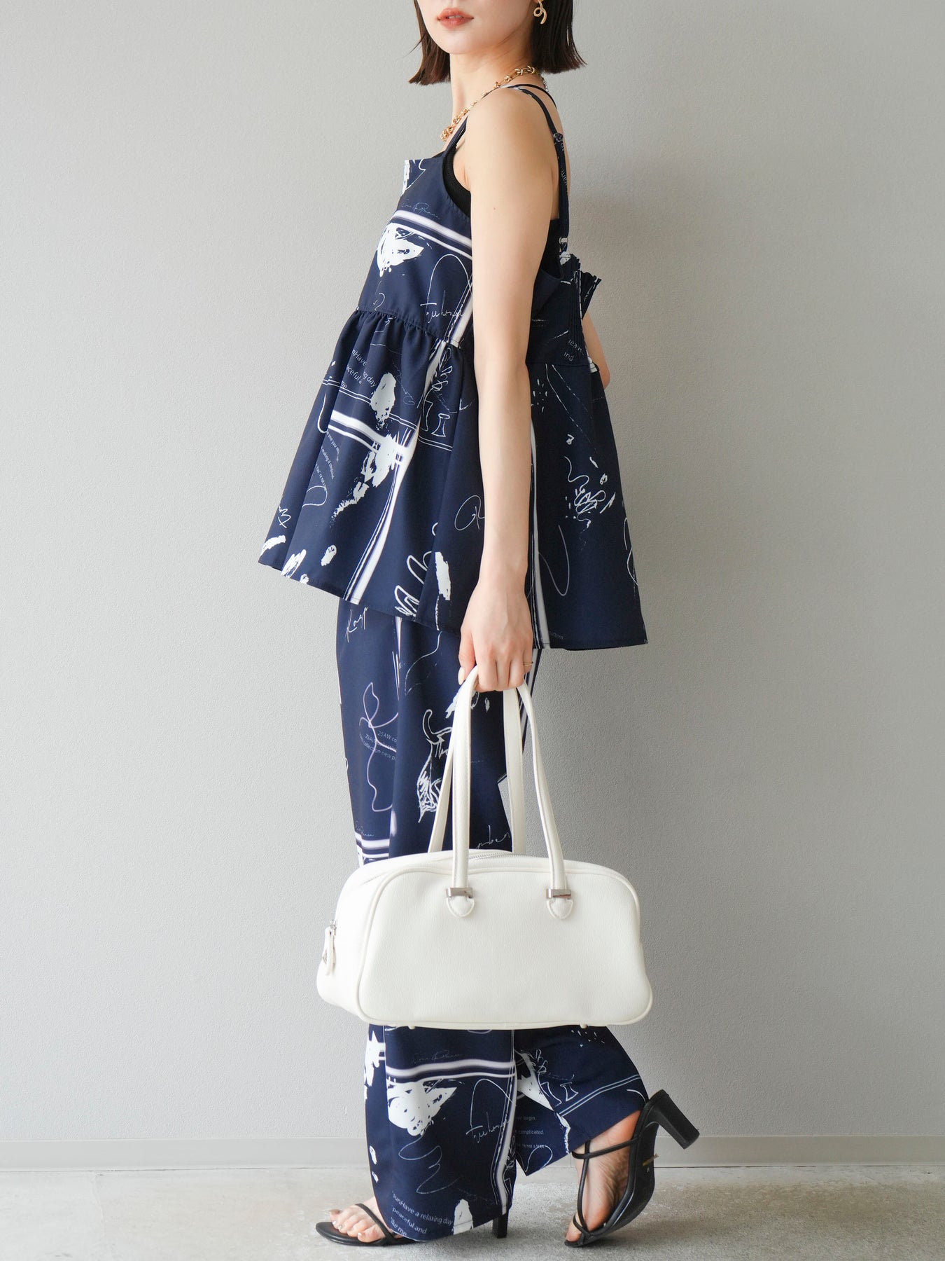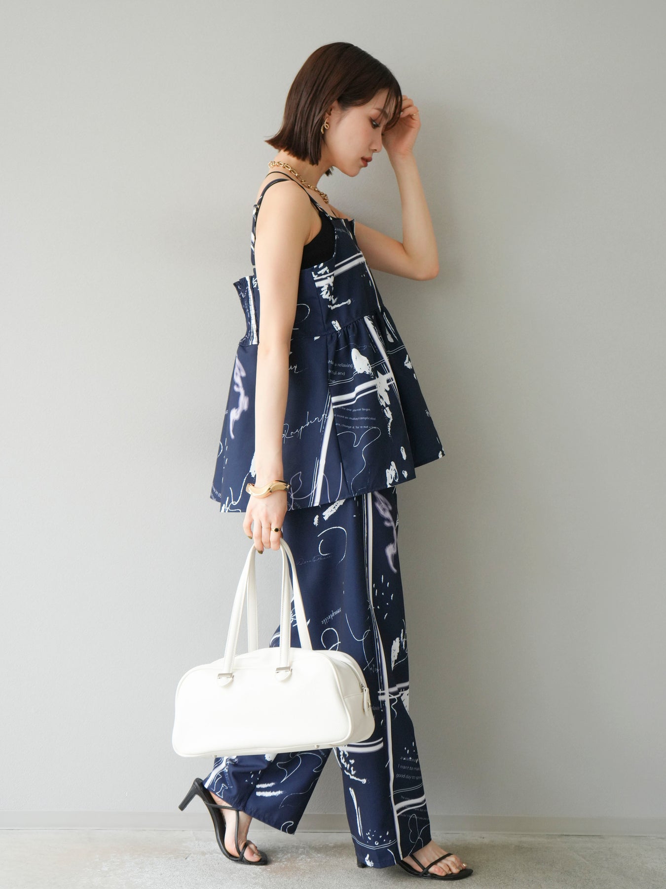 アーティスティックなペイント柄が目を惹く、感度高めなキャミソールトップス。 細めのストラップと切り替えギャザーで、女性らしさとリラックス感を兼ね備えたデザインに仕上げました。 目を引くグラフィックながらも、モノトーン配色でコーディネートに取り入れやすいバランス感が魅力。 フロントの直線的なカットが個性を加えつつ、裾のふんわり広がるシルエットで軽やかさも演出します。 セットアップのボトムとの着用はもちろん、デニムやワイドパンツ、スラックスとも好相性。 1枚でトレンド感を取り入れられる、夏の主役トップスです。