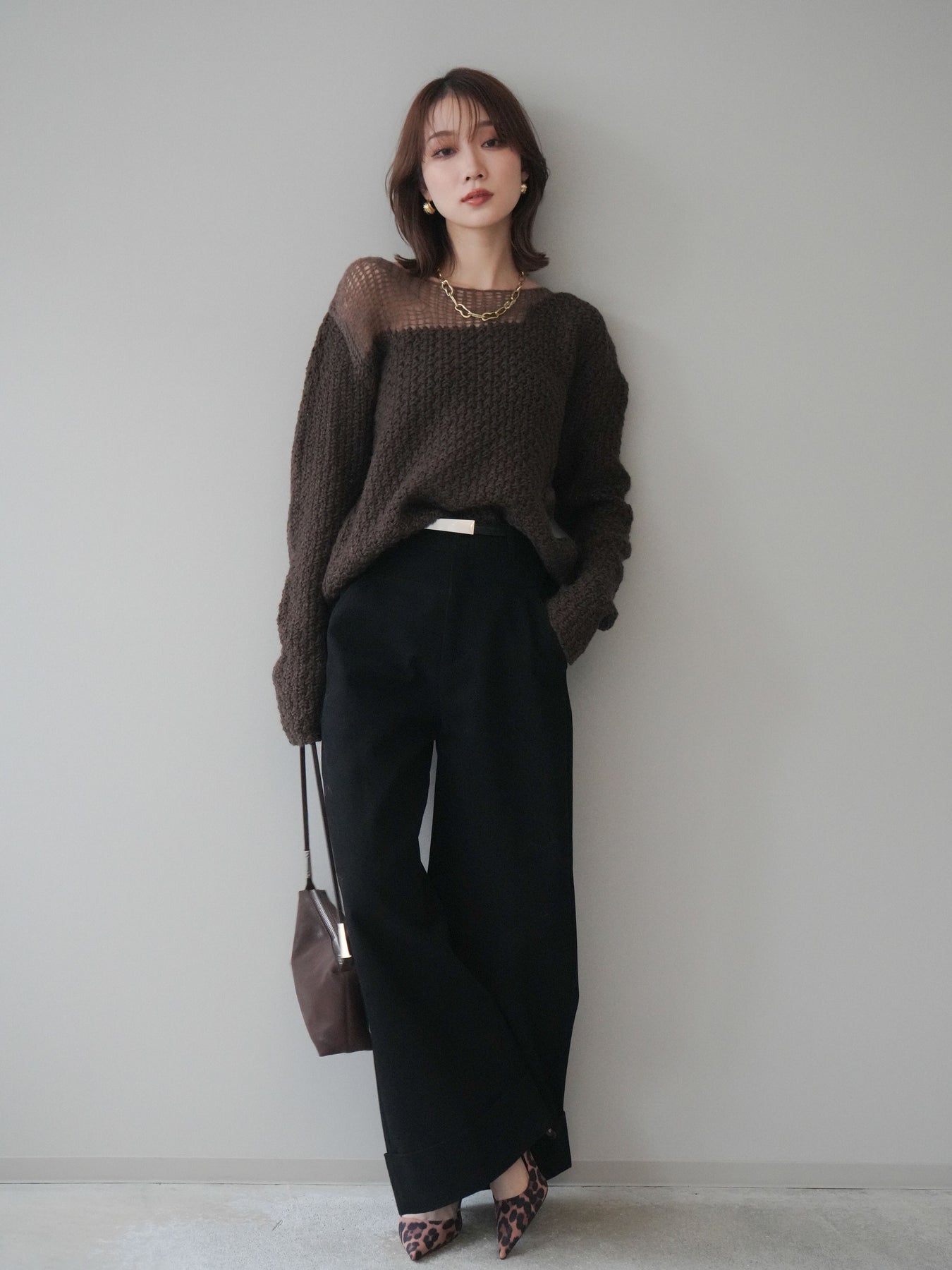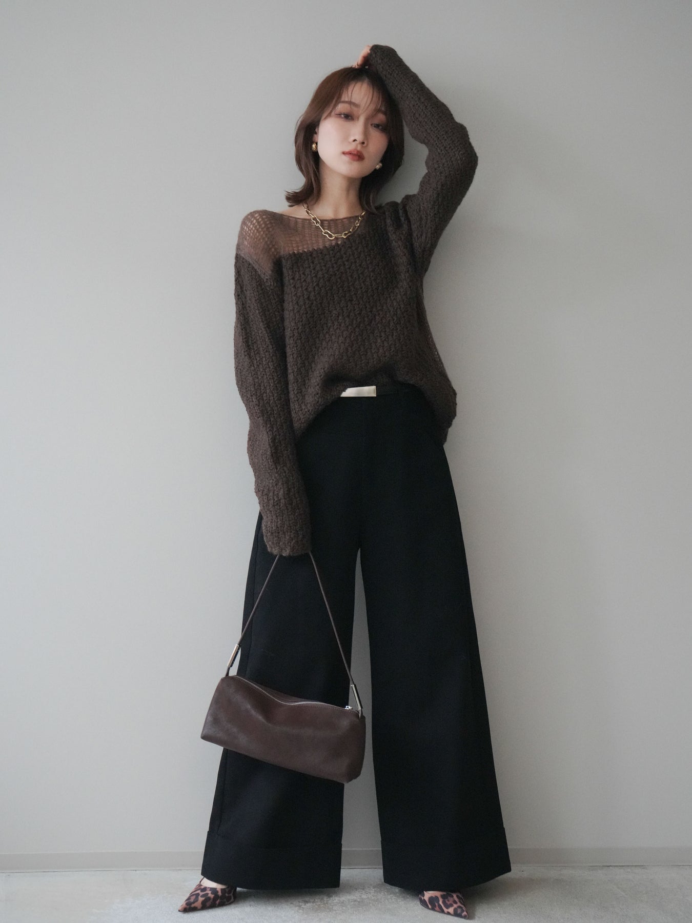 ハリのあるコットンツイル素材を使用したワイドパンツ。 裾の折り返しデザインがポイントになり、シンプルながらも存在感のあるシルエットを演出します。 ウエストには共布のベルトを付け、タックインスタイルもすっきりと決まる仕上がりに。 程よいワイド感で脚のラインを拾わず、スタイルアップ効果も期待できます。 きれいめにもカジュアルにも合わせやすく、オンオフ問わず活躍する万能な1本です。