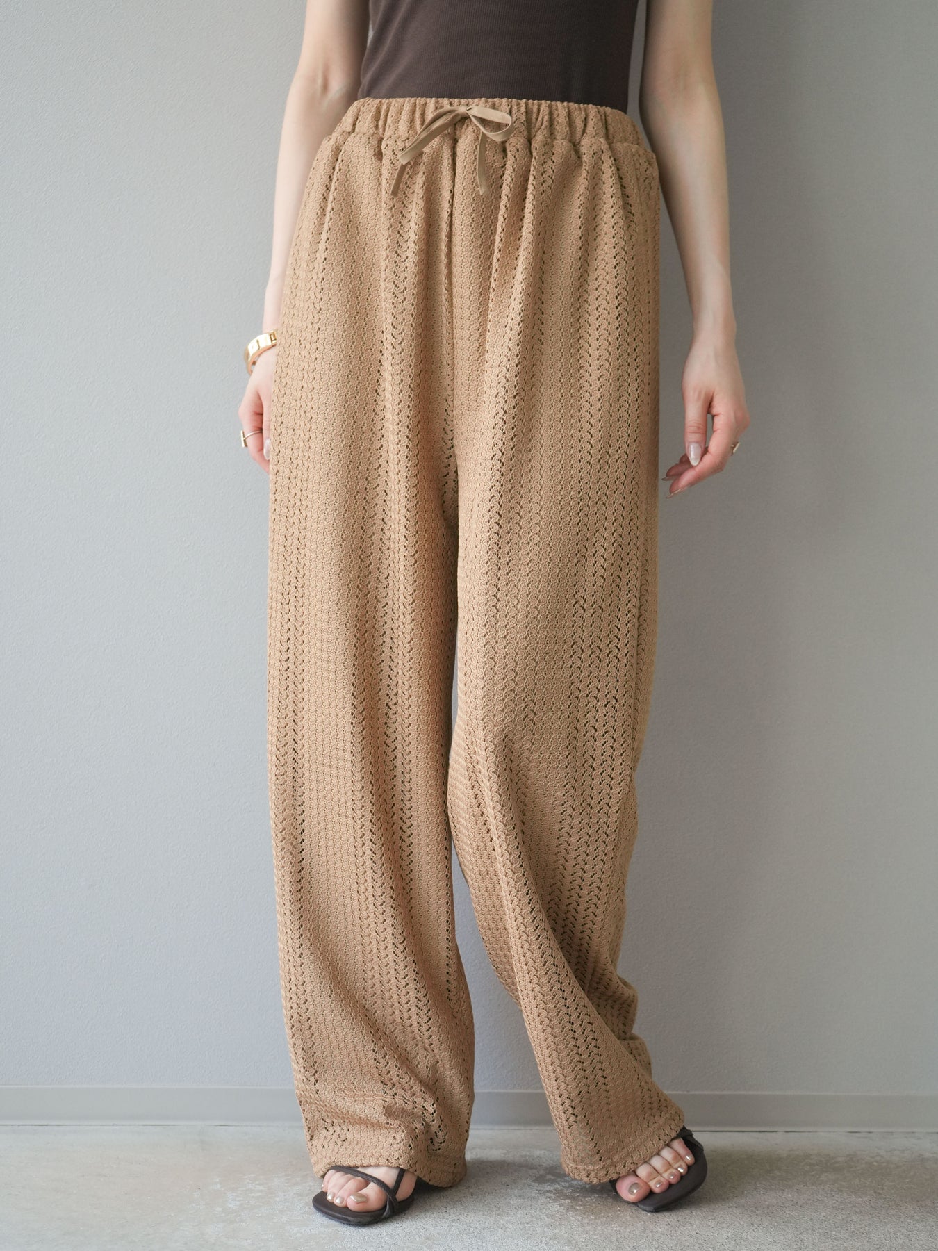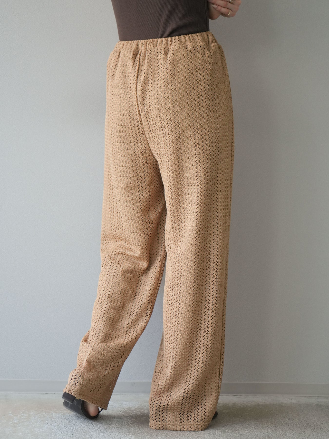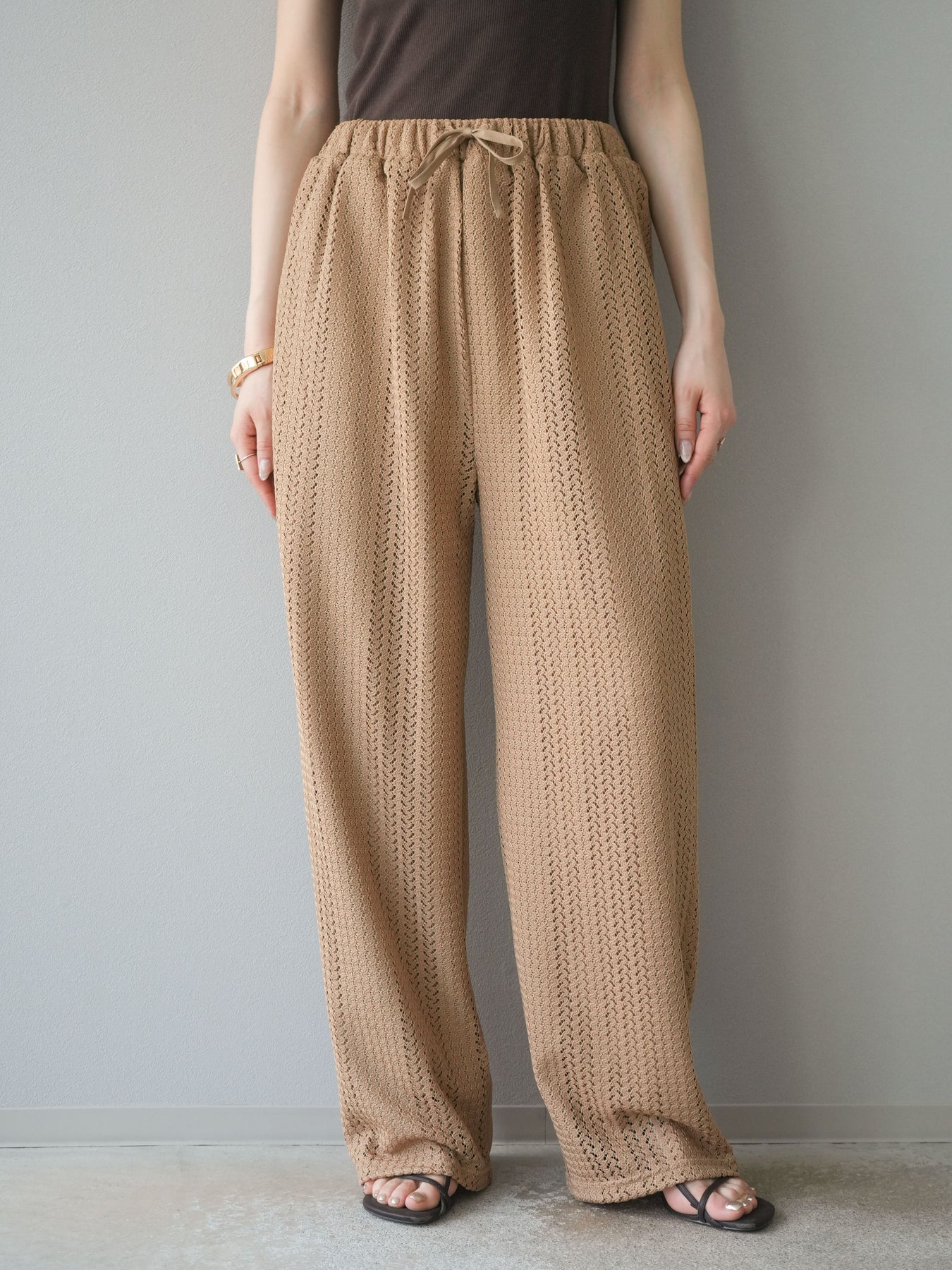軽やかな透かし編みレースが目を惹くワイドパンツ。シアー感たっぷりの涼しげな素材で、夏のレイヤードスタイルにぴったりです。ウエストはゴム仕様で穿き心地も快適。シンプルなトップスと合わせるだけで、旬な抜け感コーデが完成します。リゾートシーンにもおすすめなトレンドアイテムです。 ※ボトムス、キャミソール(インナー)以外の商品は一律でインナーは付属していません