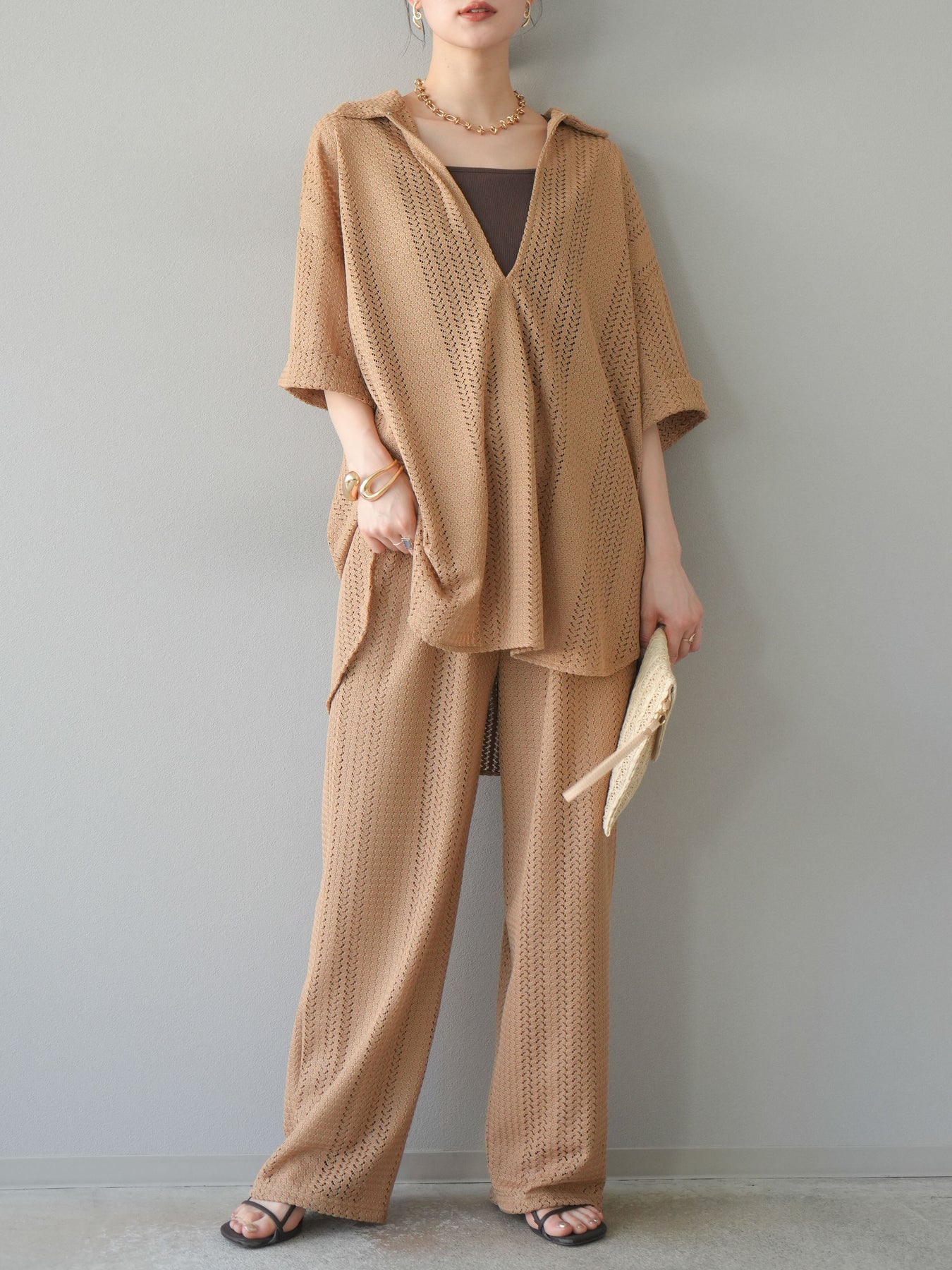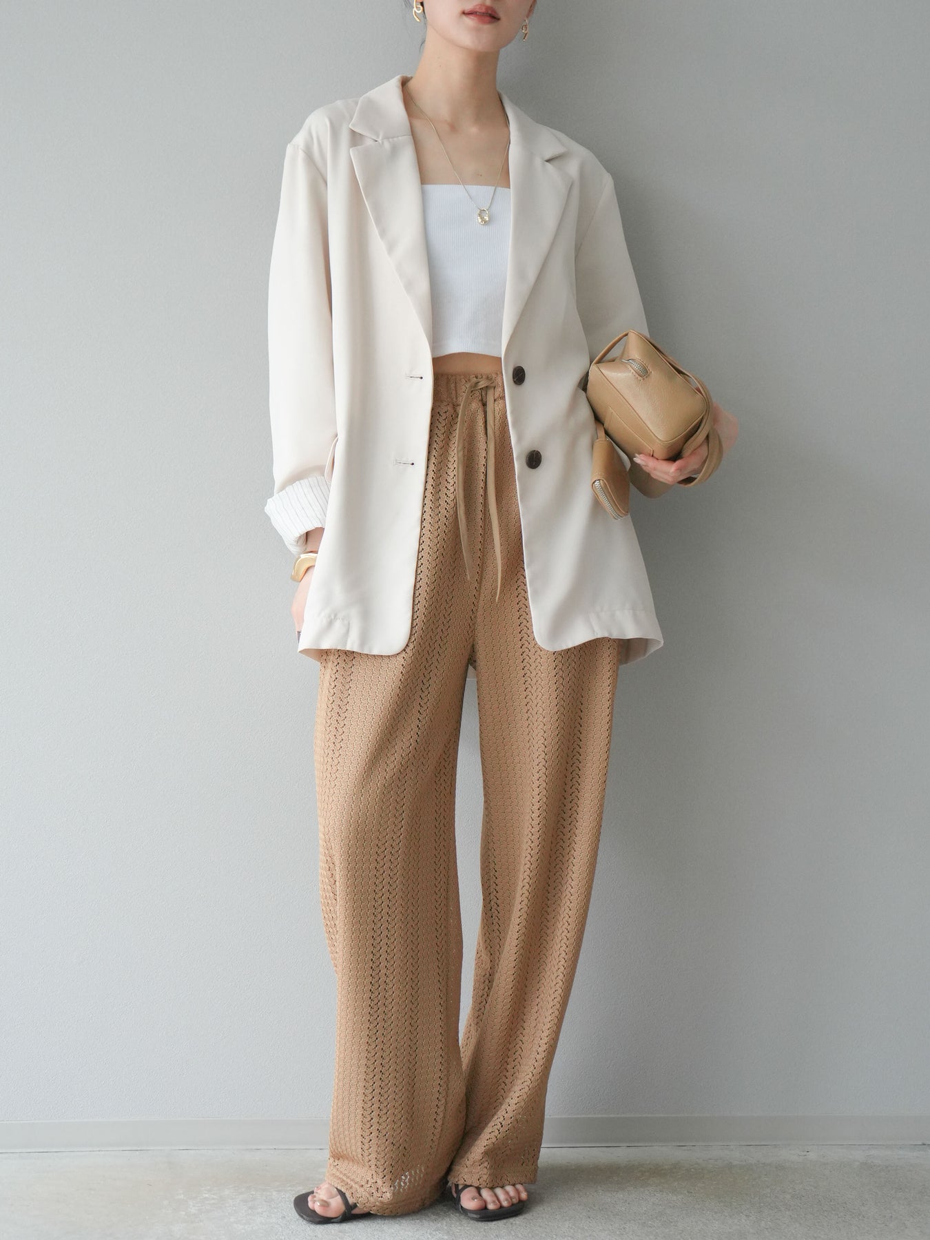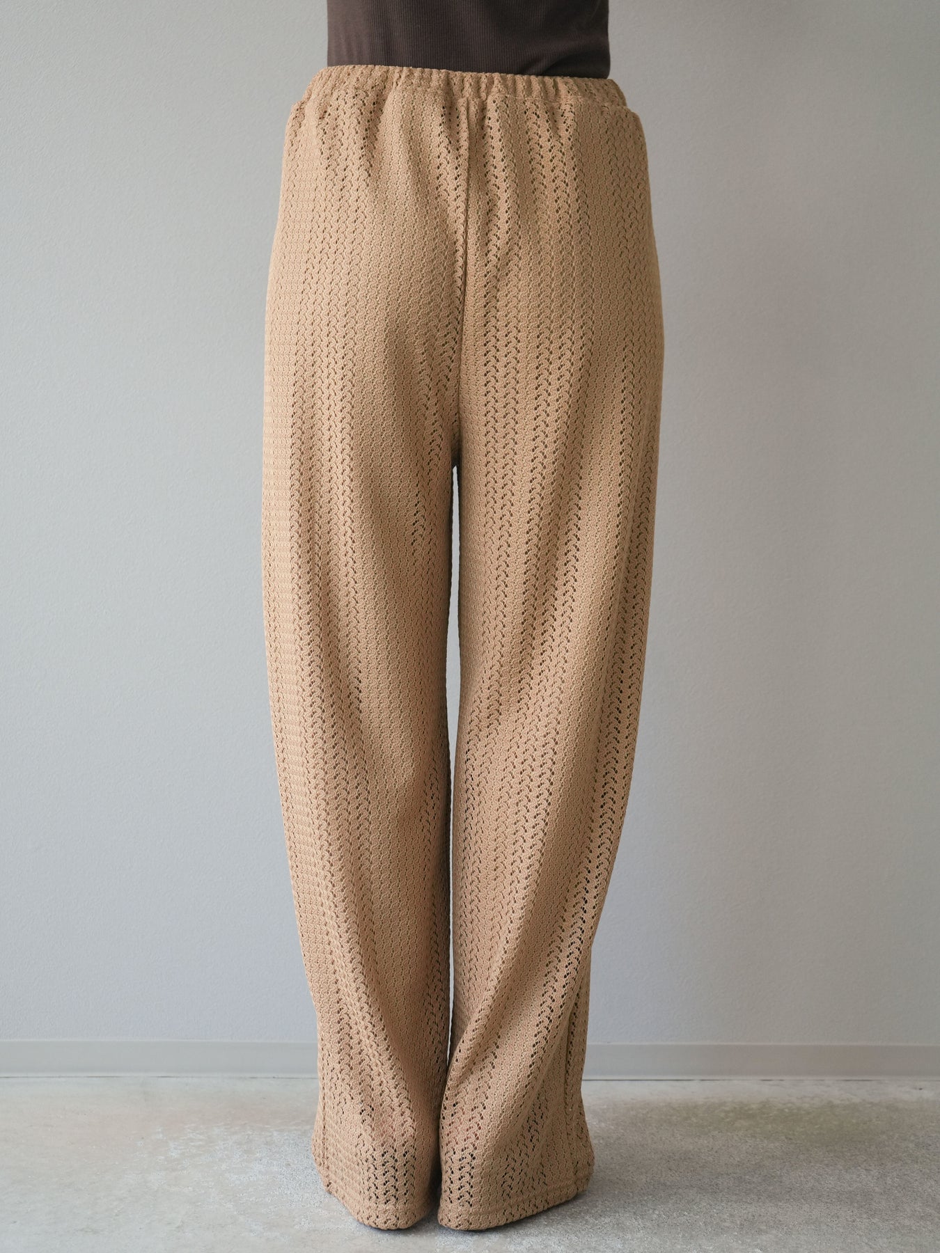 軽やかな透かし編みレースが目を惹くワイドパンツ。シアー感たっぷりの涼しげな素材で、夏のレイヤードスタイルにぴったりです。ウエストはゴム仕様で穿き心地も快適。シンプルなトップスと合わせるだけで、旬な抜け感コーデが完成します。リゾートシーンにもおすすめなトレンドアイテムです。 ※ボトムス、キャミソール(インナー)以外の商品は一律でインナーは付属していません