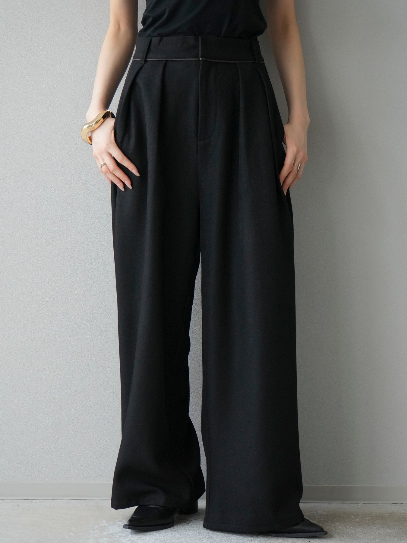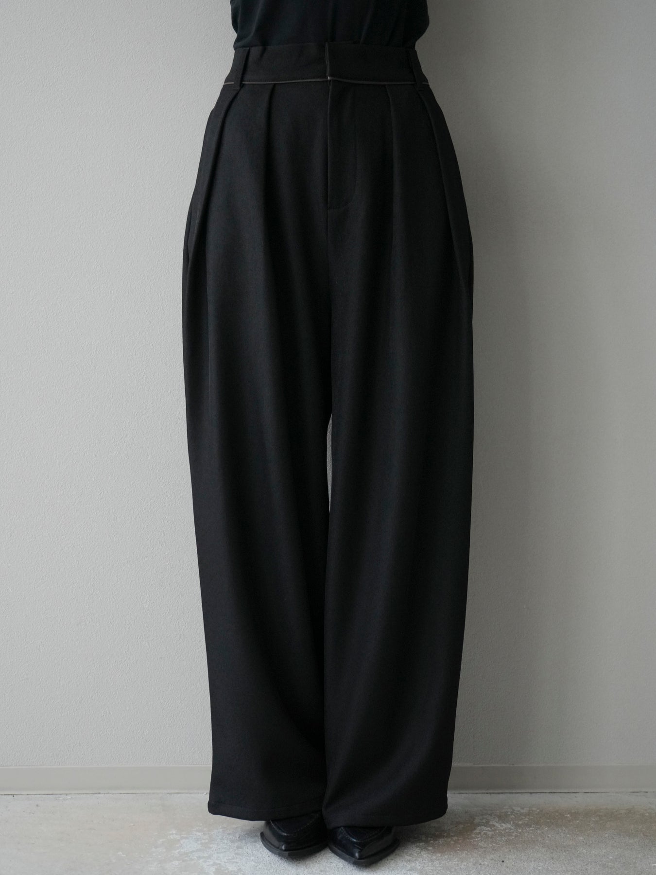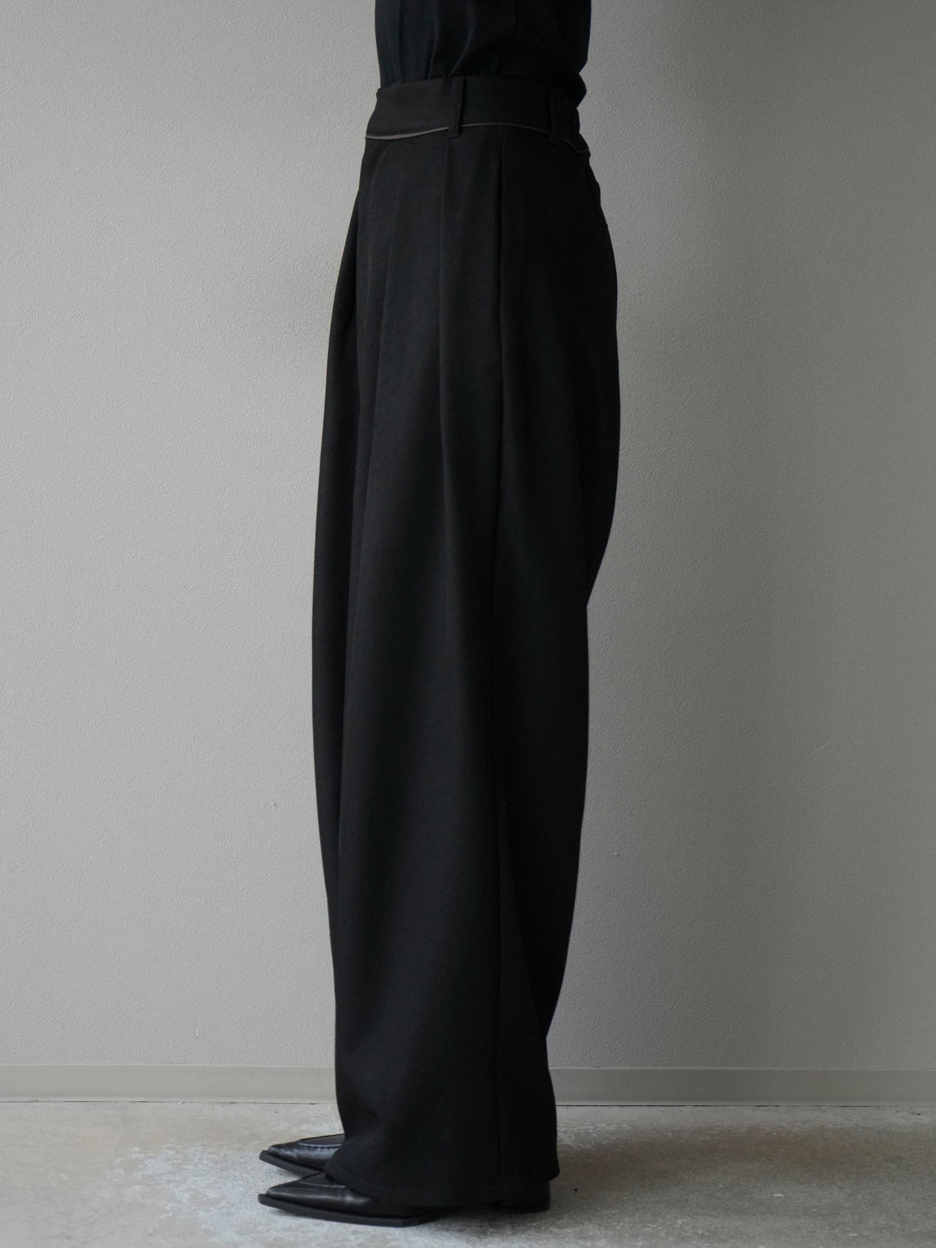 [予約]レザーパイピングタックワイドパンツ/ブラック