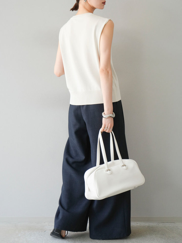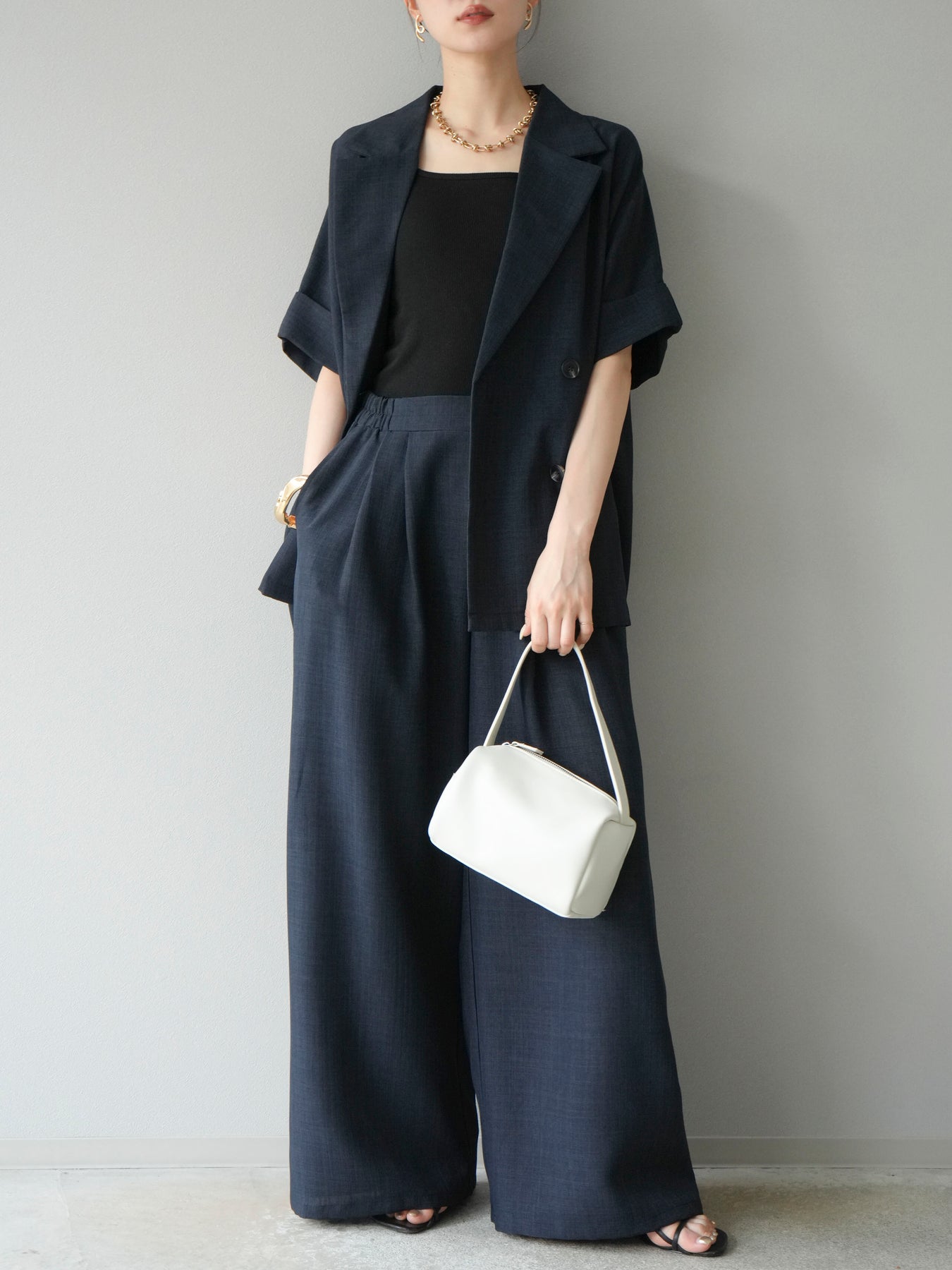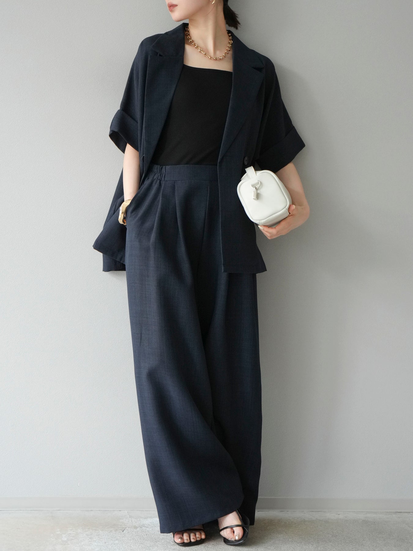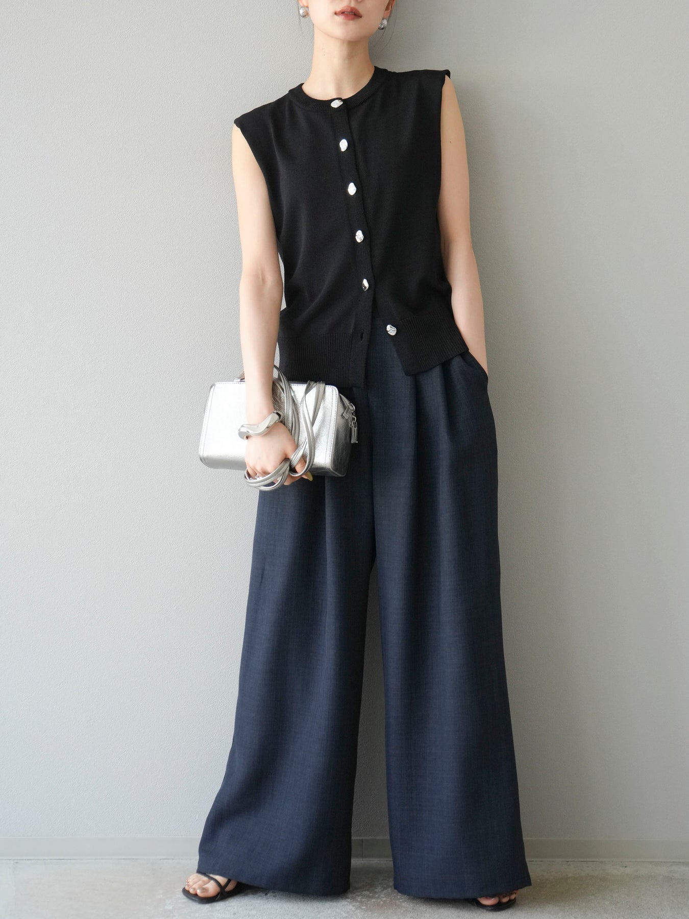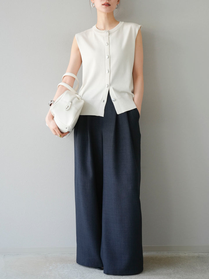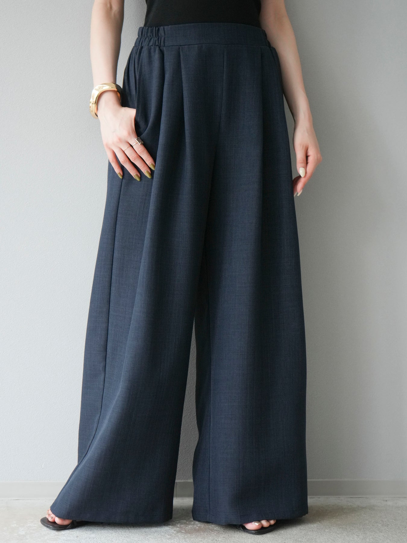 さらりとした肌触りとナチュラルな風合いが魅力の、リネンライク素材を使用したワイドパンツ。 上品な落ち感と程よいハリのあるシルエットで、リラックス感がありながらもきちんと見えを叶えてくれます。 ウエストは総ゴム仕様でストレスフリーな穿き心地。 ワイドすぎない絶妙なボリューム感で、脚のラインを美しくカバーしてくれるのも嬉しいポイントです。 Tシャツやブラウス、ノースリーブなど、合わせるトップスを選ばず幅広く着回し可能。 オフィスにもデイリーにも対応できる、洗練された大人のための一本です。