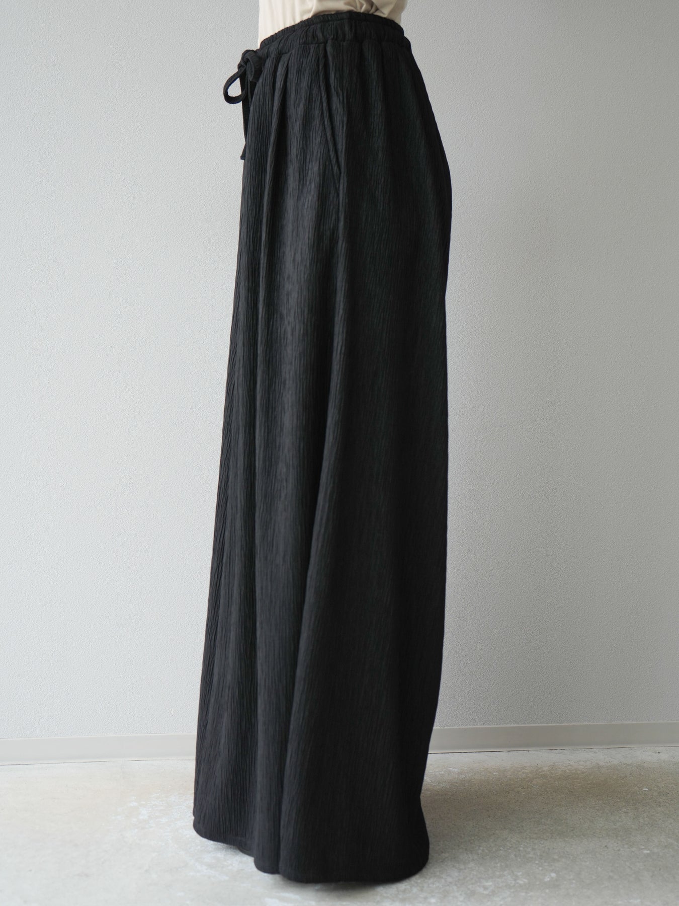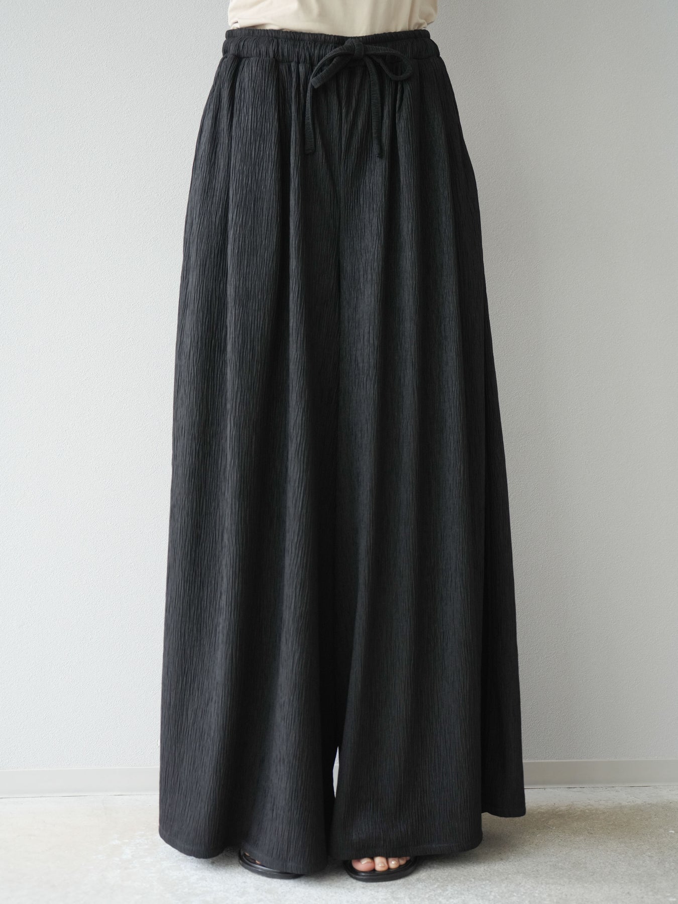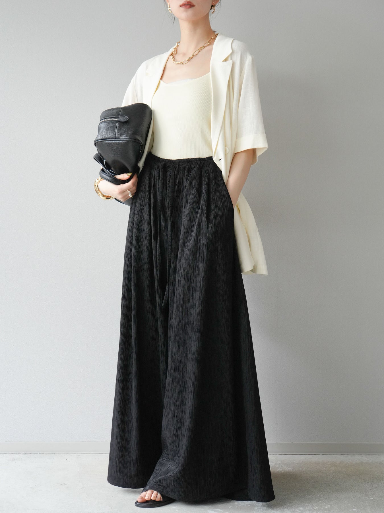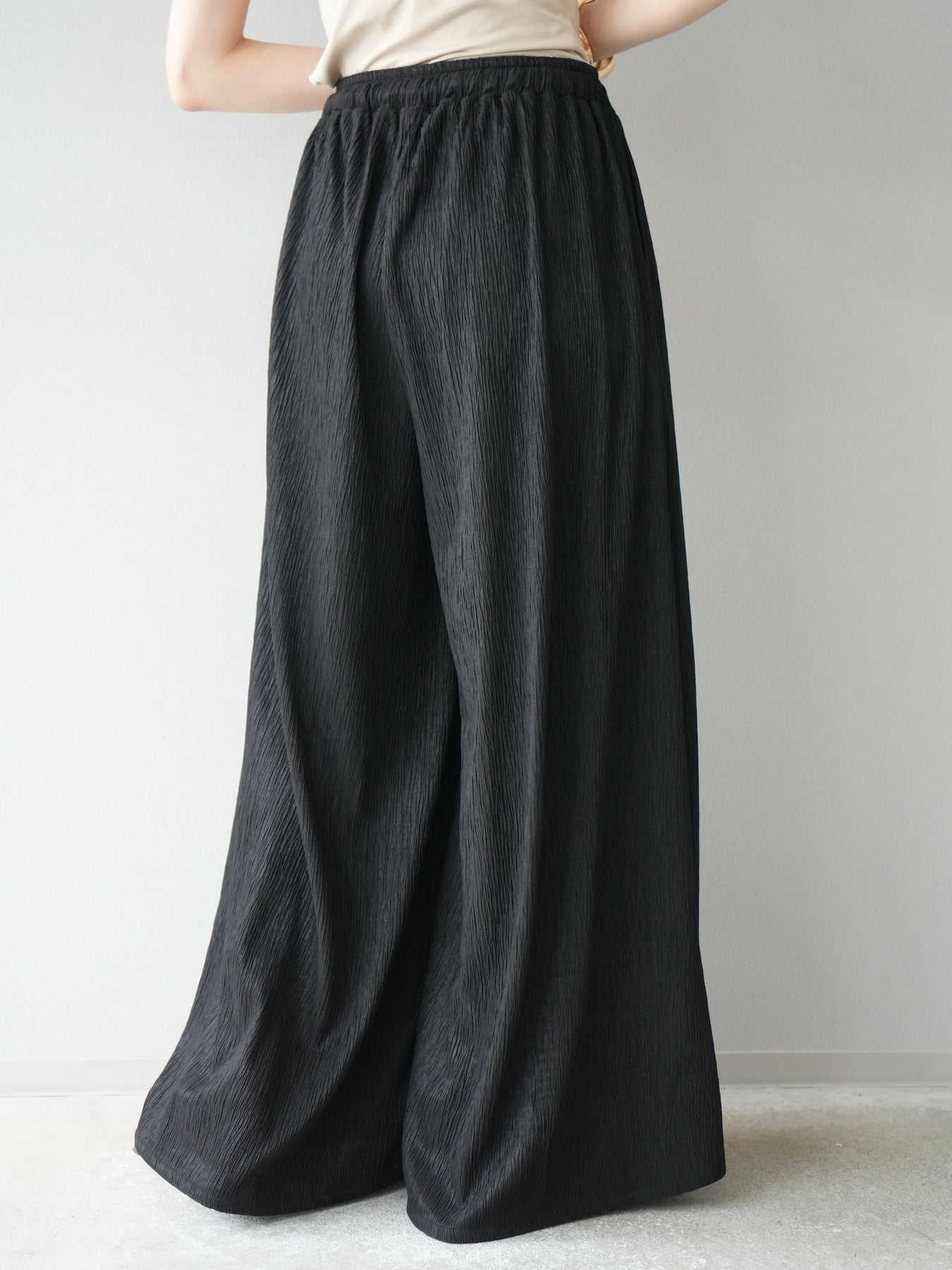 凹凸感のある表面が特徴の楊柳素材を使用した、涼しげな風合いのバギーパンツ。柔らかく軽やかな履き心地で、暑い季節にも快適に着用できます。 ウエストは総ゴム+ドローストリング仕様でリラクシーなフィット感。たっぷりと生地を使ったボリューム感のあるワイドシルエットが、動くたびに揺れ、抜け感のあるスタイルを演出します。 シンプルなトップスを合わせるだけで存在感のある着こなしが完成する、デイリーに活躍する1本です。