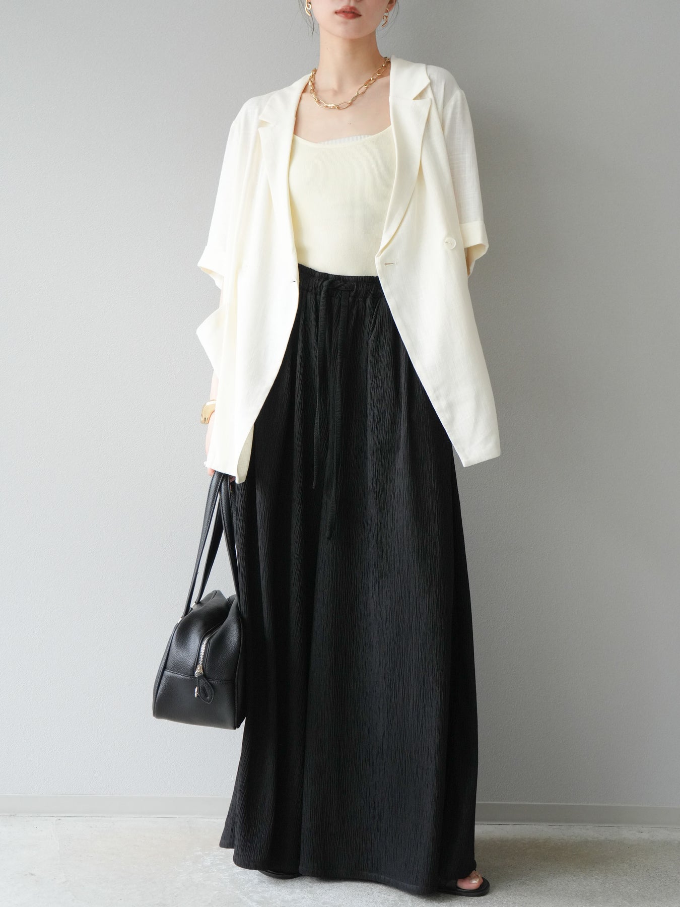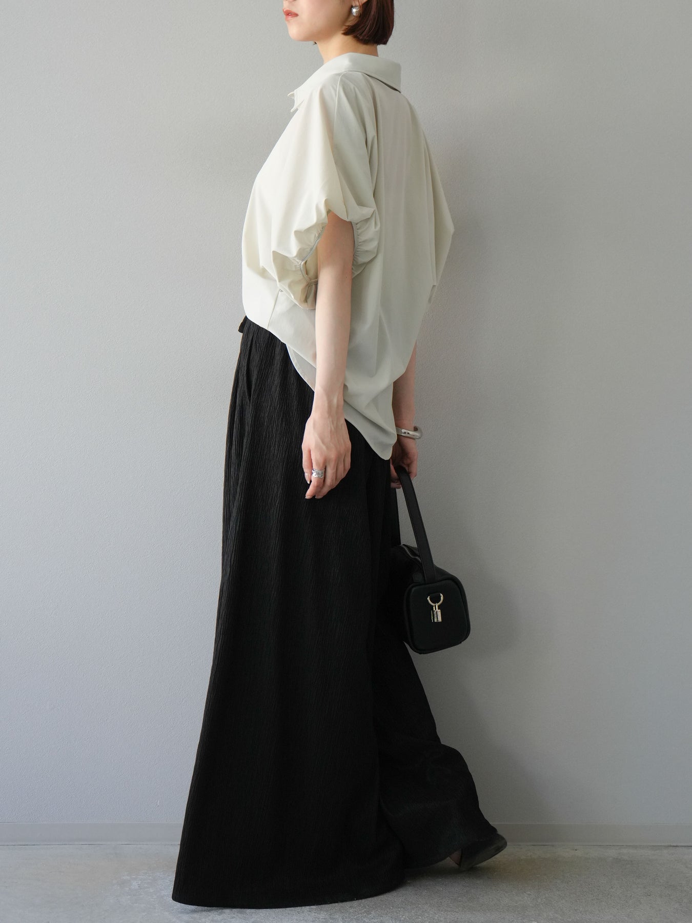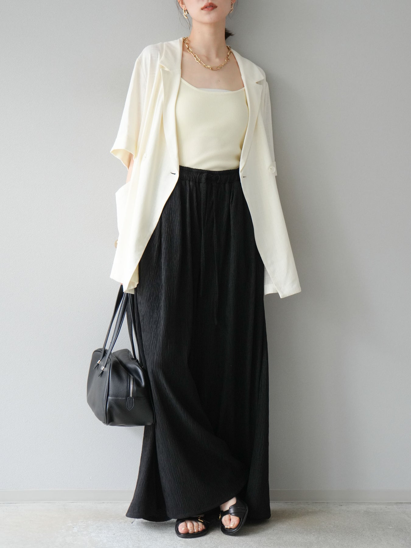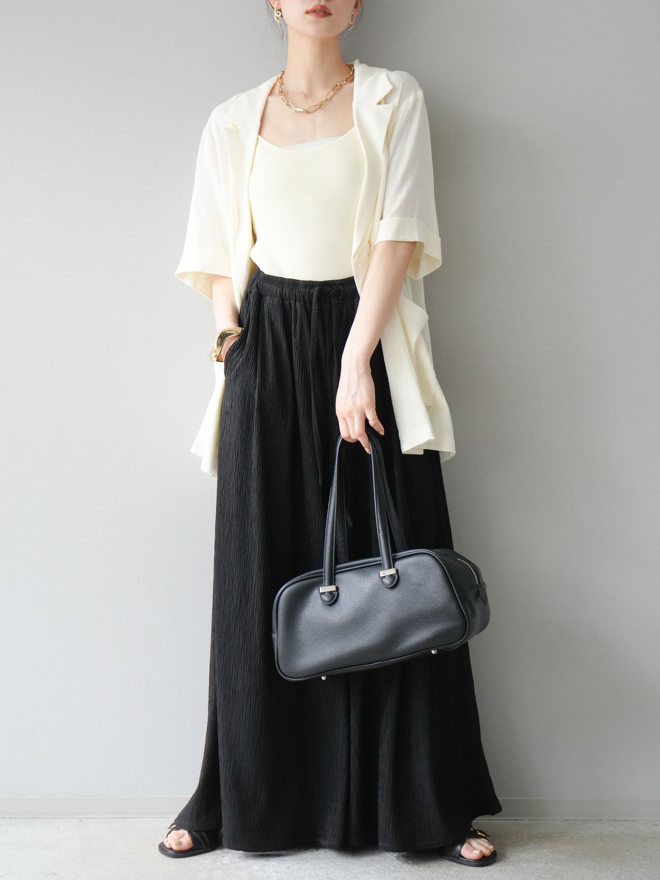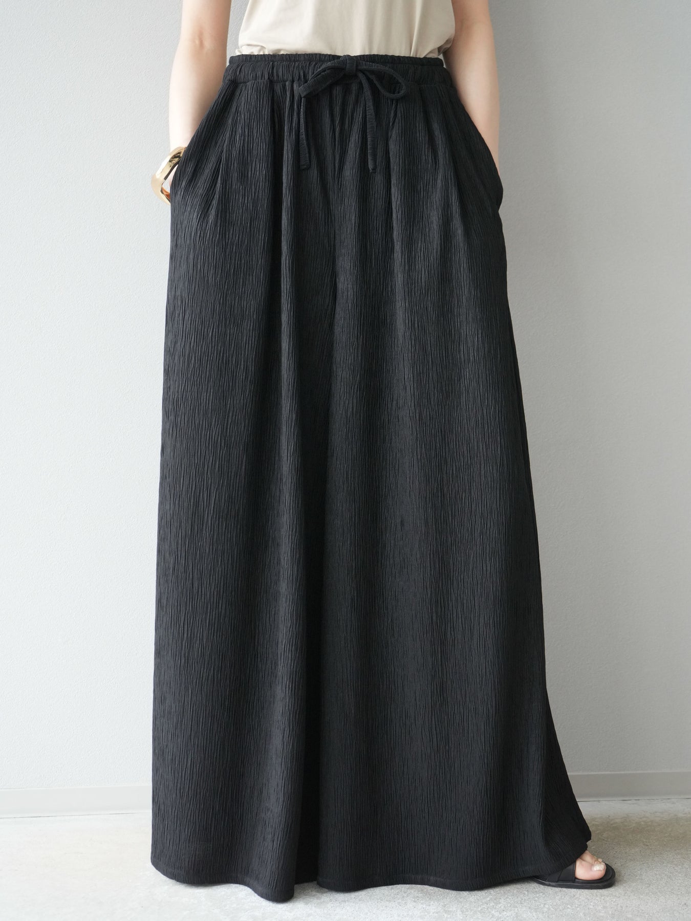 凹凸感のある表面が特徴の楊柳素材を使用した、涼しげな風合いのバギーパンツ。柔らかく軽やかな履き心地で、暑い季節にも快適に着用できます。 ウエストは総ゴム+ドローストリング仕様でリラクシーなフィット感。たっぷりと生地を使ったボリューム感のあるワイドシルエットが、動くたびに揺れ、抜け感のあるスタイルを演出します。 シンプルなトップスを合わせるだけで存在感のある着こなしが完成する、デイリーに活躍する1本です。